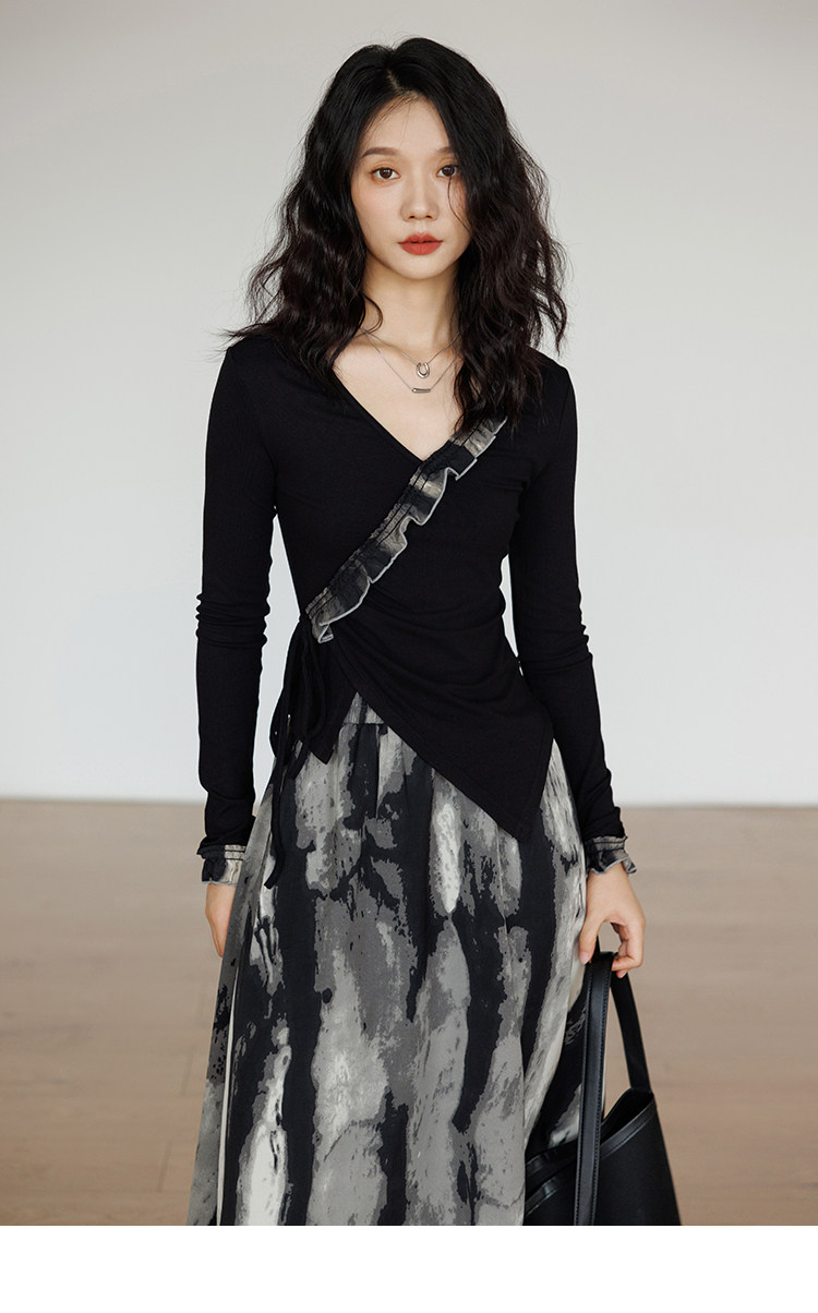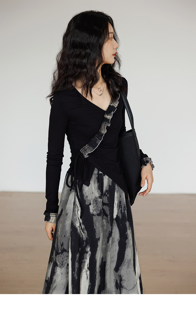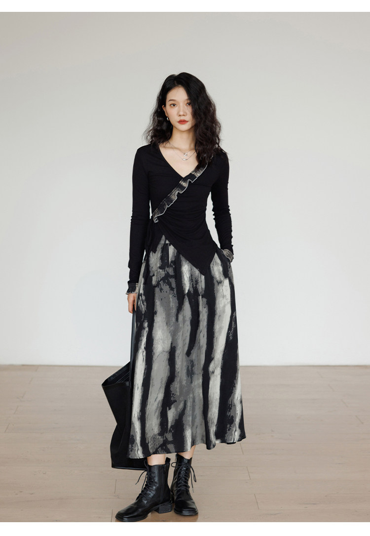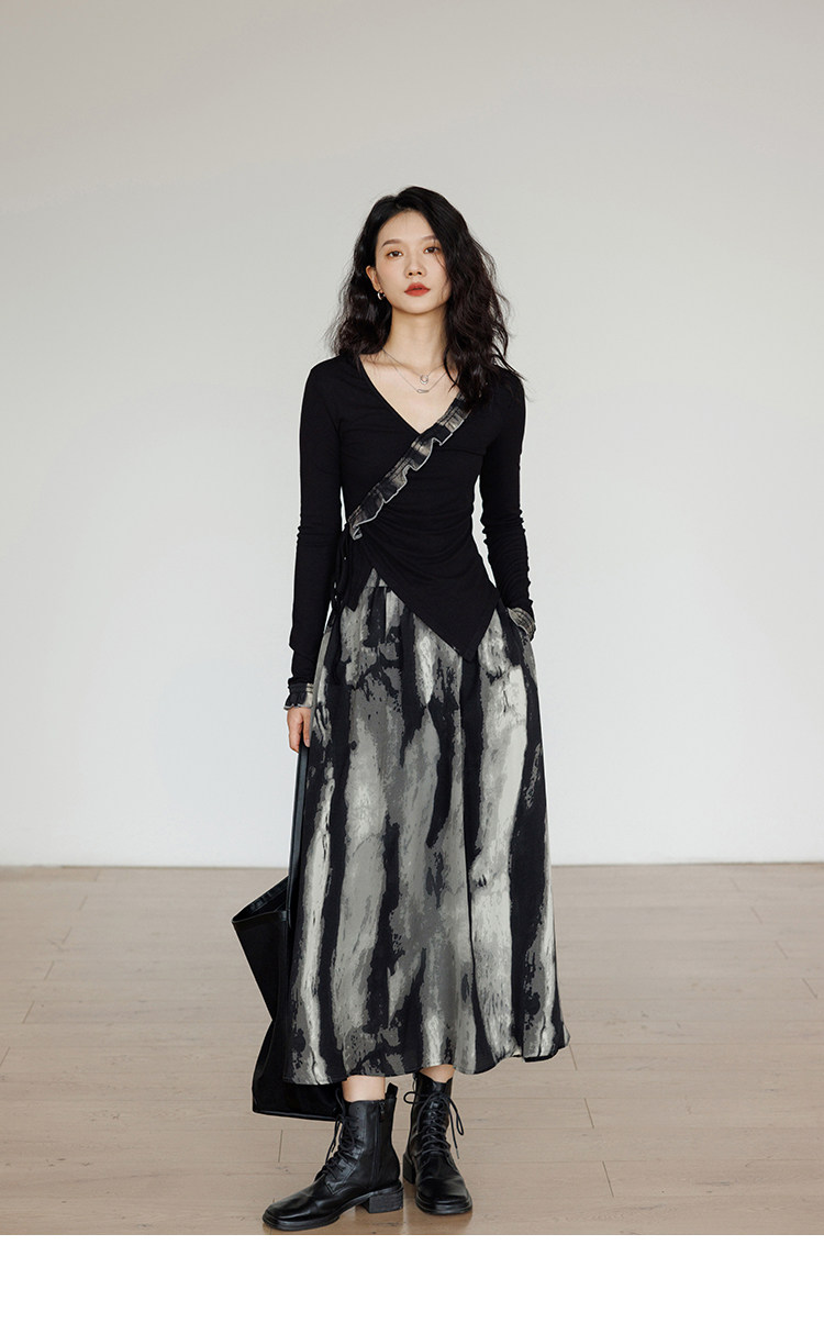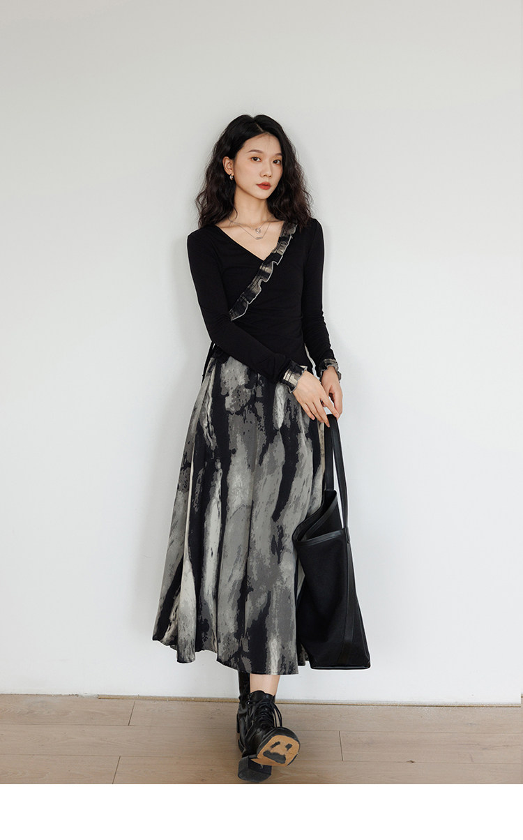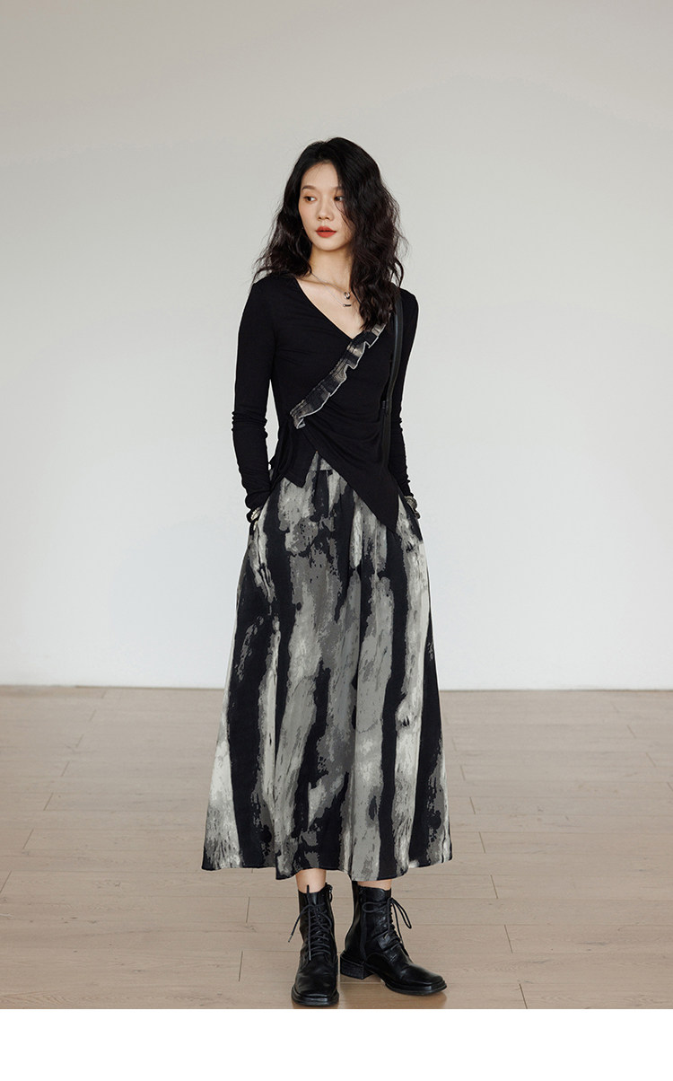 靜奢藝術感套裝|交叉V領設計長袖 + 水墨畫半身裙|清冷系層次兩件組