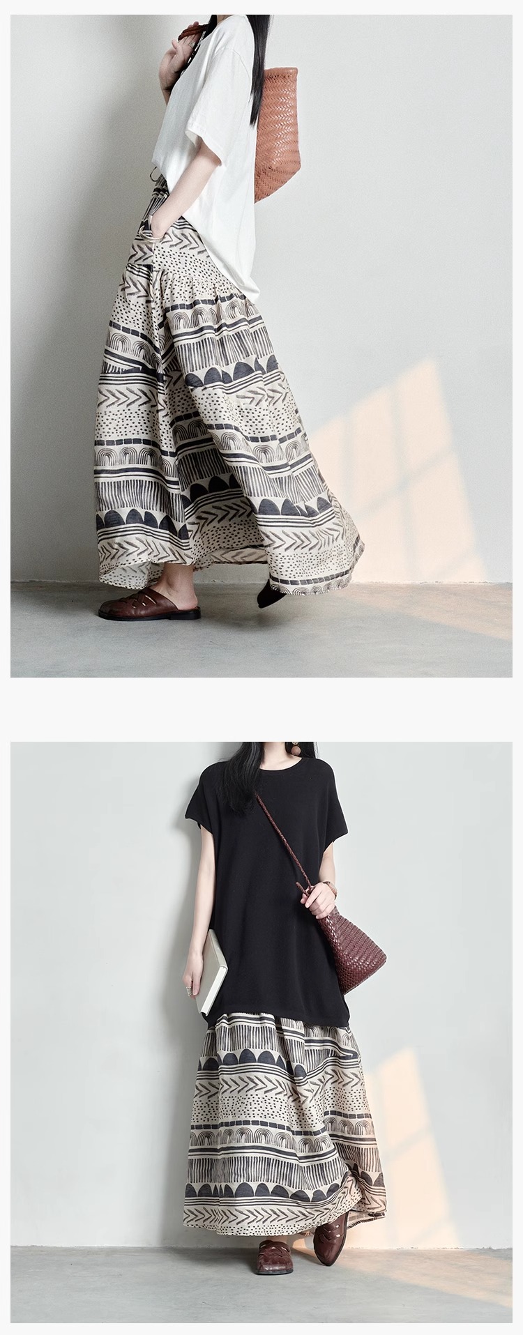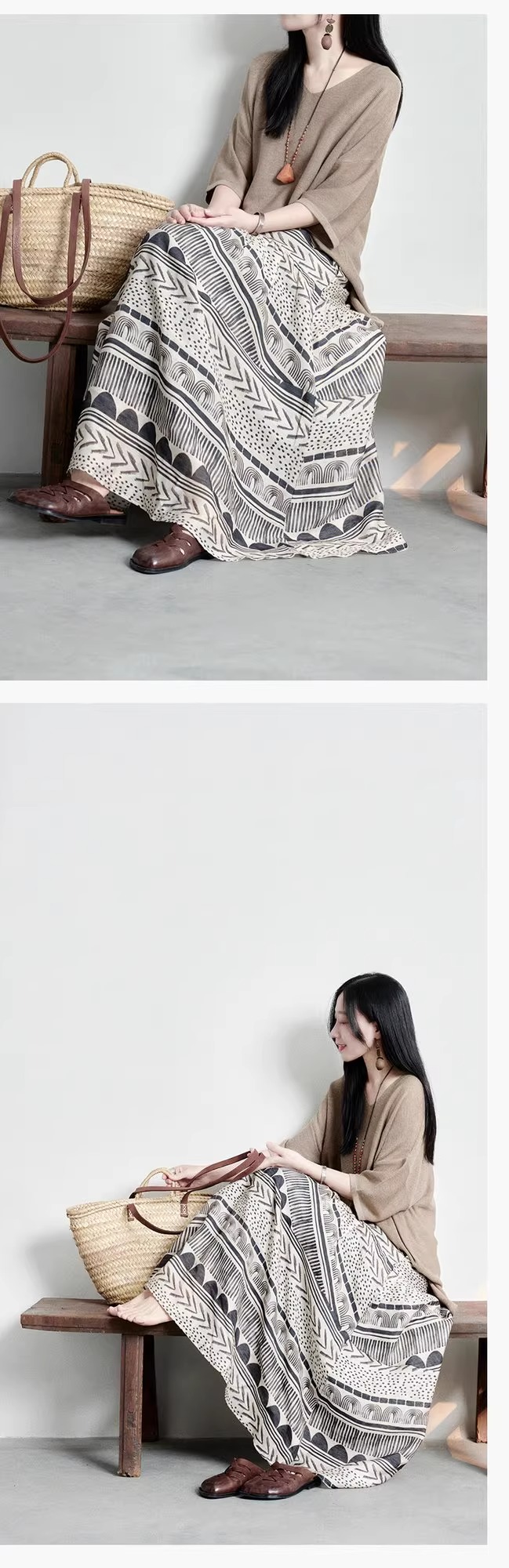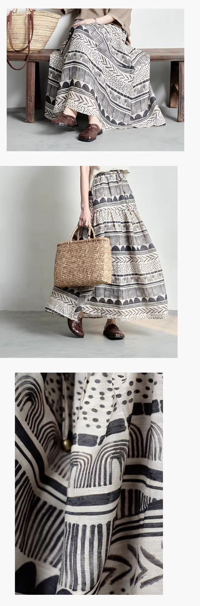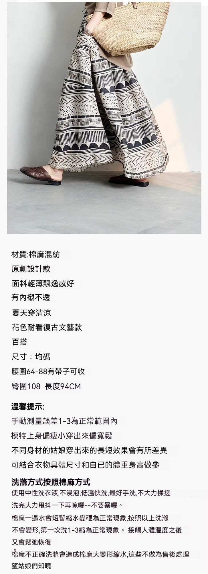 復古印花A字裙|棉麻混紡垂墜面料|高腰修飾小腹|文藝風大擺設計