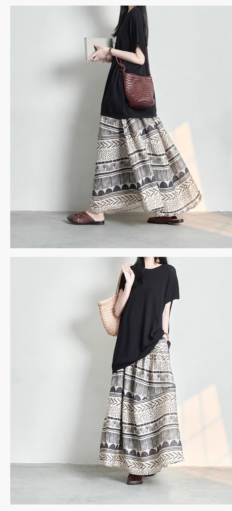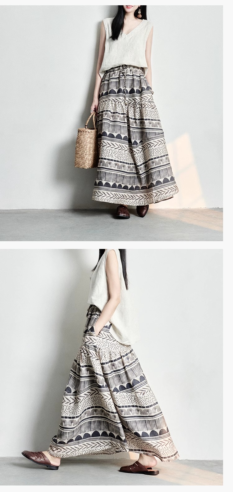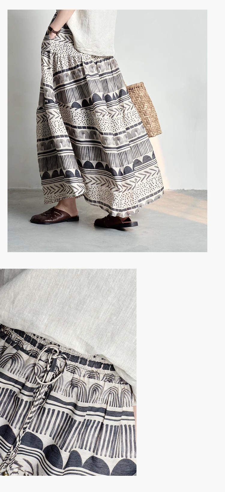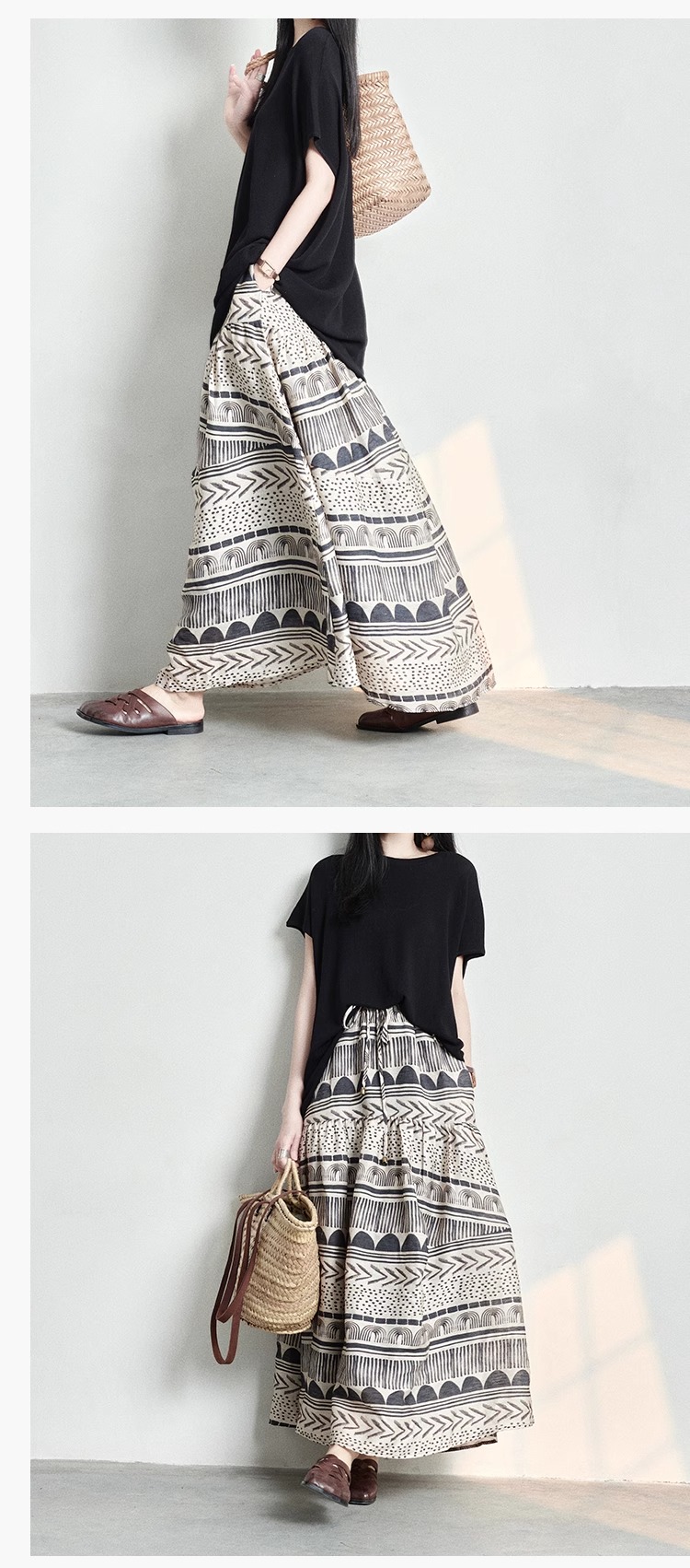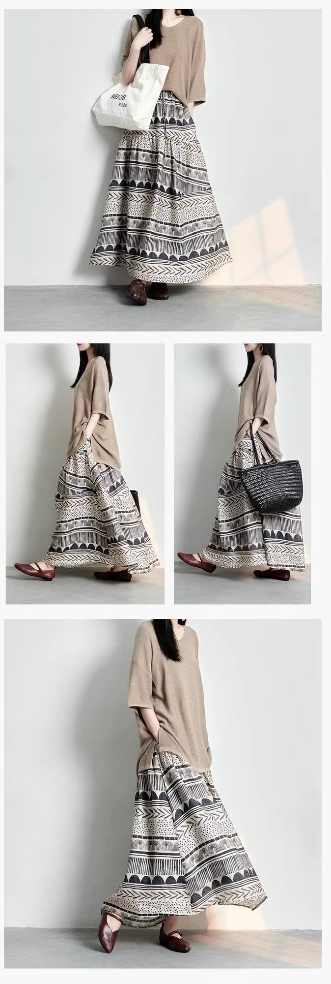 復古印花A字裙|棉麻混紡垂墜面料|高腰修飾小腹|文藝風大擺設計