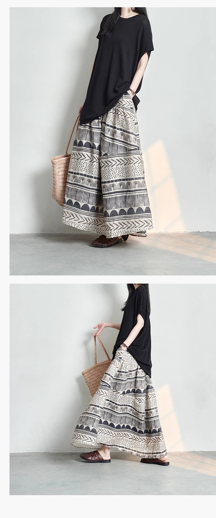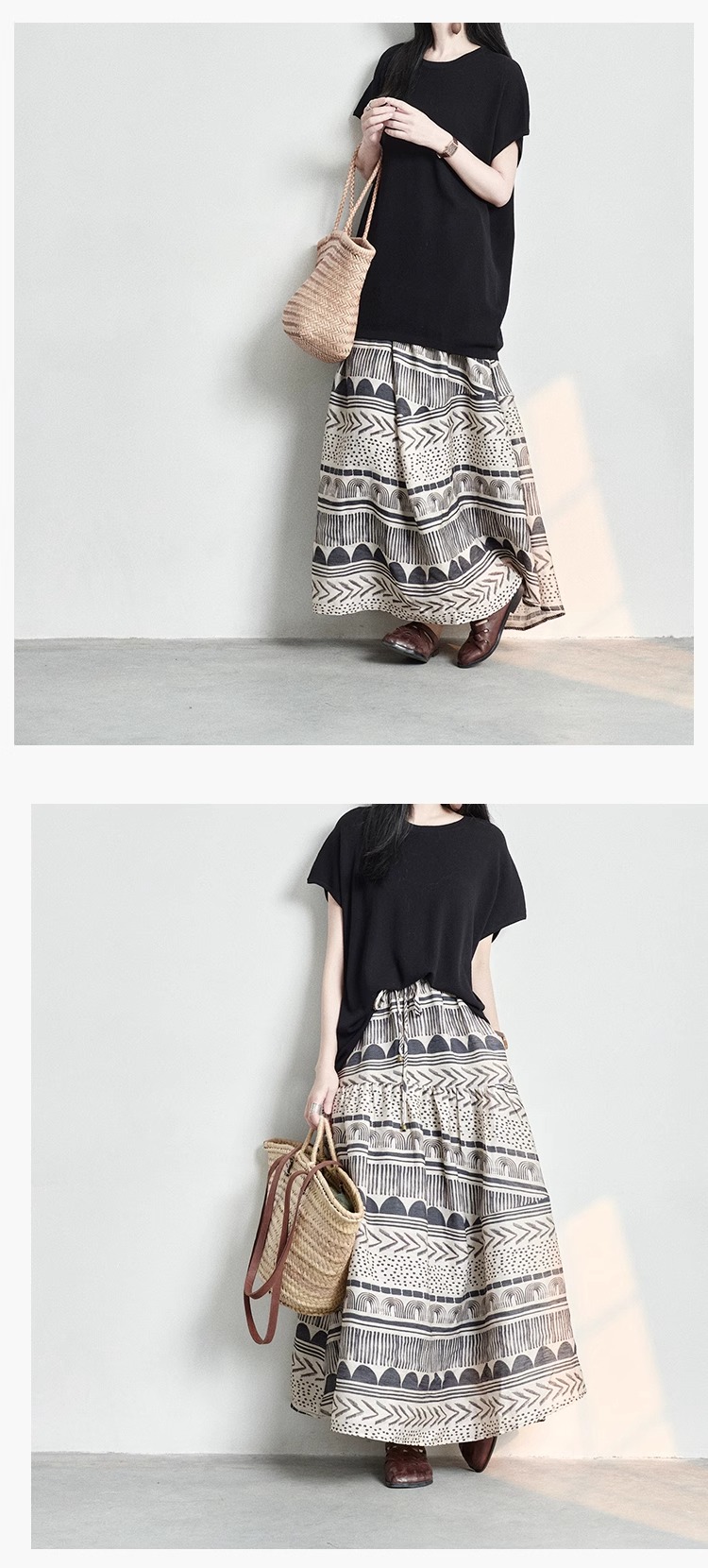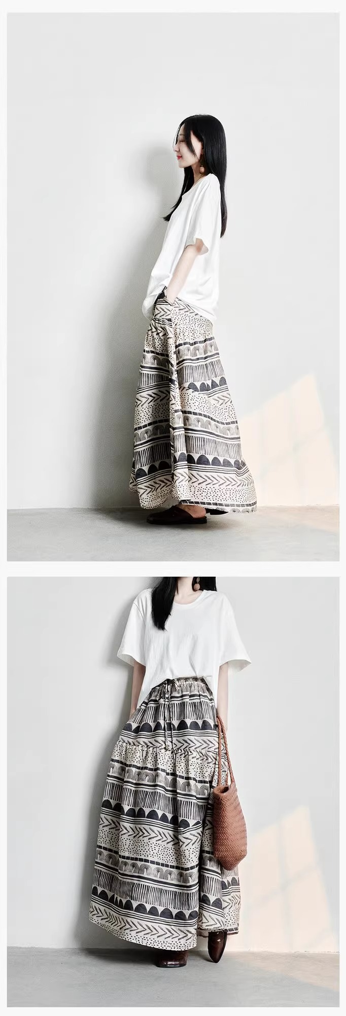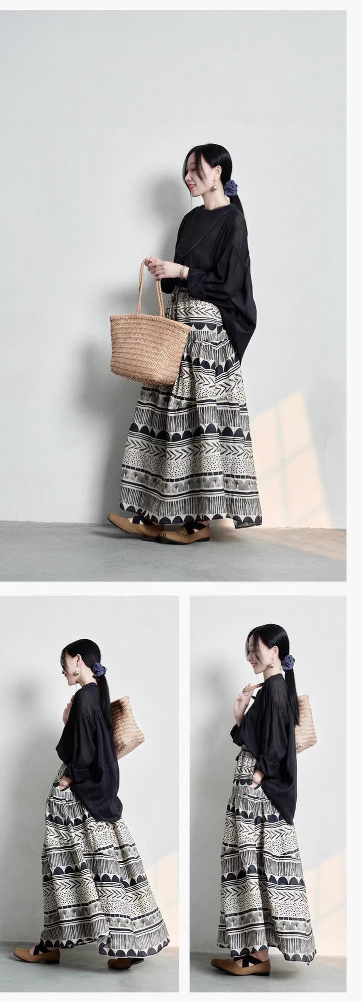 復古印花A字裙|棉麻混紡垂墜面料|高腰修飾小腹|文藝風大擺設計