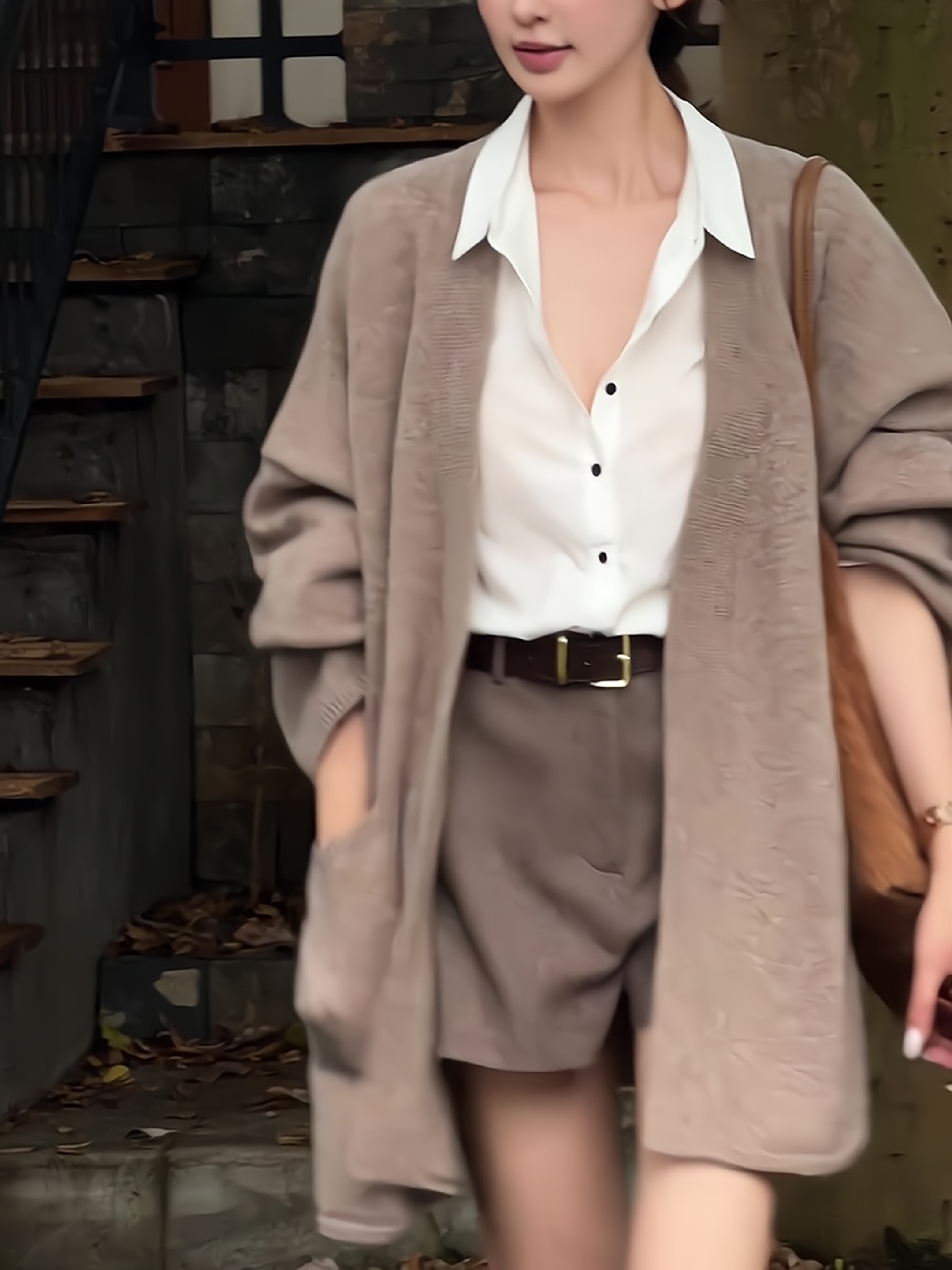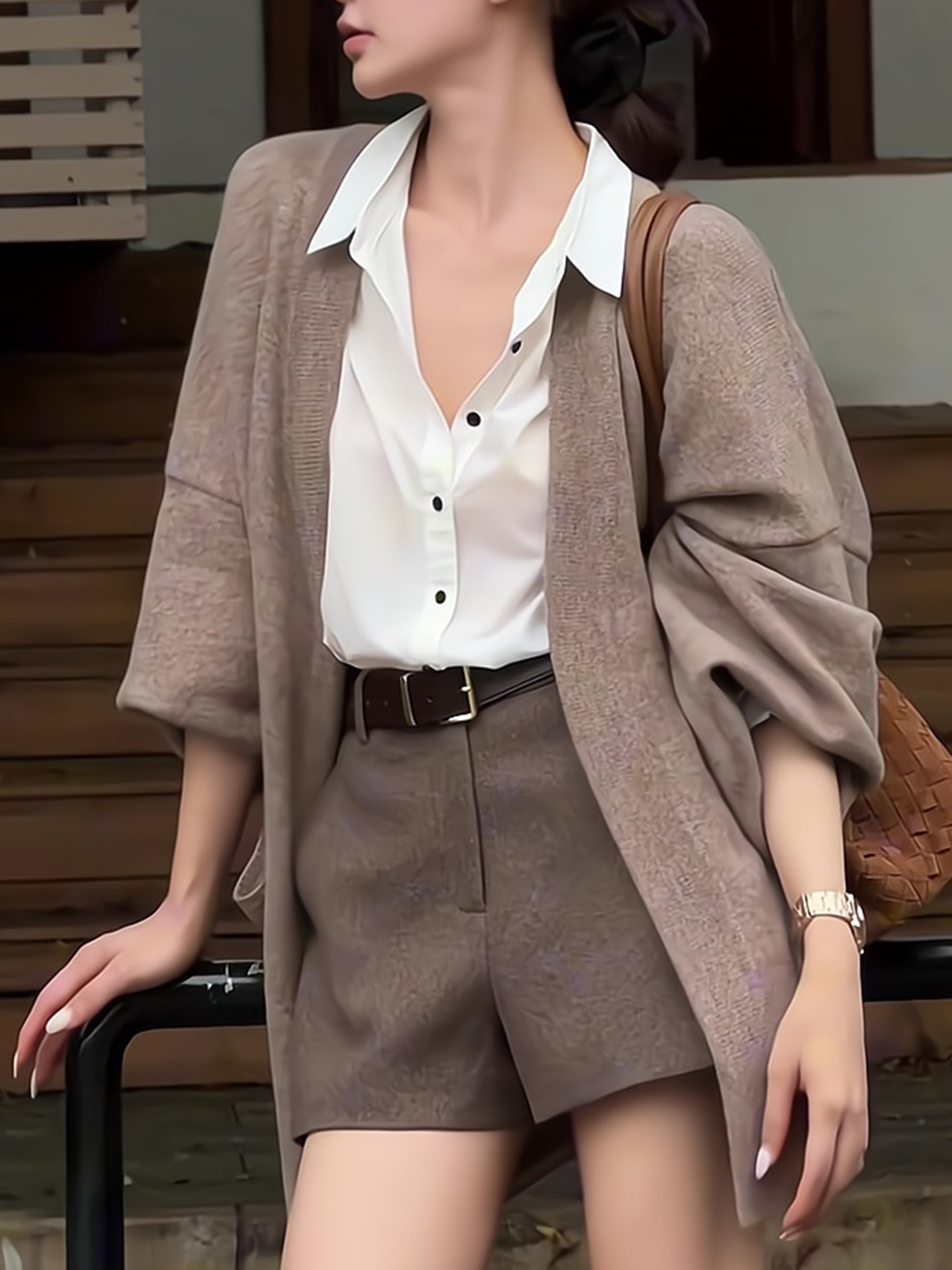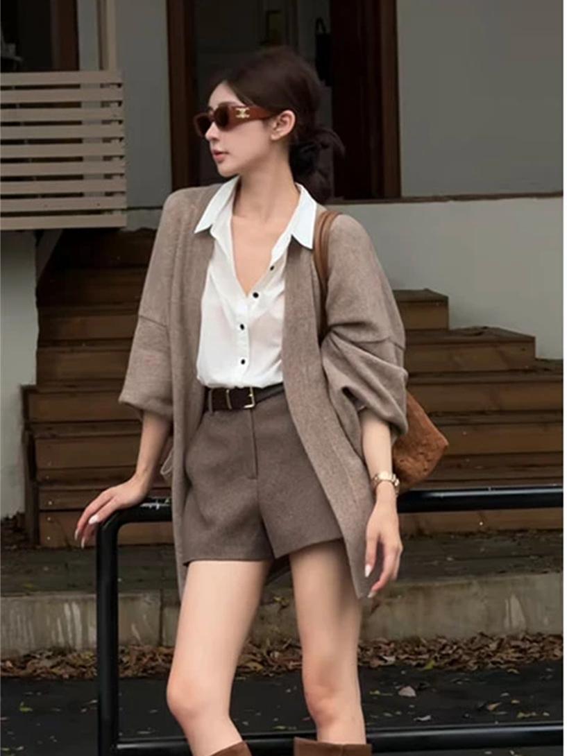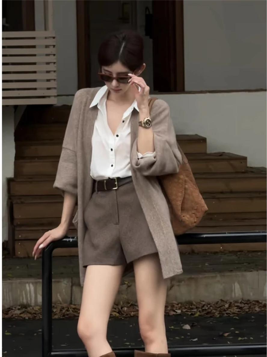 時尚老錢風三件套|淺咖針織開衫 | 白色襯衫|咖色短褲|秋季質感穿搭