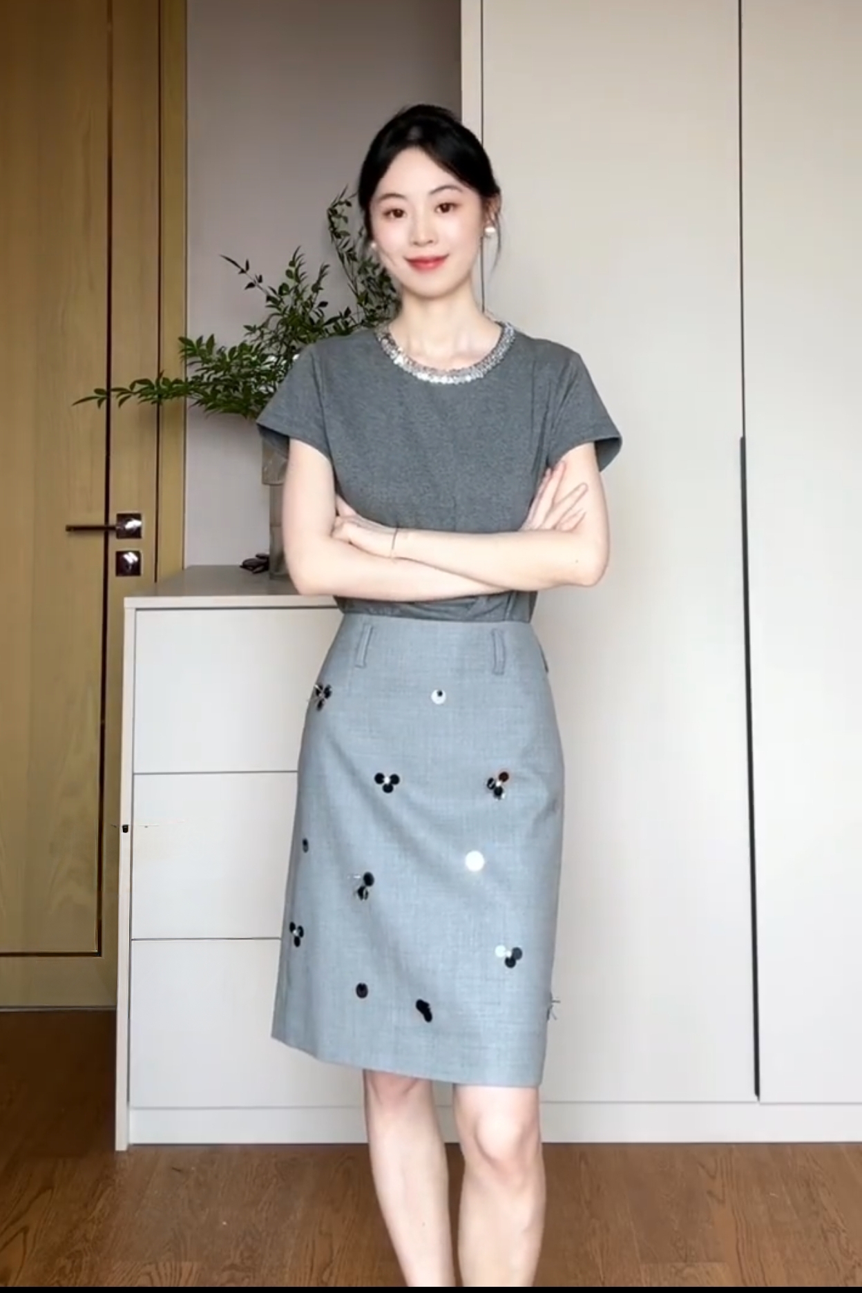 小眾設計亮片圓領灰色上衣 灰色半身裙 OL通勤 夏季高級格雷係