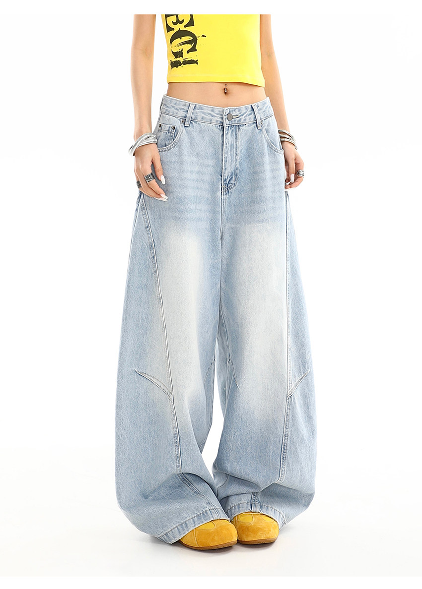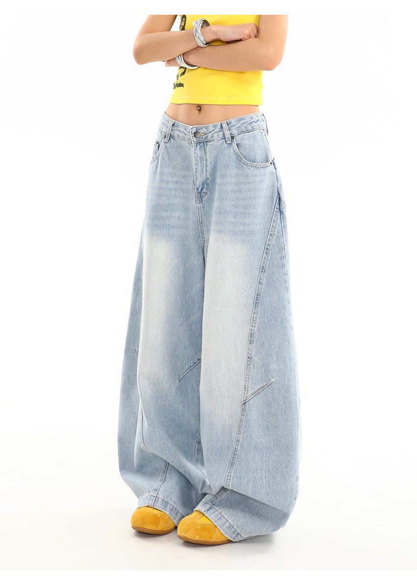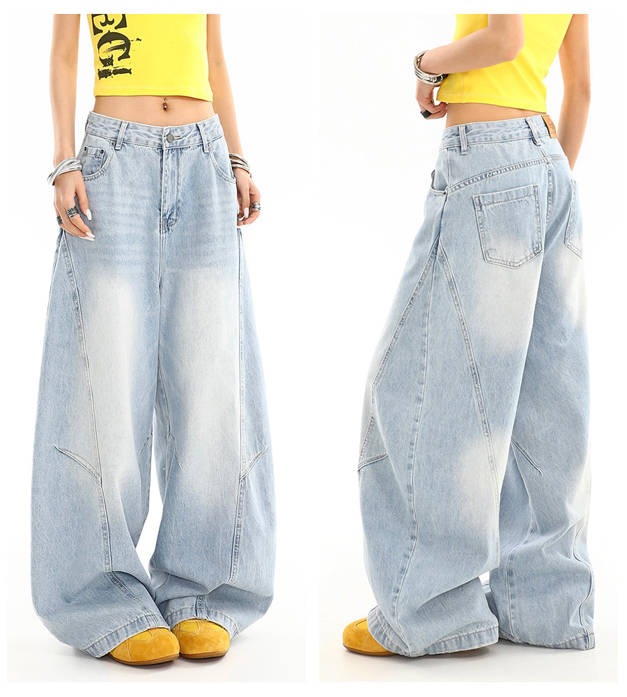 【限量】美式復古彎刀牛仔褲|淺色直筒闊腿拖地褲|寬鬆休閒設計感長褲