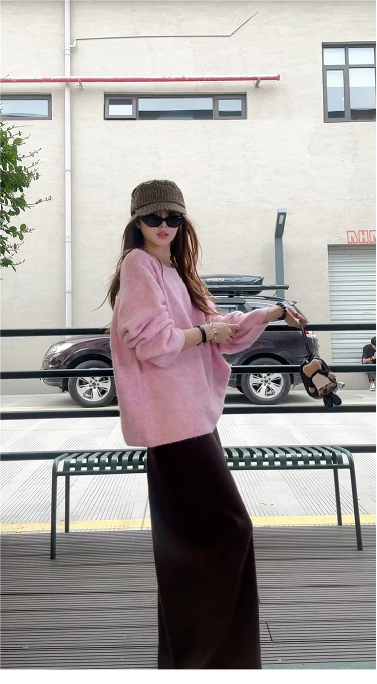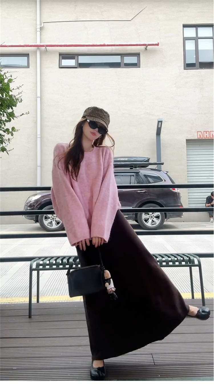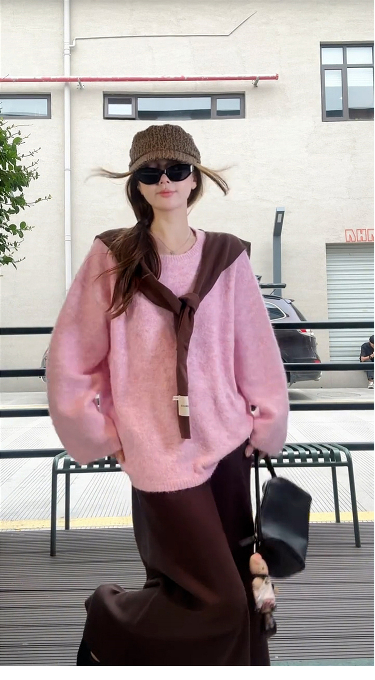 溫柔韓系粉咖套裝 | 深咖半裙 | 粉色圓領寬鬆針織上衣(贈披肩)