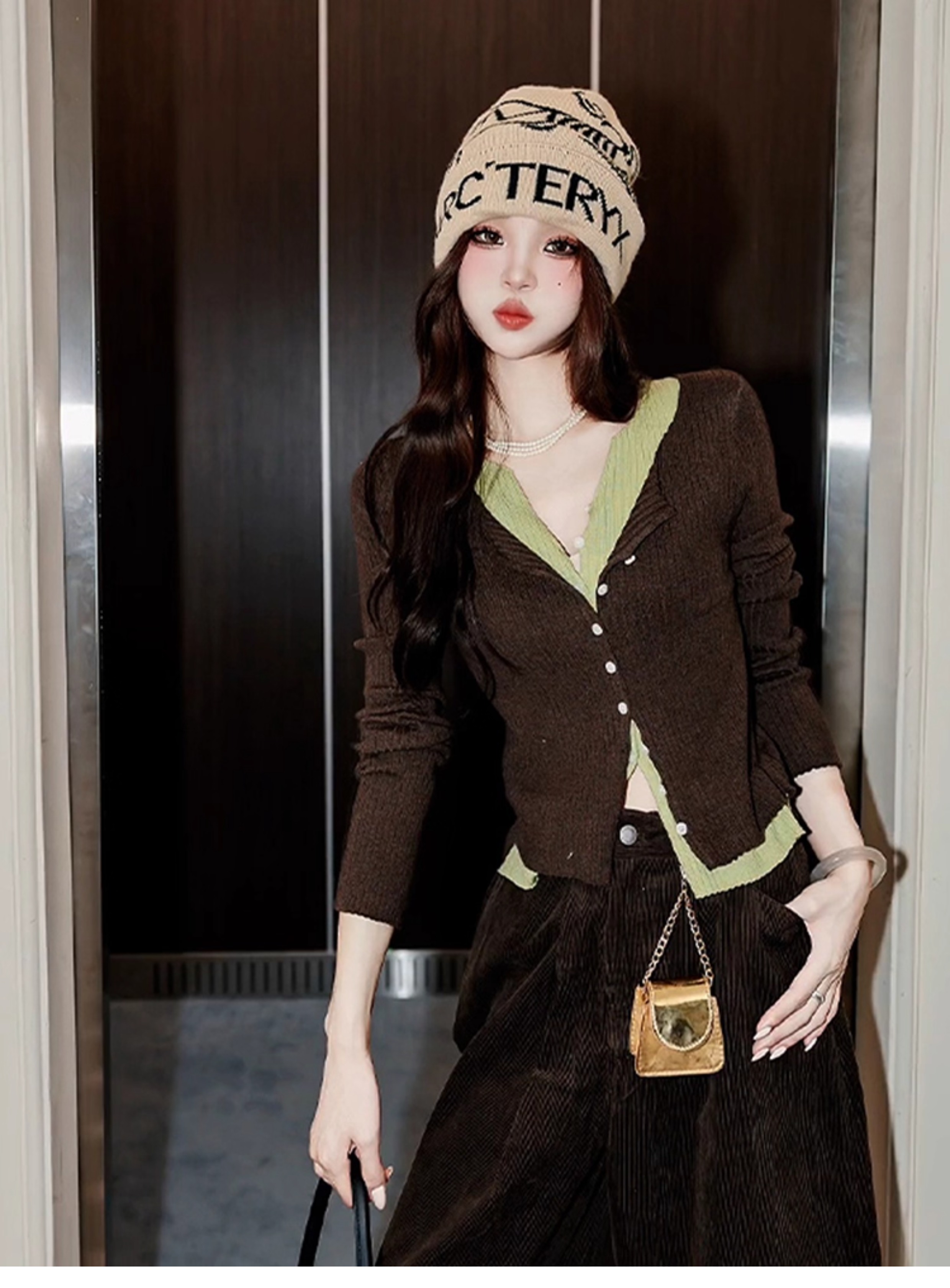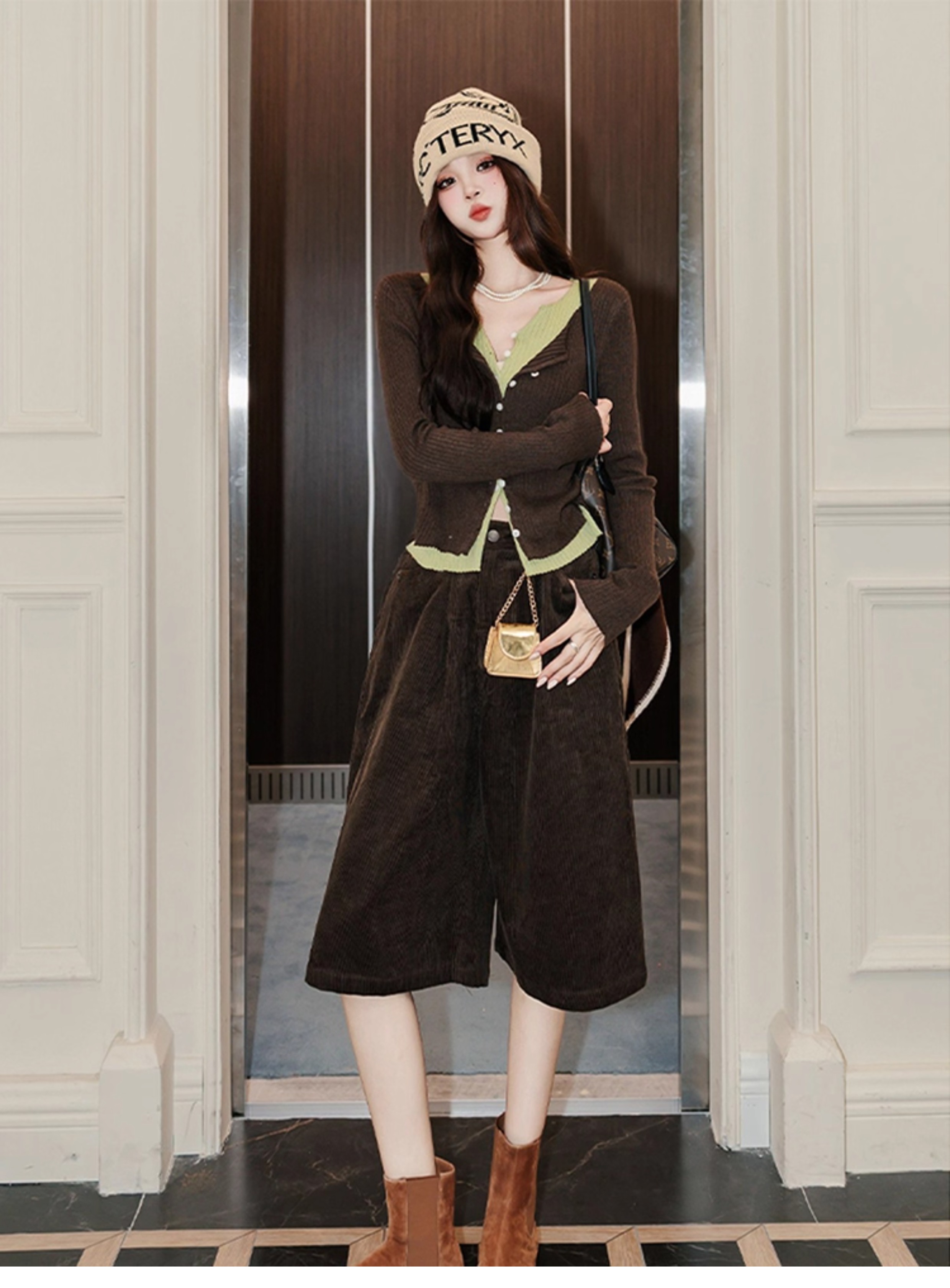 秋裝套裝 | 慵懶感咖色針織衫 | 燈芯絨七分褲 | 氣質咖色休閒套組 | 鬆弛感高級時尚