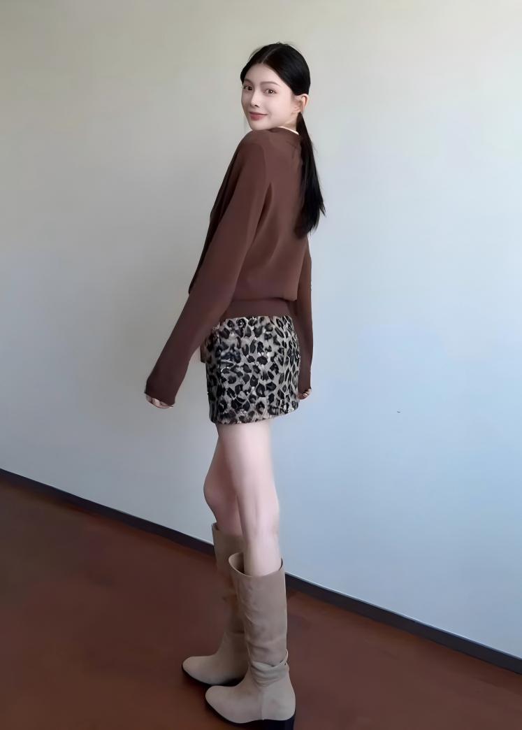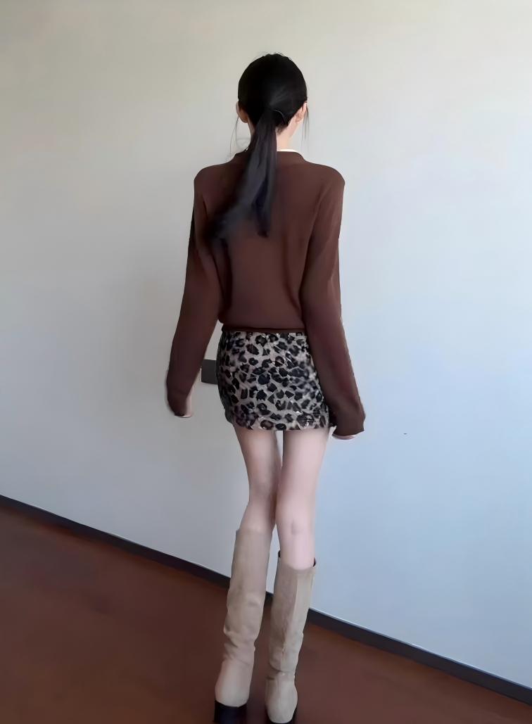 美拉德咖色假兩件針織衫|復古豹紋羊羔毛短裙|甜酷風一整套穿搭