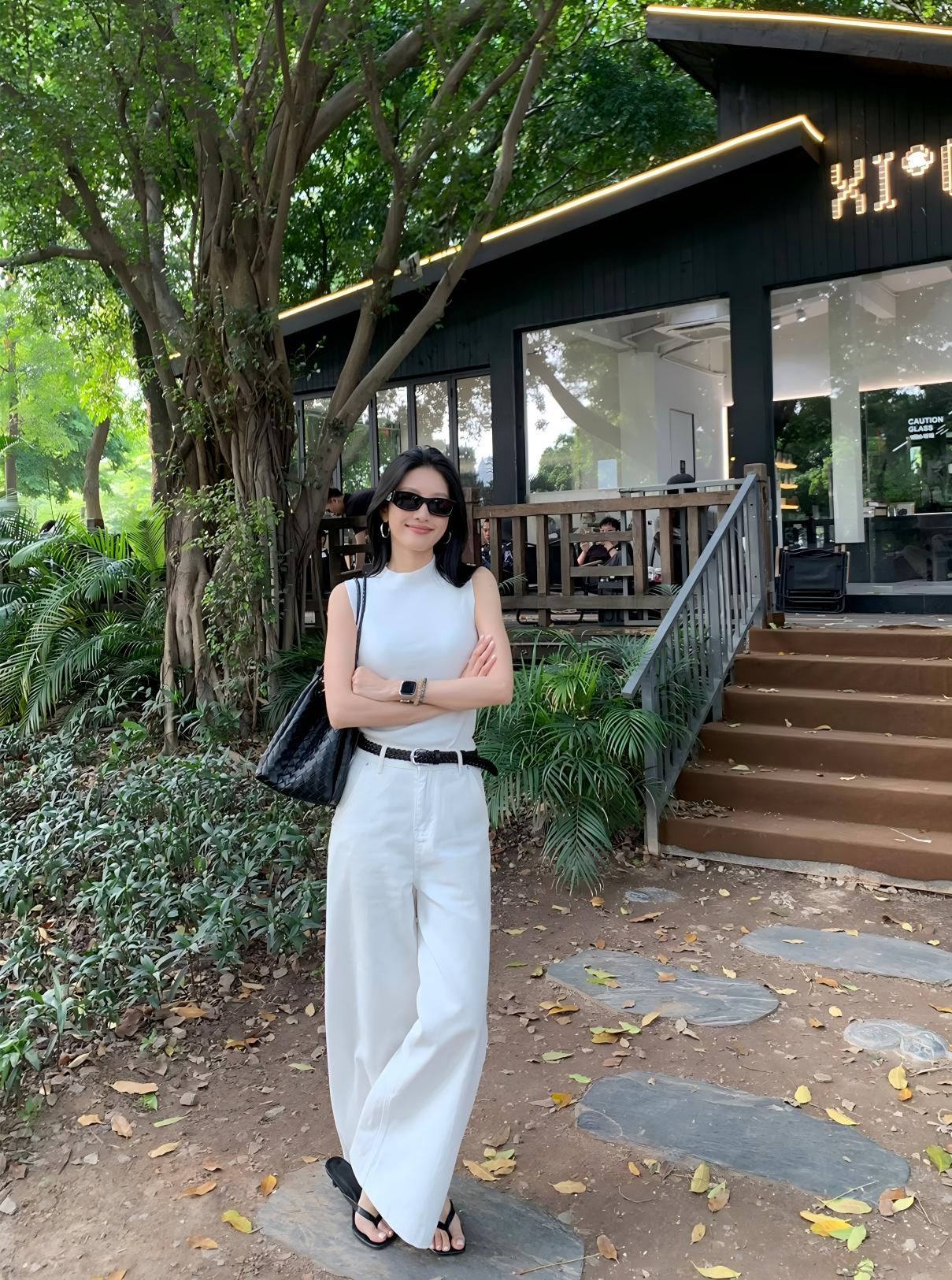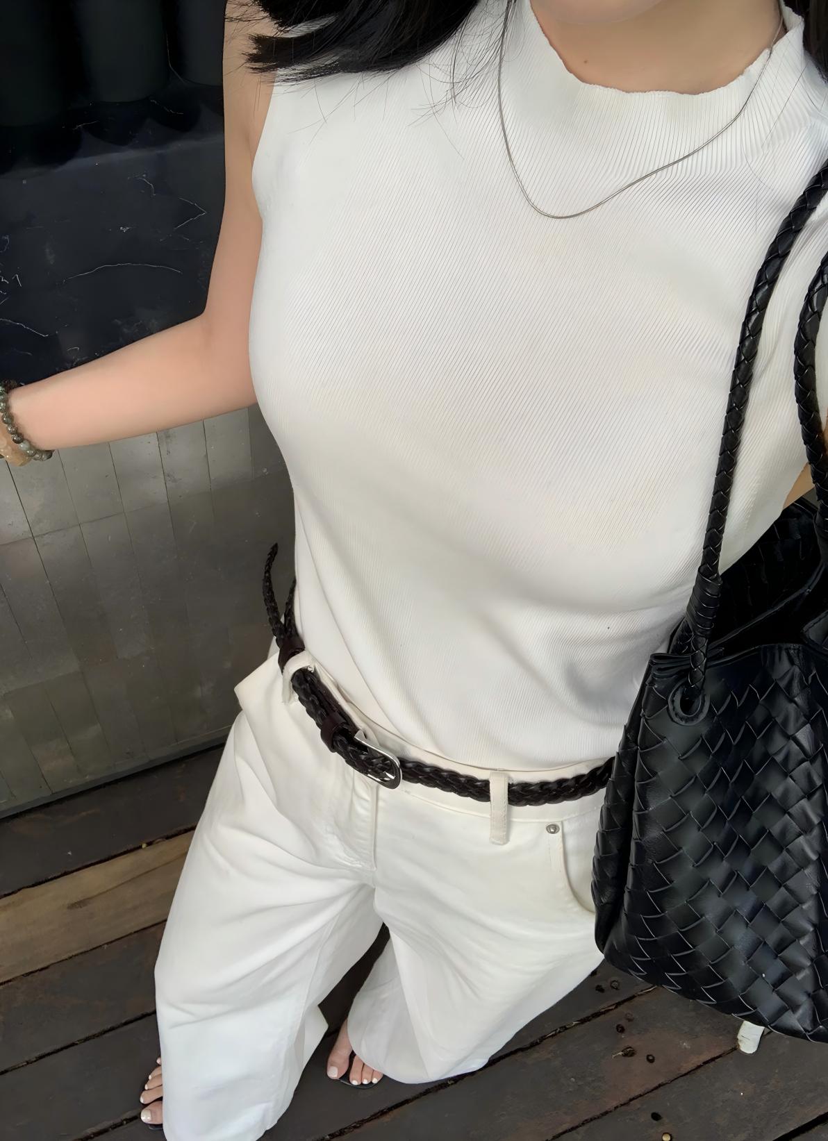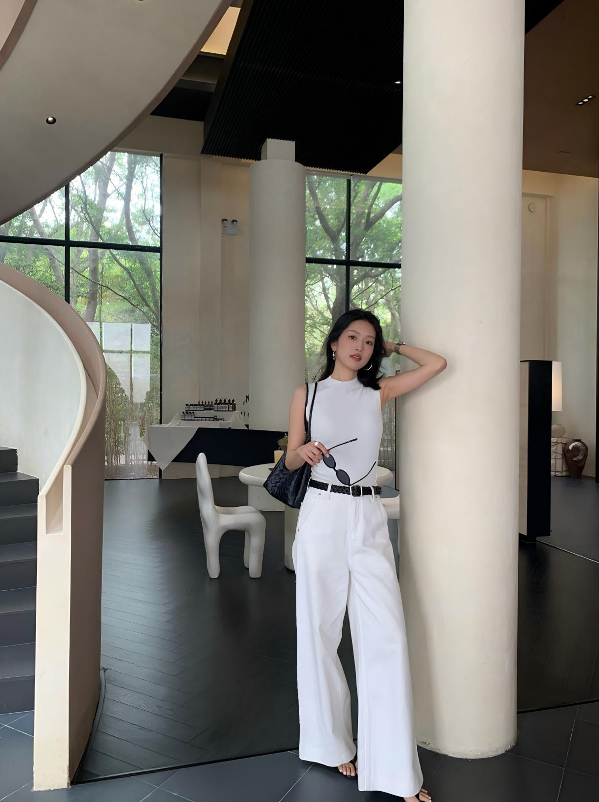 【預售】夏季純色系顯瘦套裝|白色針織背心|白色闊腿牛仔褲