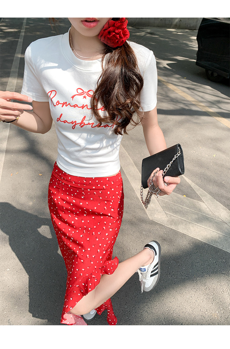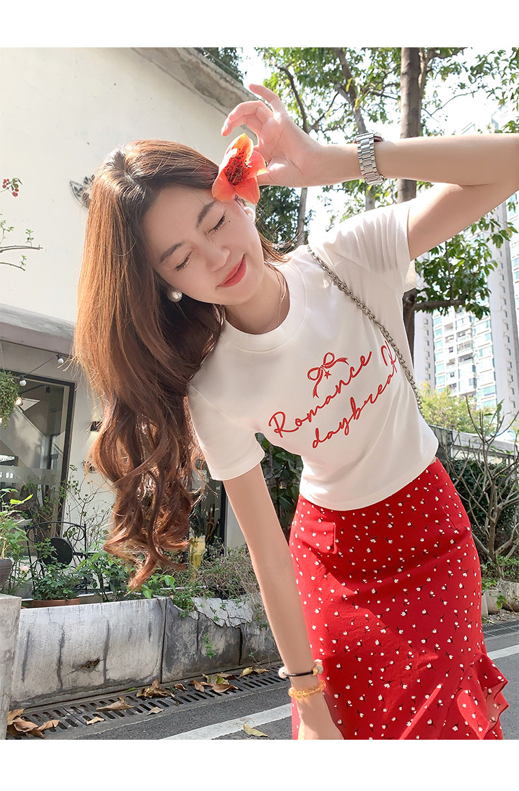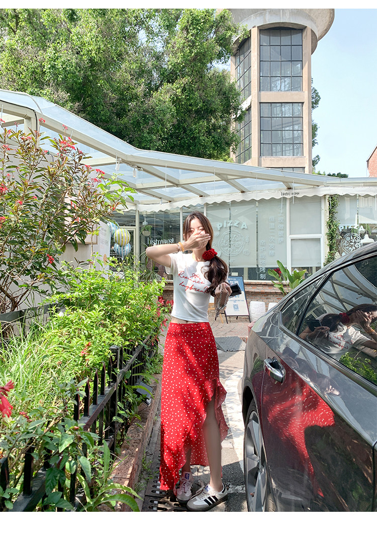 辣妹風波點套裝|字母印花短袖T恤|高腰開叉不規則波點長裙|設計感兩件組