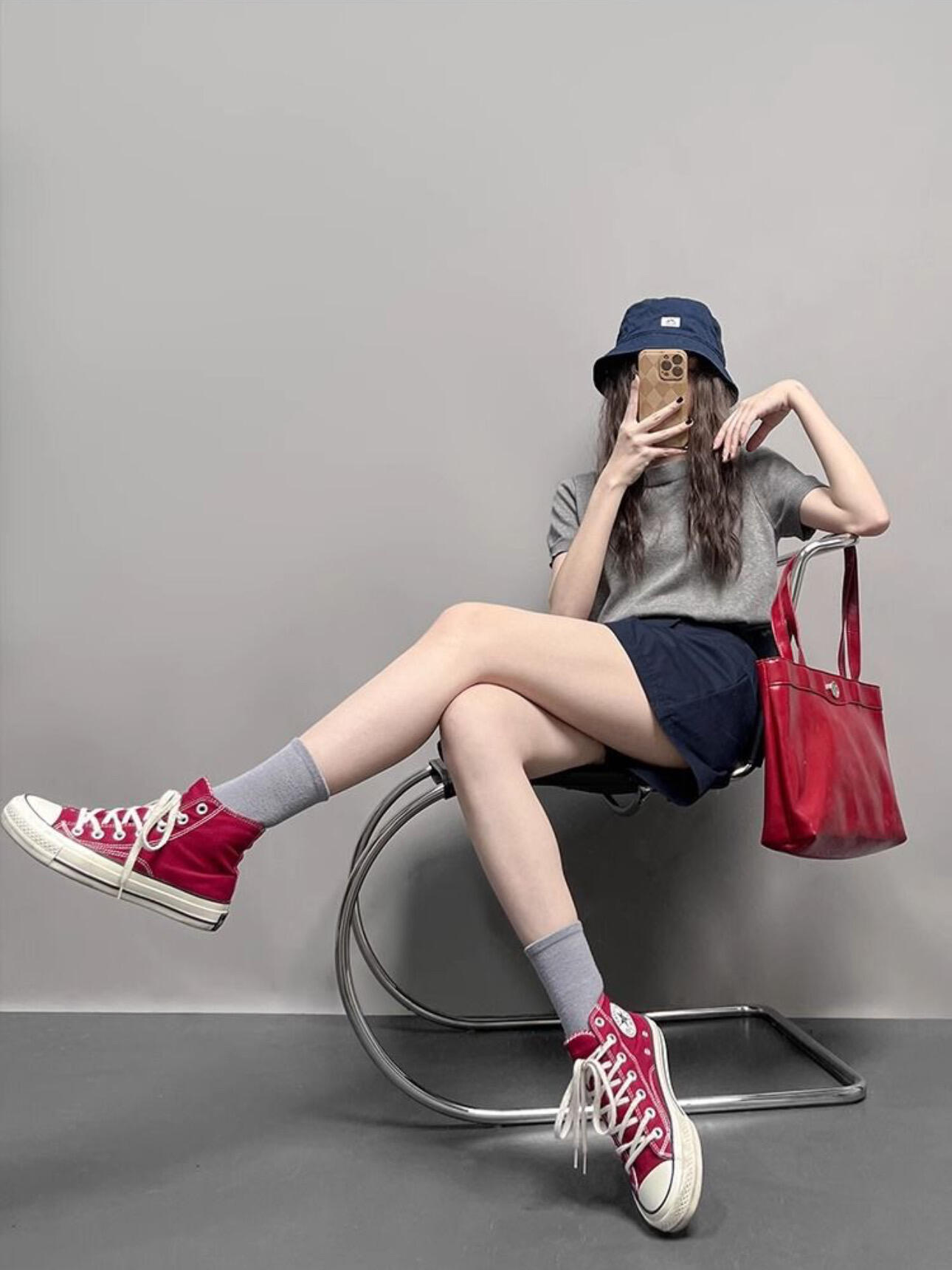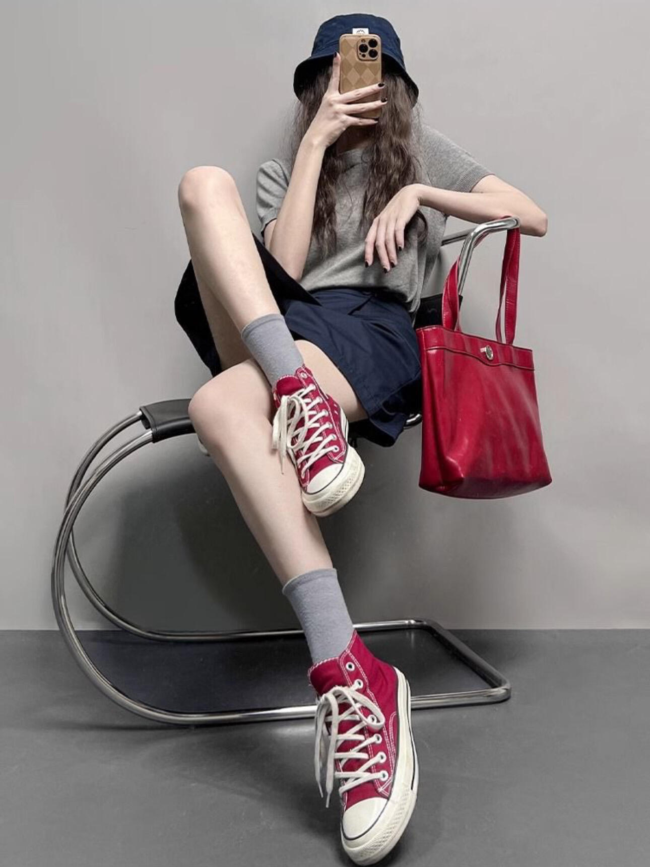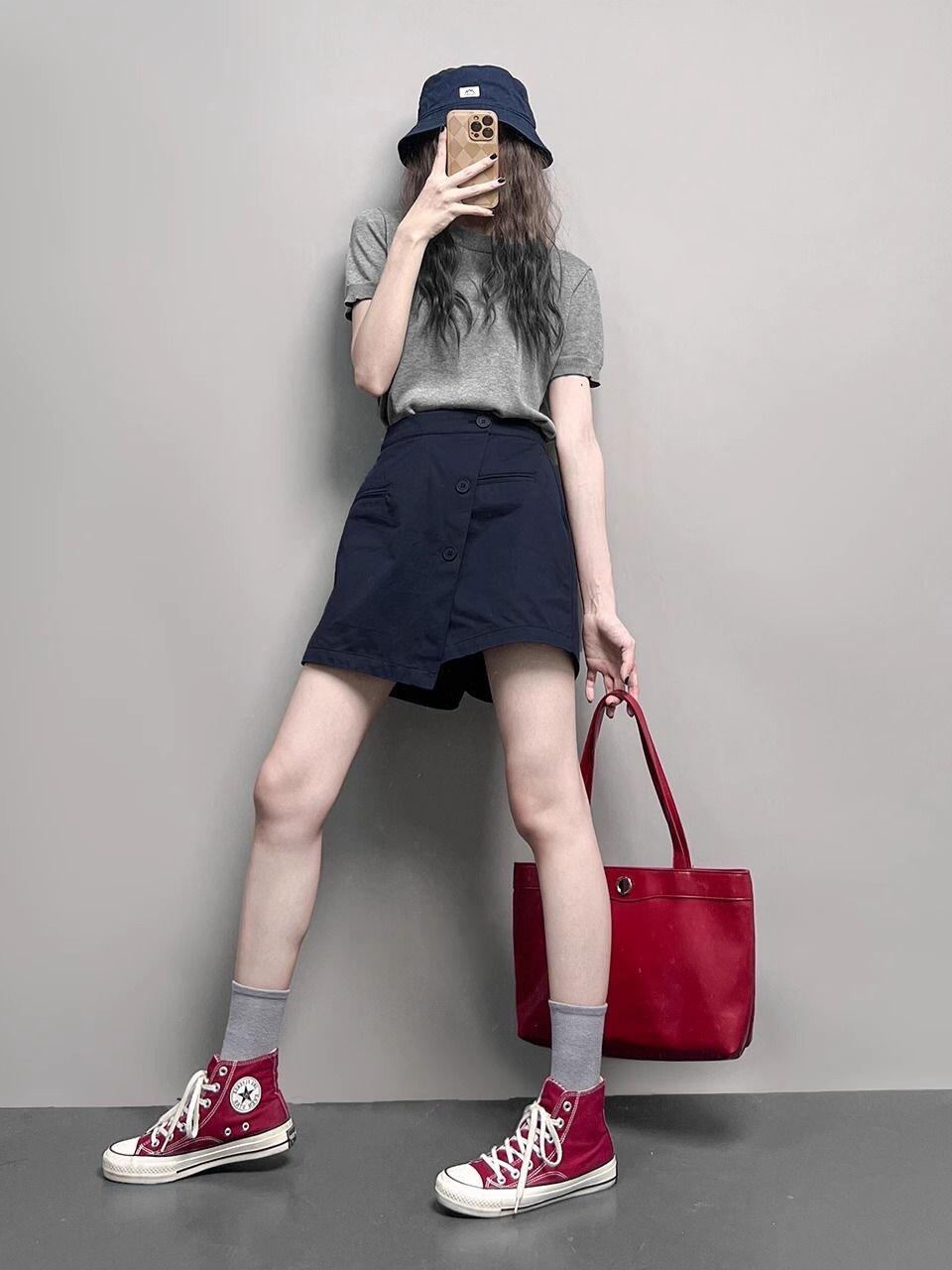 高級簡約鬆弛套裝 | 灰色圓領針織短袖|不規則工裝裙褲|小眾設計感兩件組