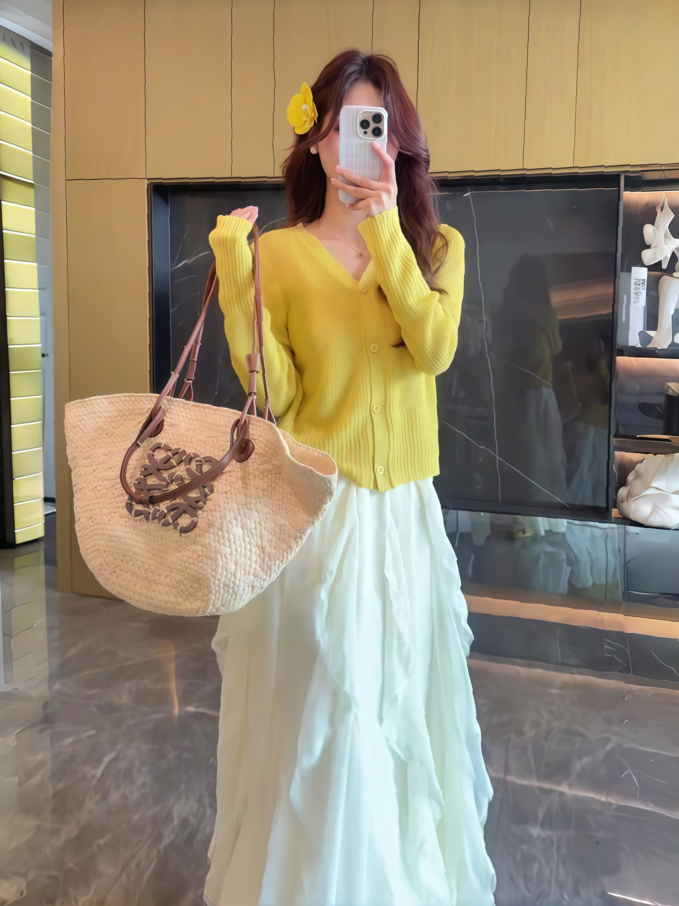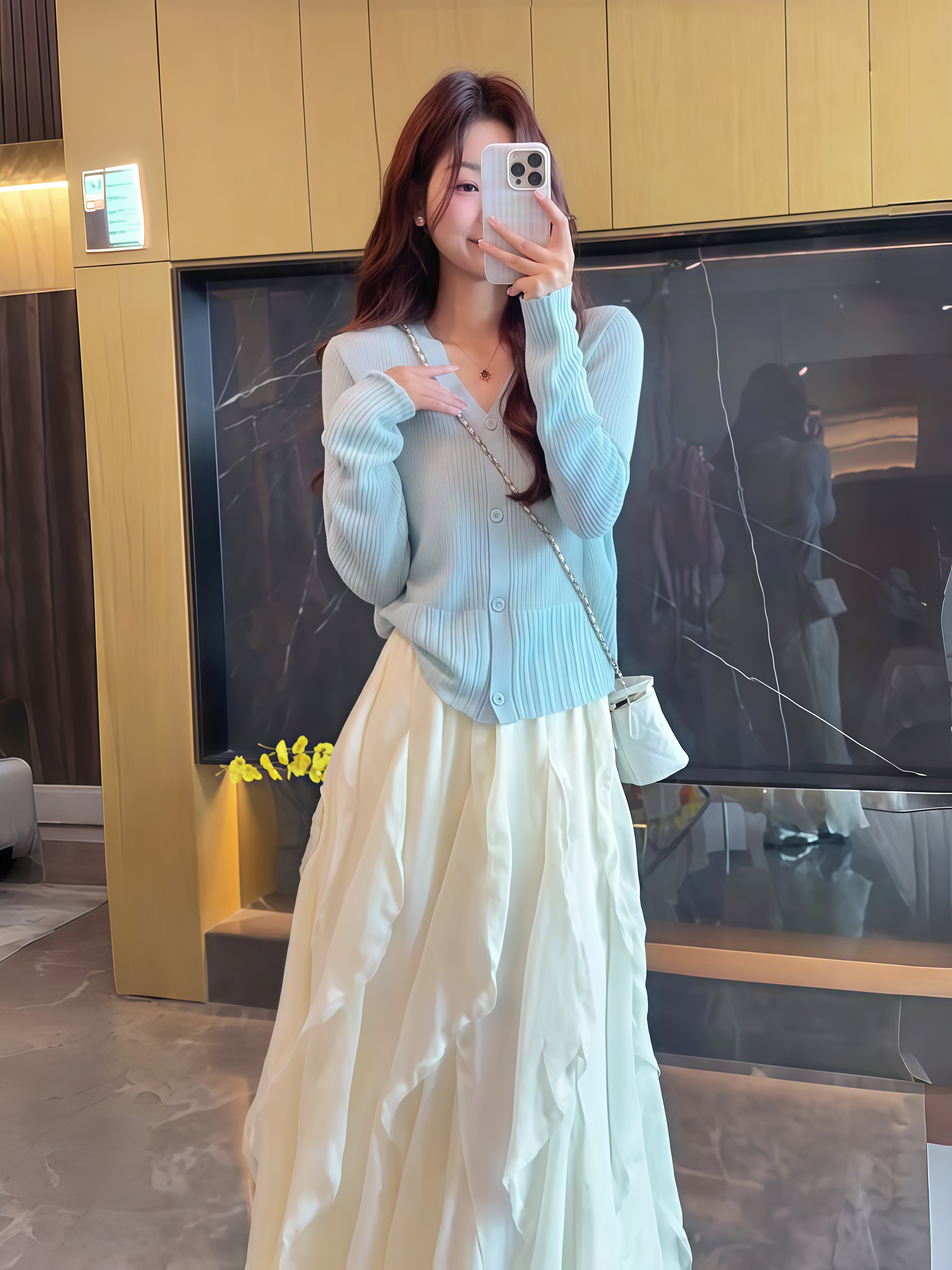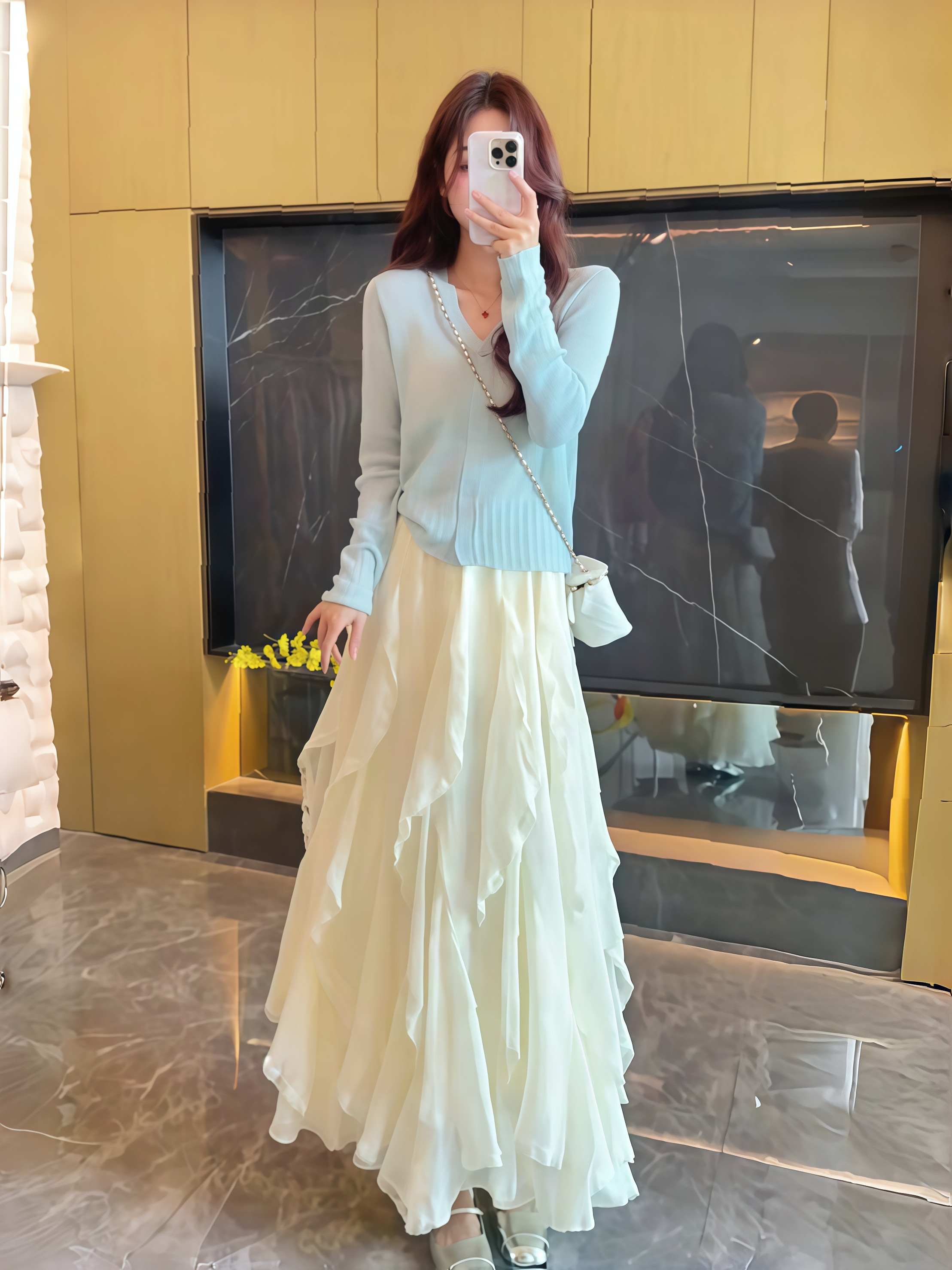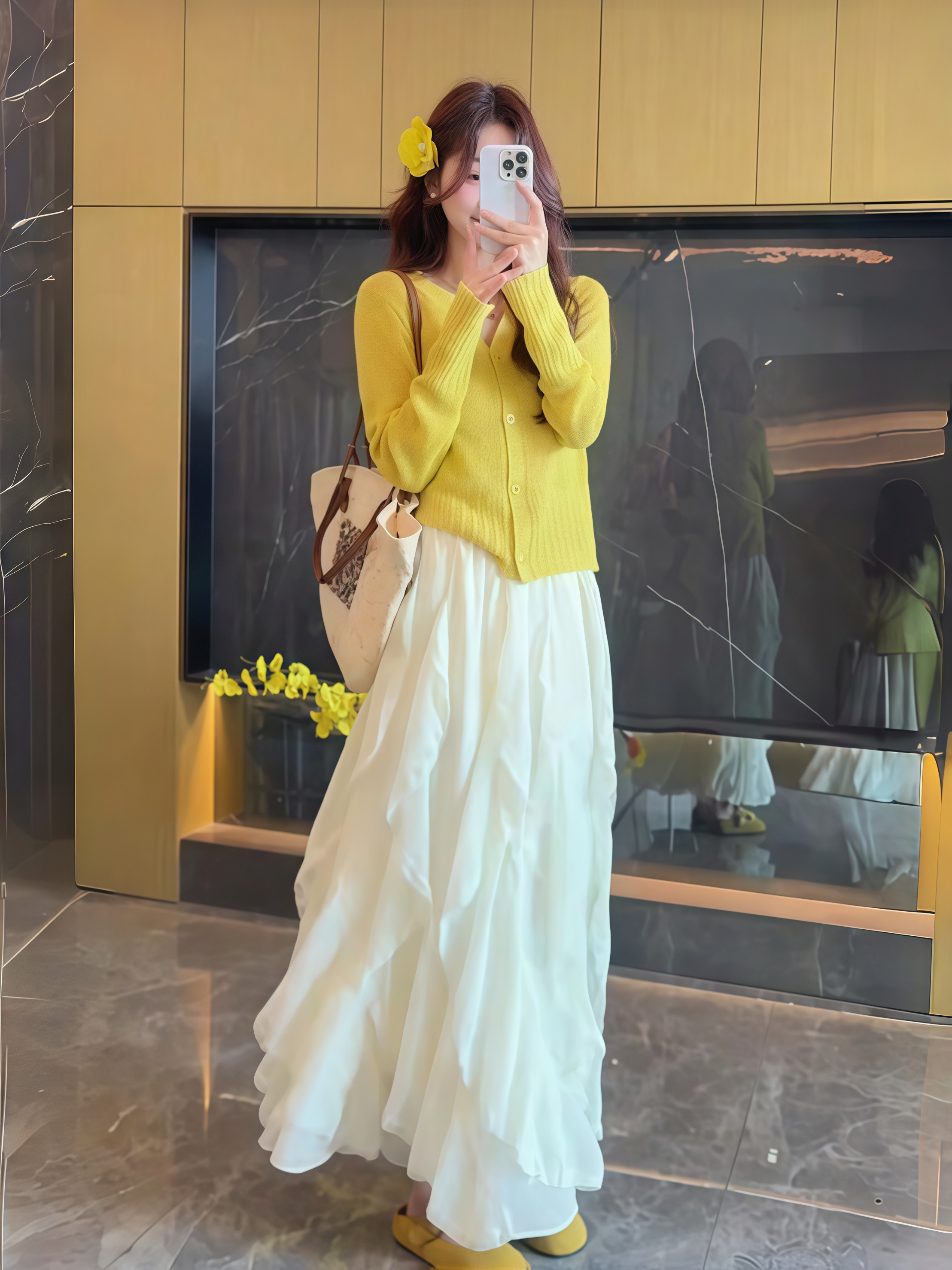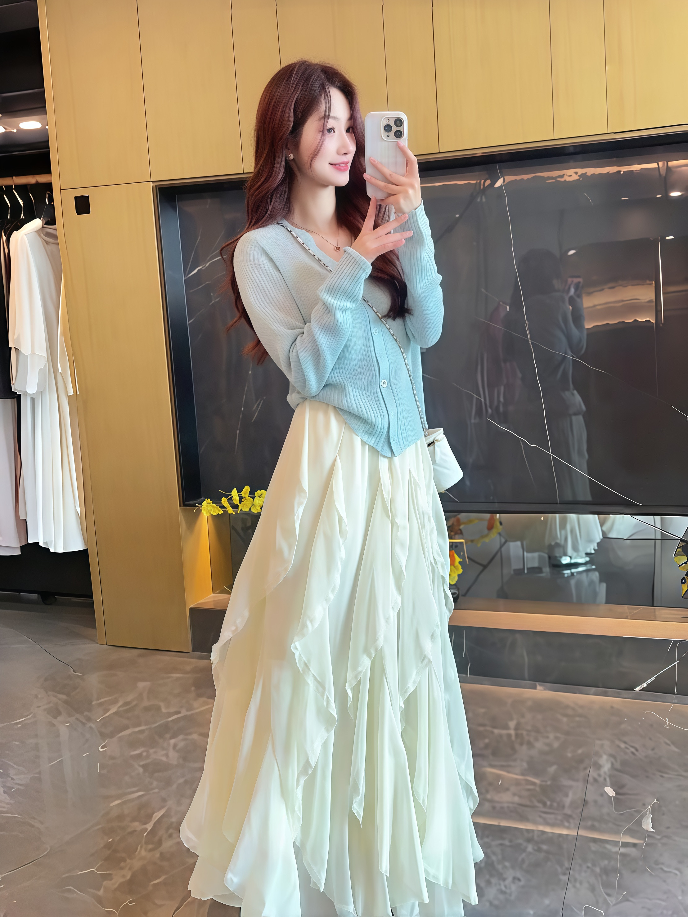春季薄款韓系溫柔兩件套 | 檸檬黃針織 V 領開衫 | 白色不規則荷葉邊長裙