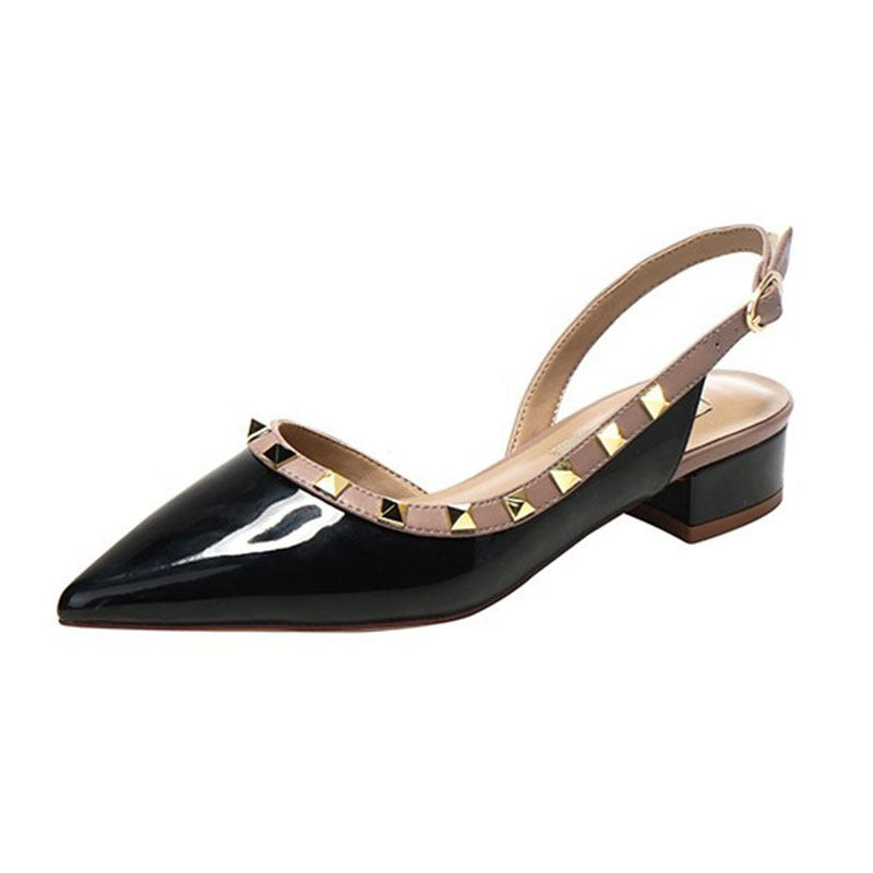 法式復古鉚釘包頭涼鞋 | 尖頭粗跟一字扣帶漆皮女鞋 | 多色可選