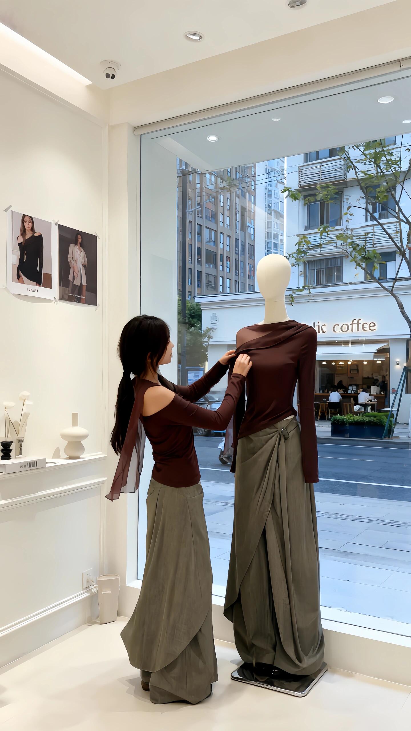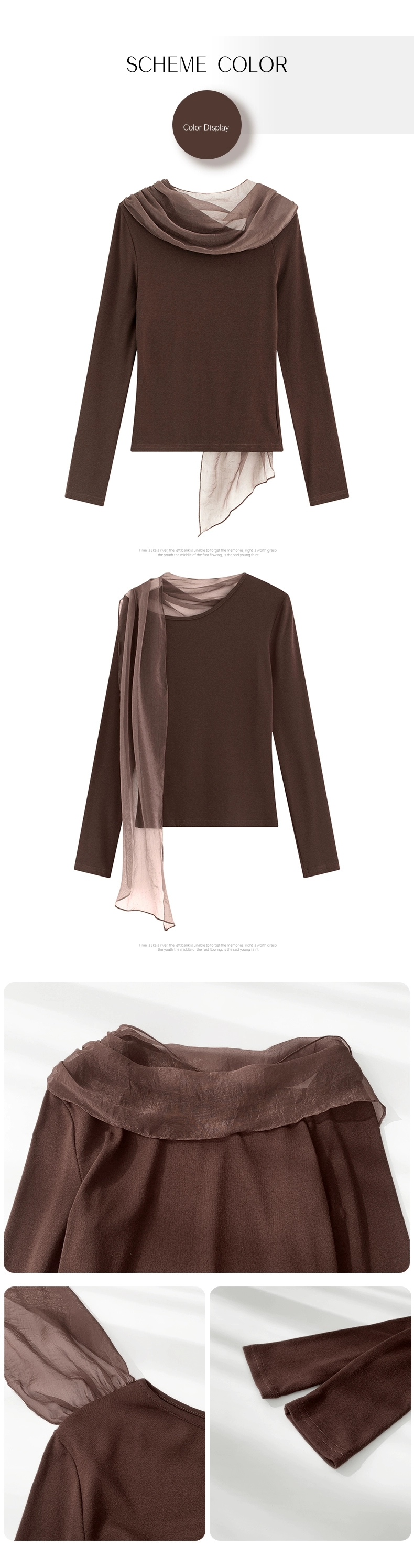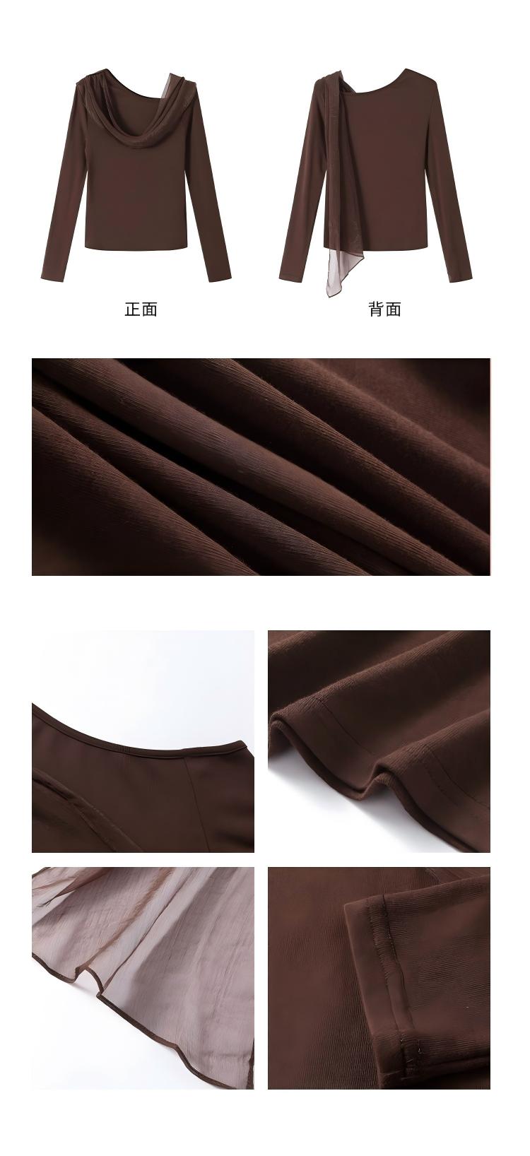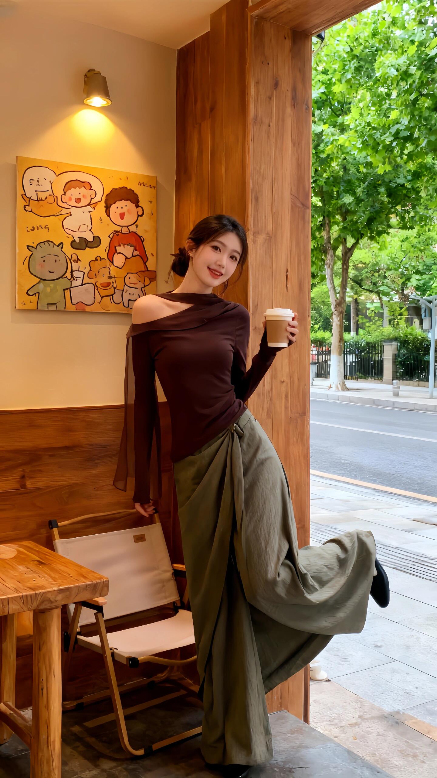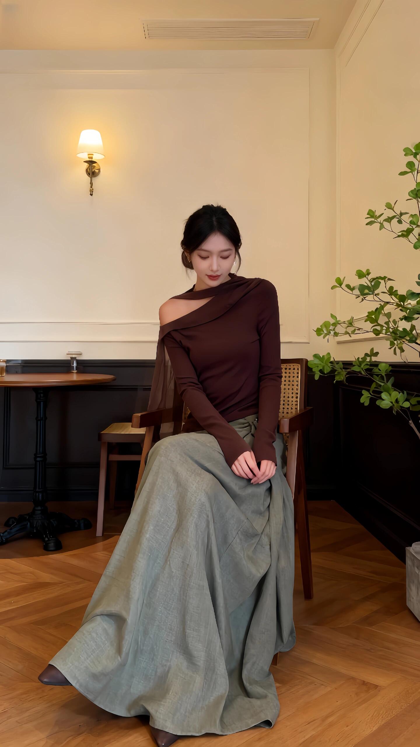 早秋美拉德風設計感套裝|斜肩網紗飄帶棕色長袖上衣|不規則復古闊腿褲|氣質層次感兩件組