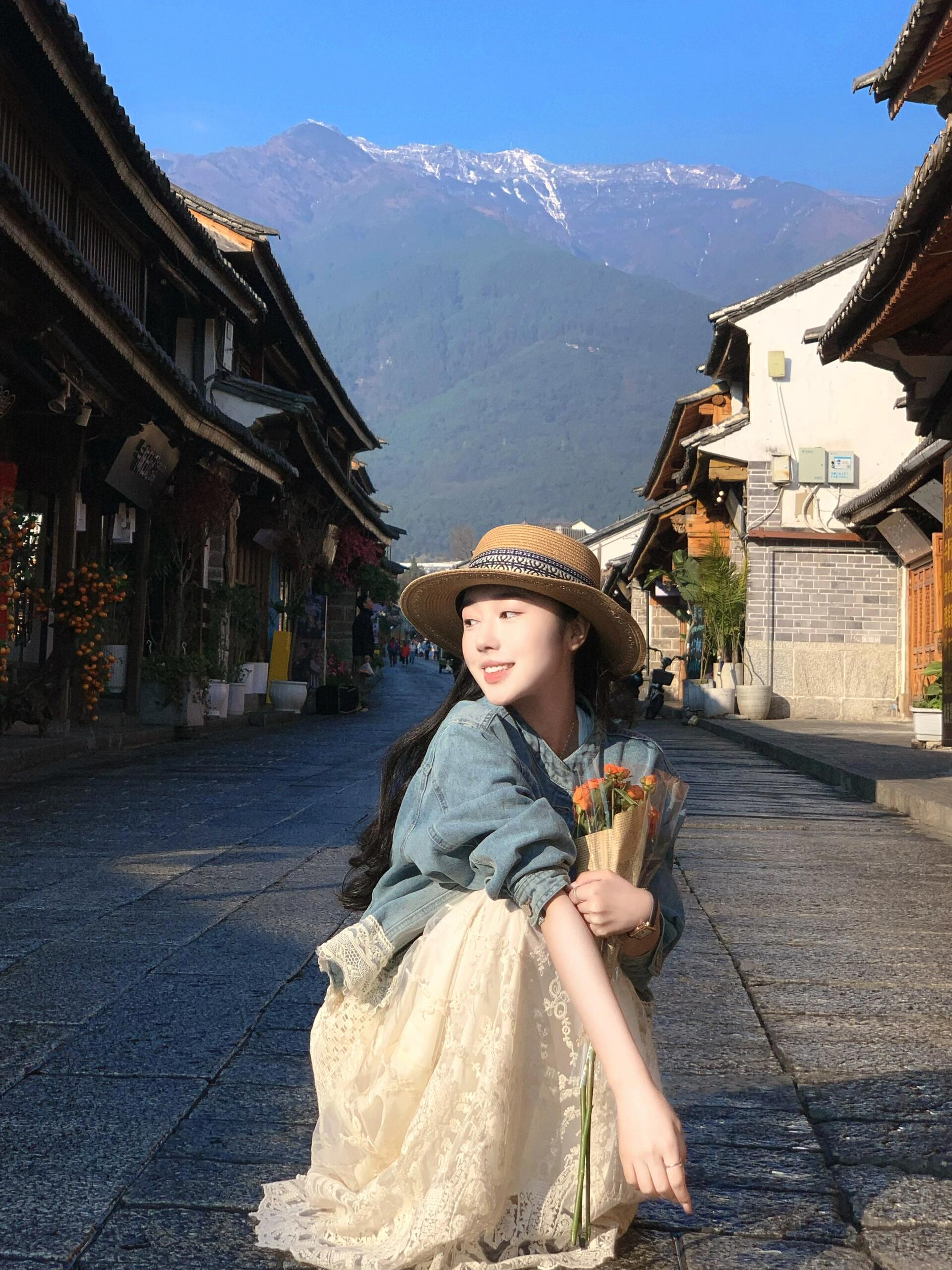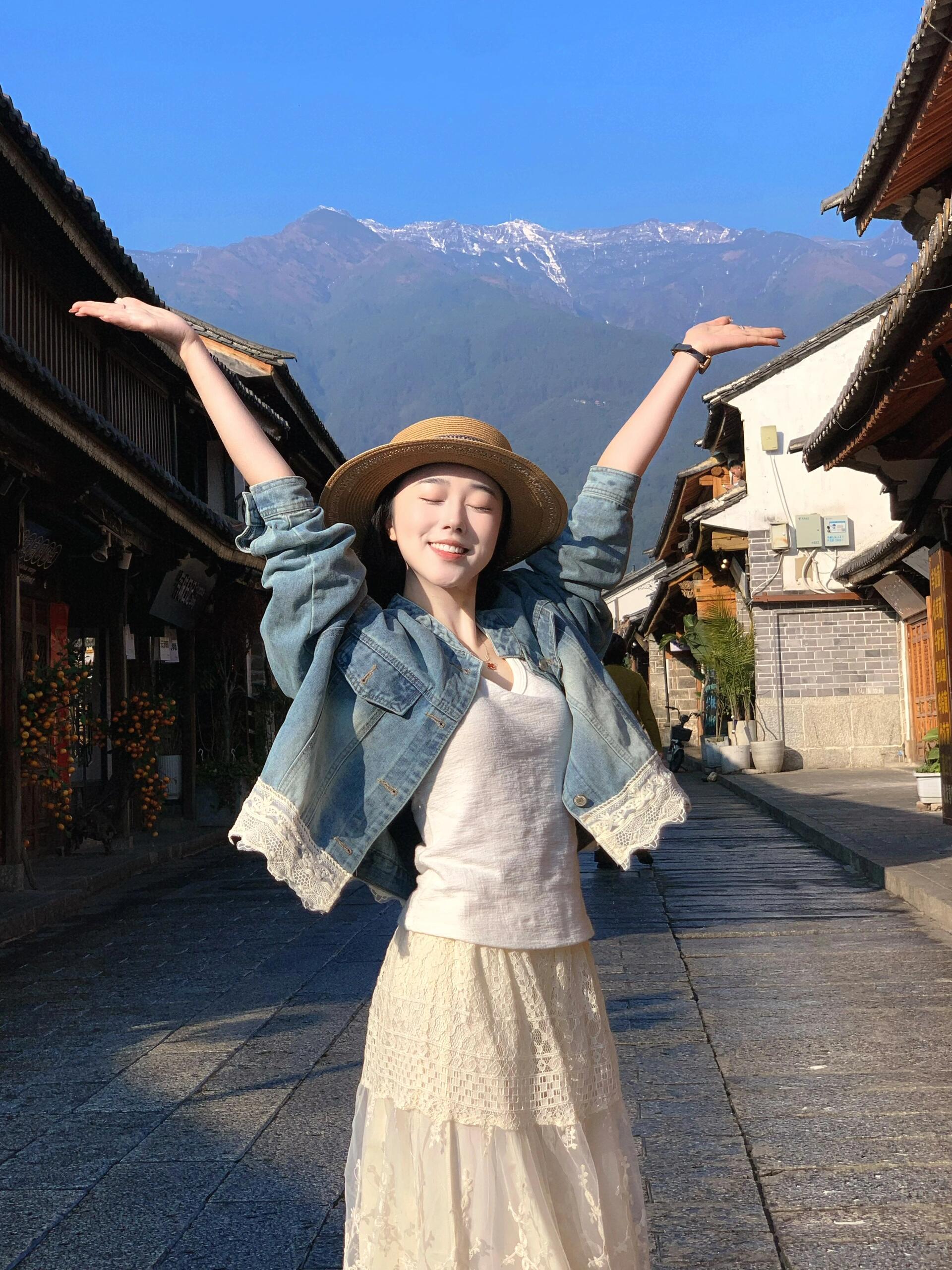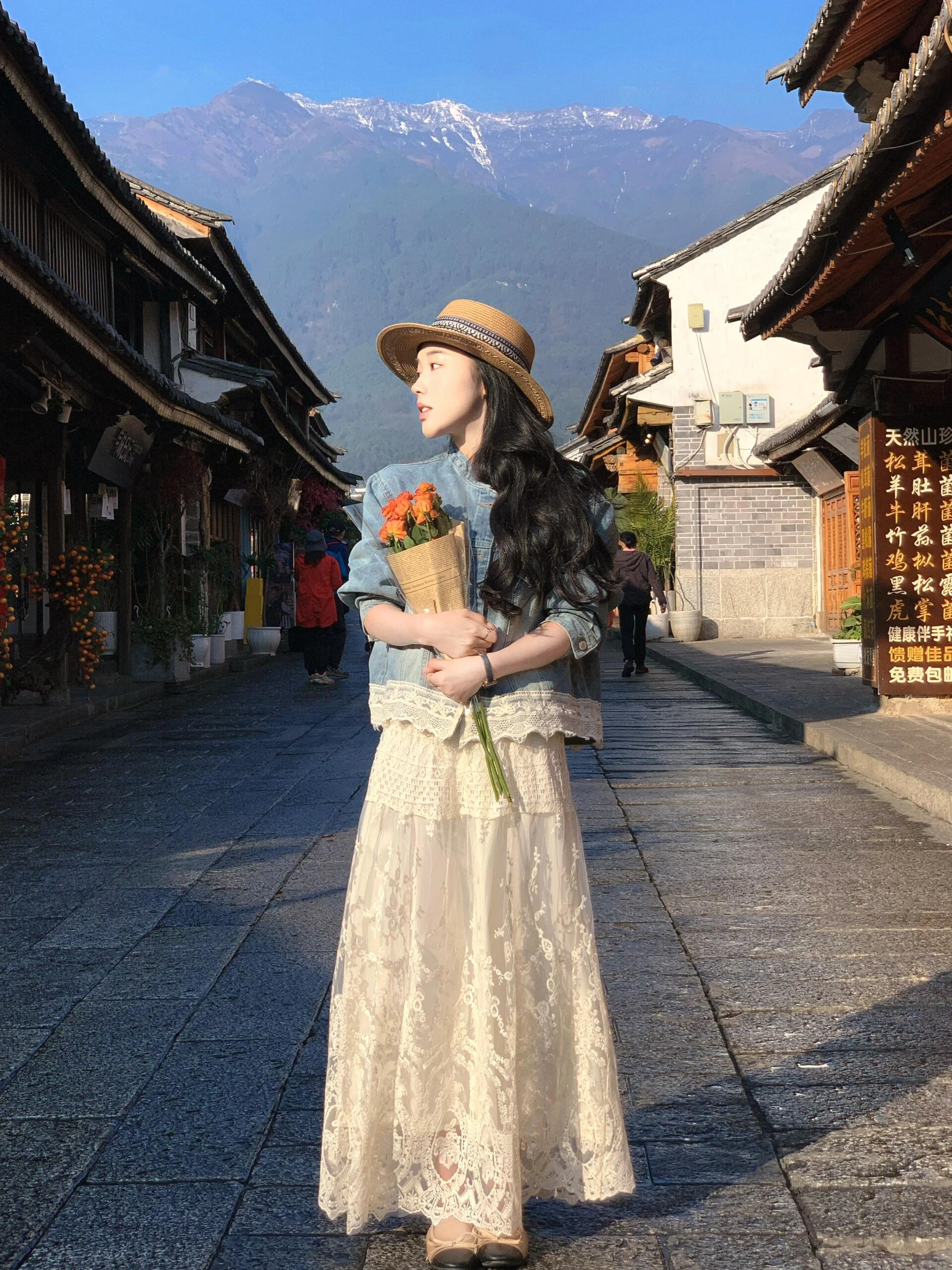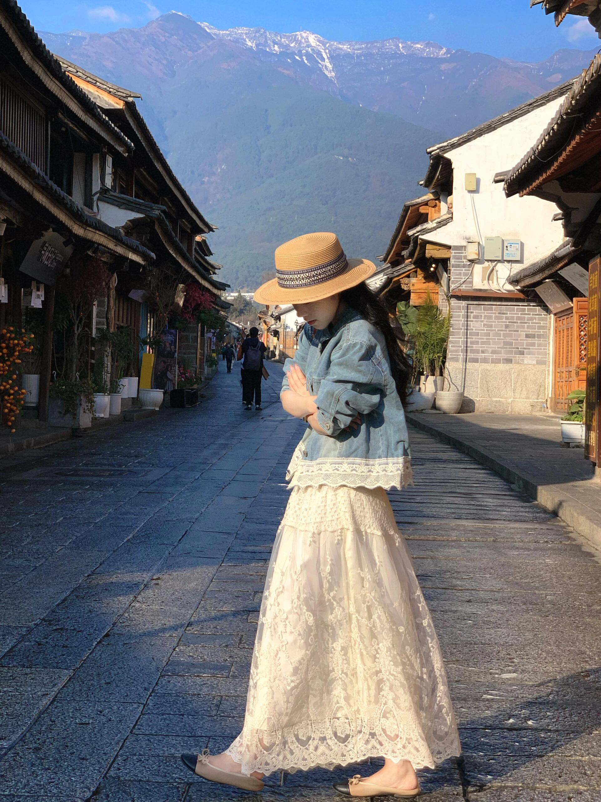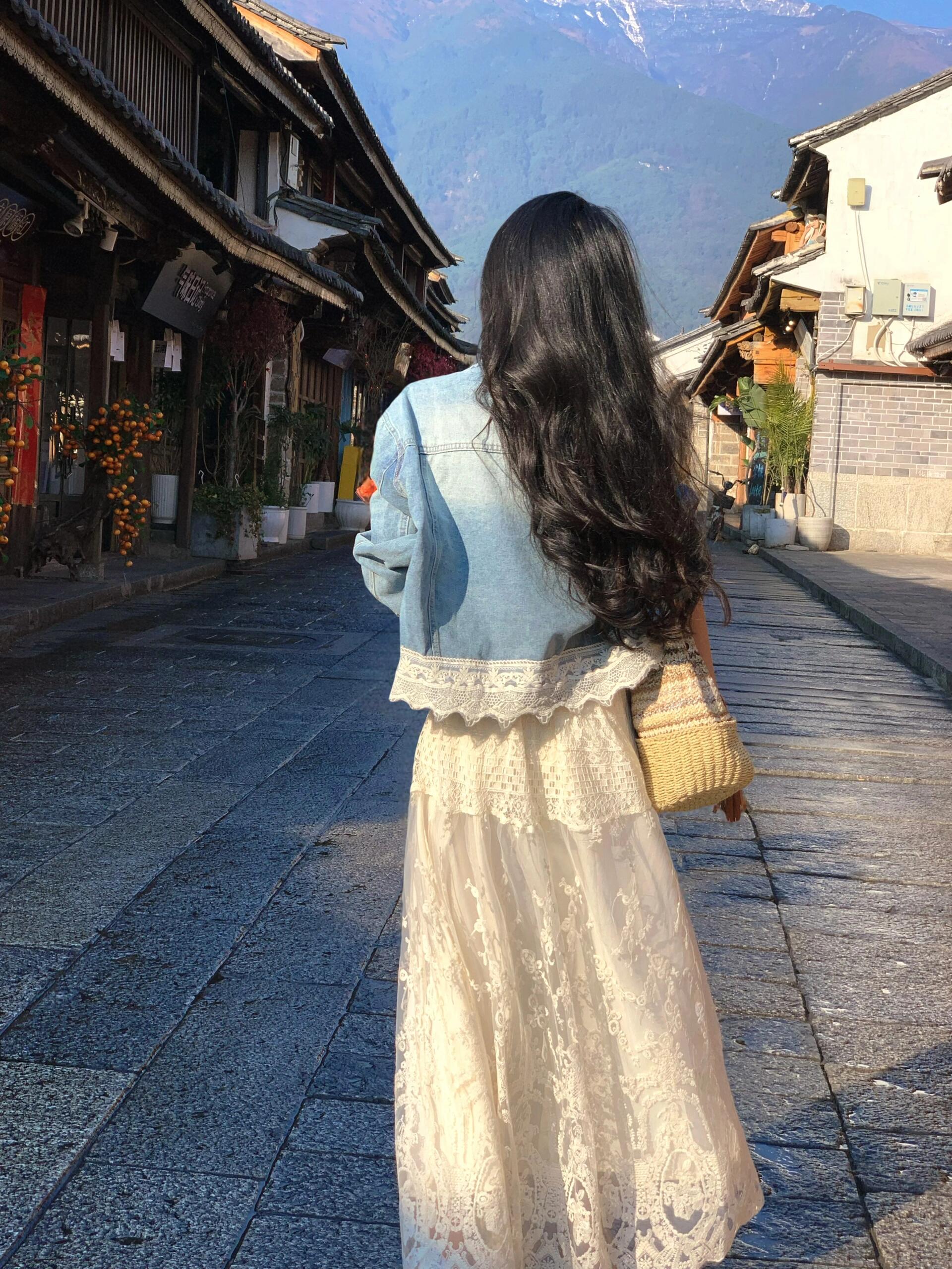 2025小香風設計感套裝|藍色蕾絲拼接牛仔外套|高腰白色蕾絲長裙|氣質兩件套