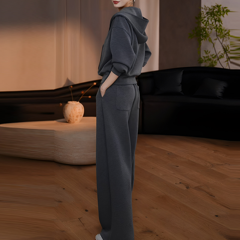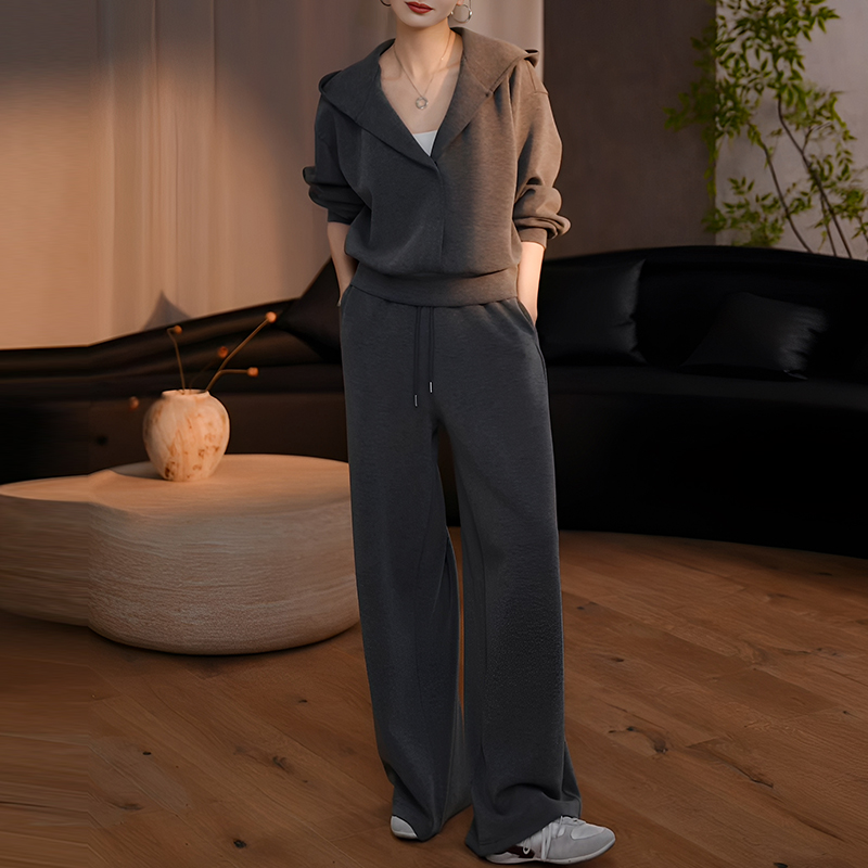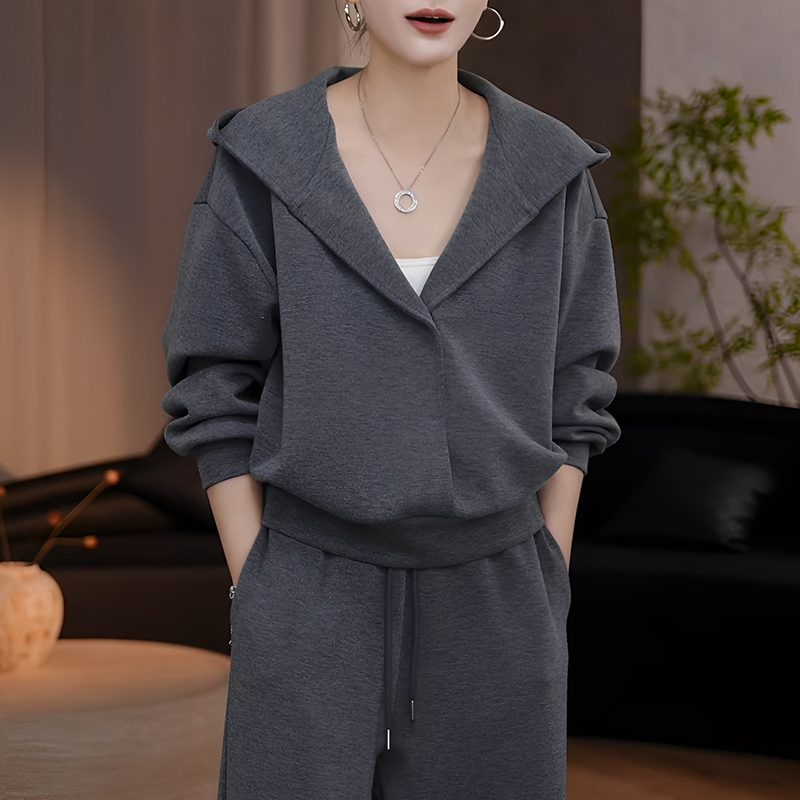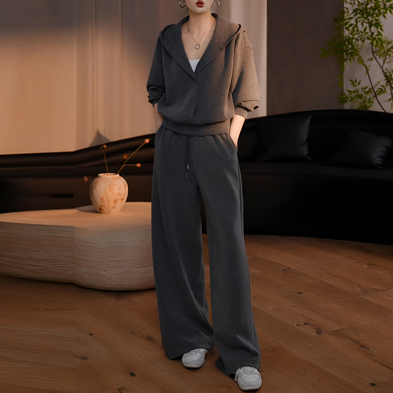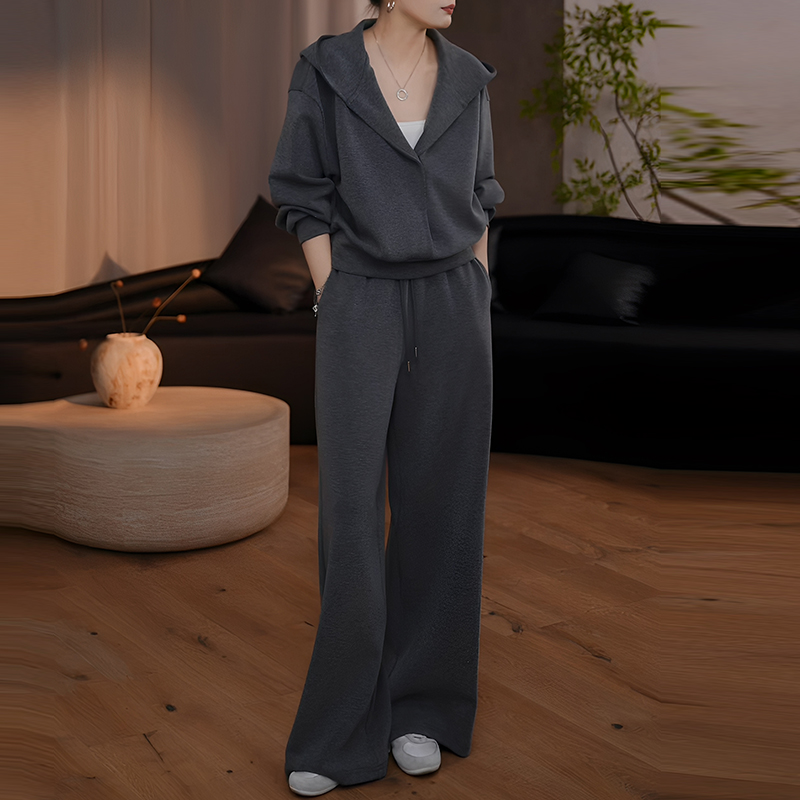 秋季慵懶風時尚套裝|灰色連帽衛衣 + 寬鬆休閒褲兩件組|日常舒適出行穿搭