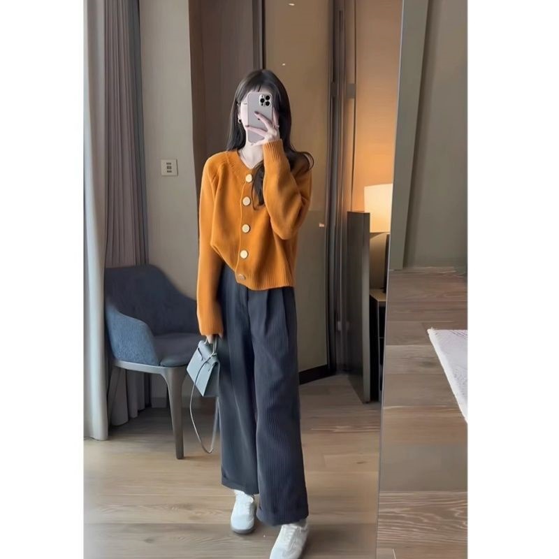 🔥特惠兩件套:橘黃色毛衣+闊腿褲