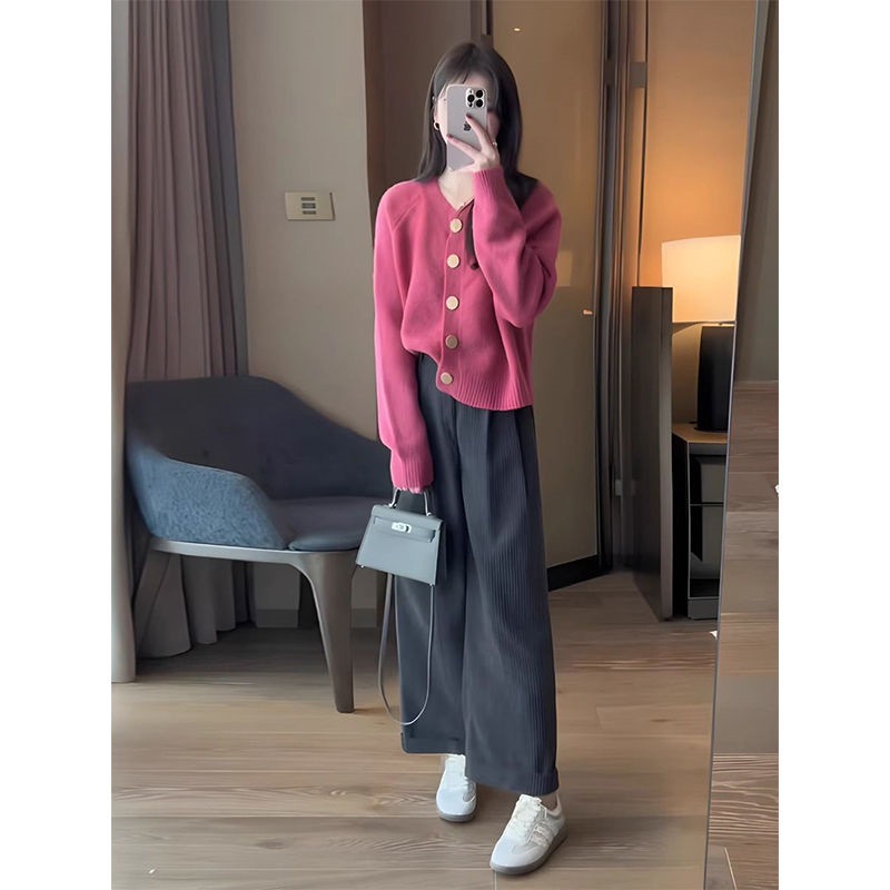 🔥特惠兩件套:玫紅色毛衣+闊腿褲