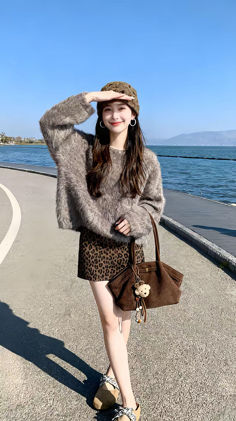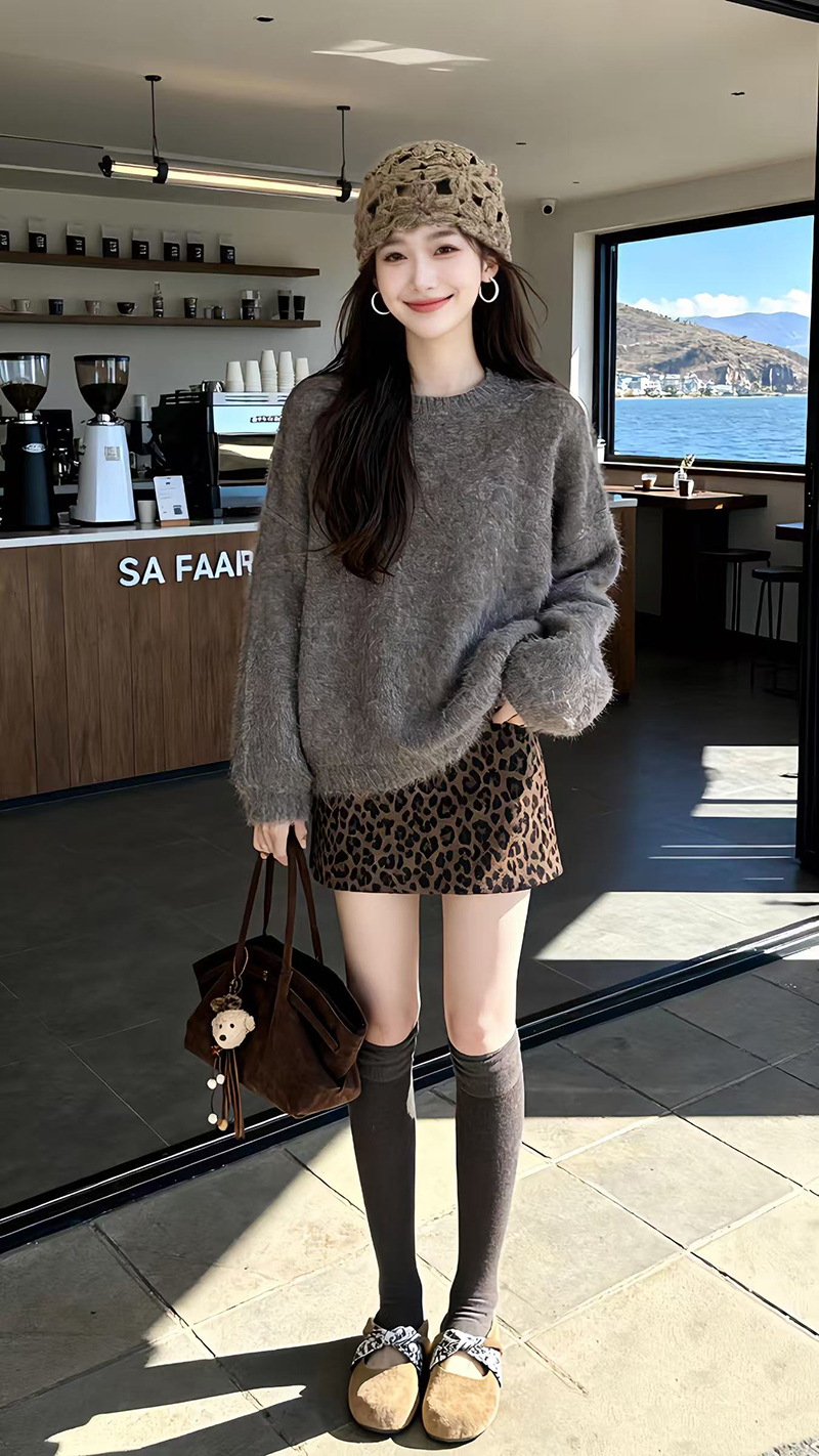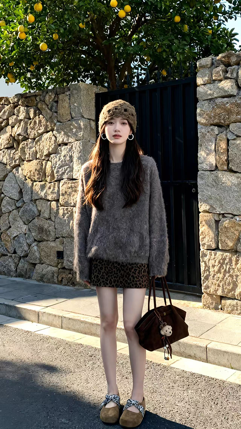 🔥特惠兩件套:灰色毛毛針織衫+豹紋短裙