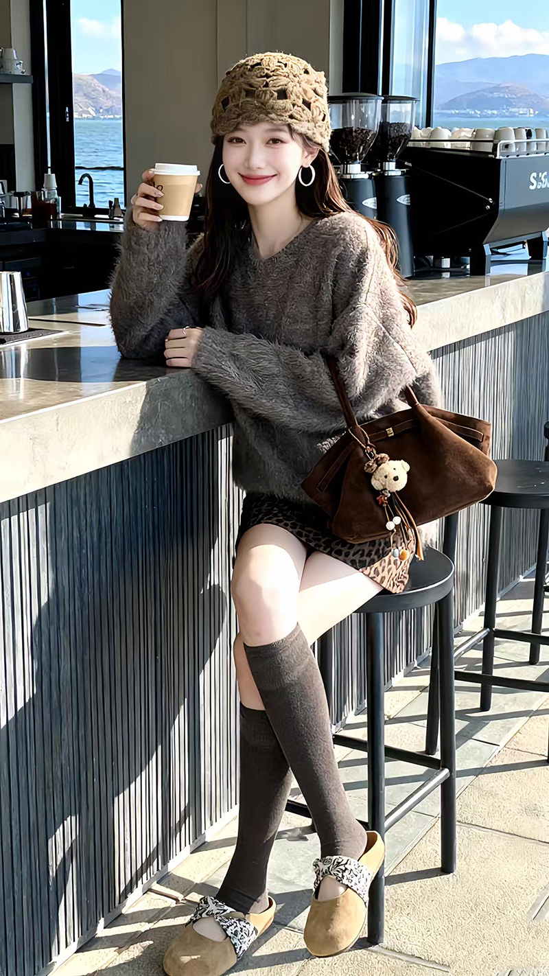 秋冬個性時尚套裝|毛毛針織衫|豹紋短裙|甜酷風約會派對穿搭