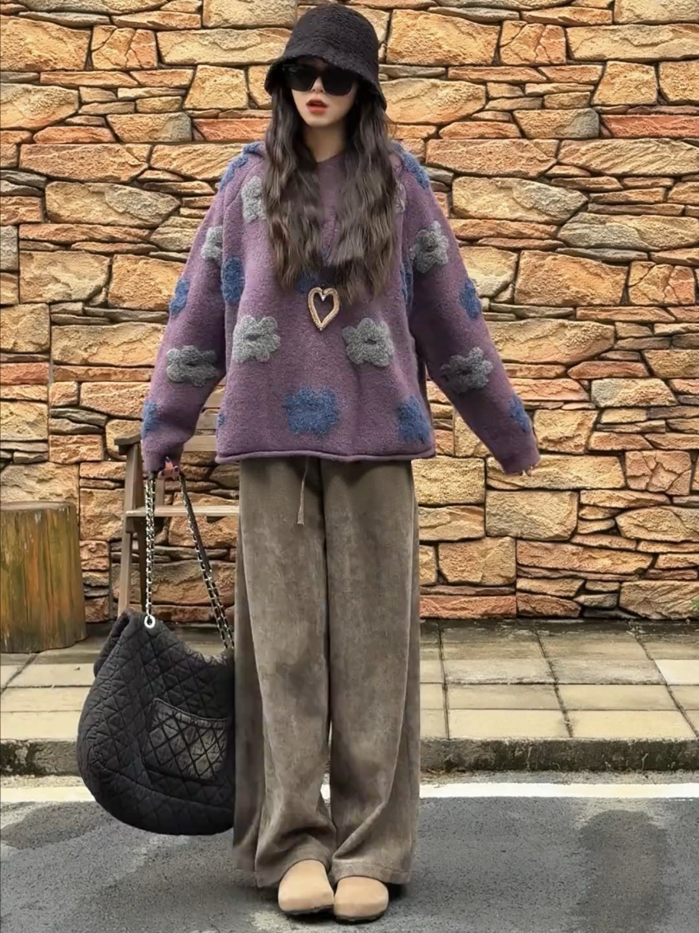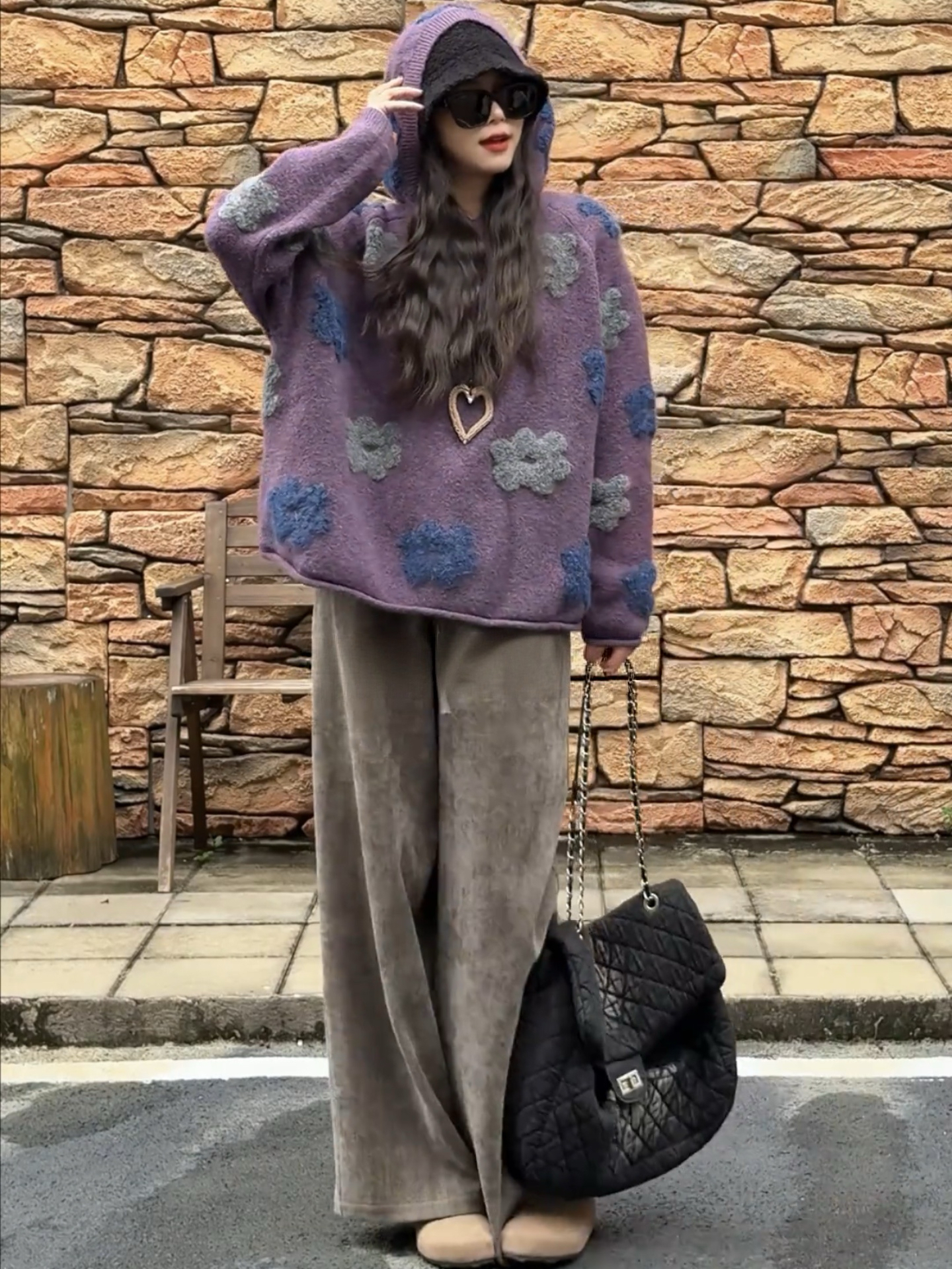 拒絕路人感 | 紫色花朵刺繡連帽毛衣 | 高腰闊腿褲 | 秋冬慵懶風搭配