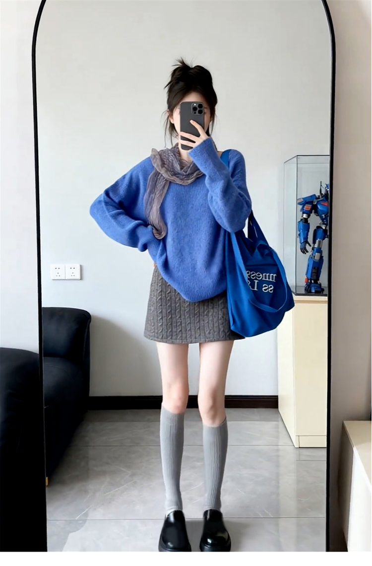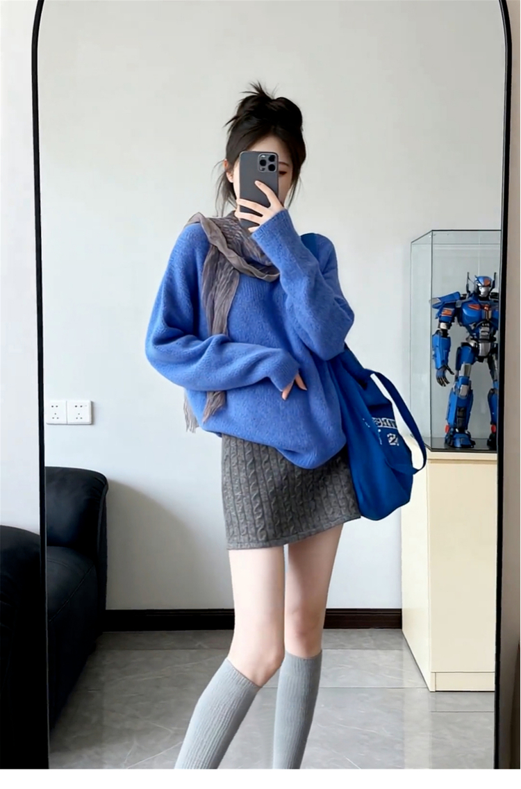 🔥特惠兩件套:藍色針織毛衣+灰色針織短裙