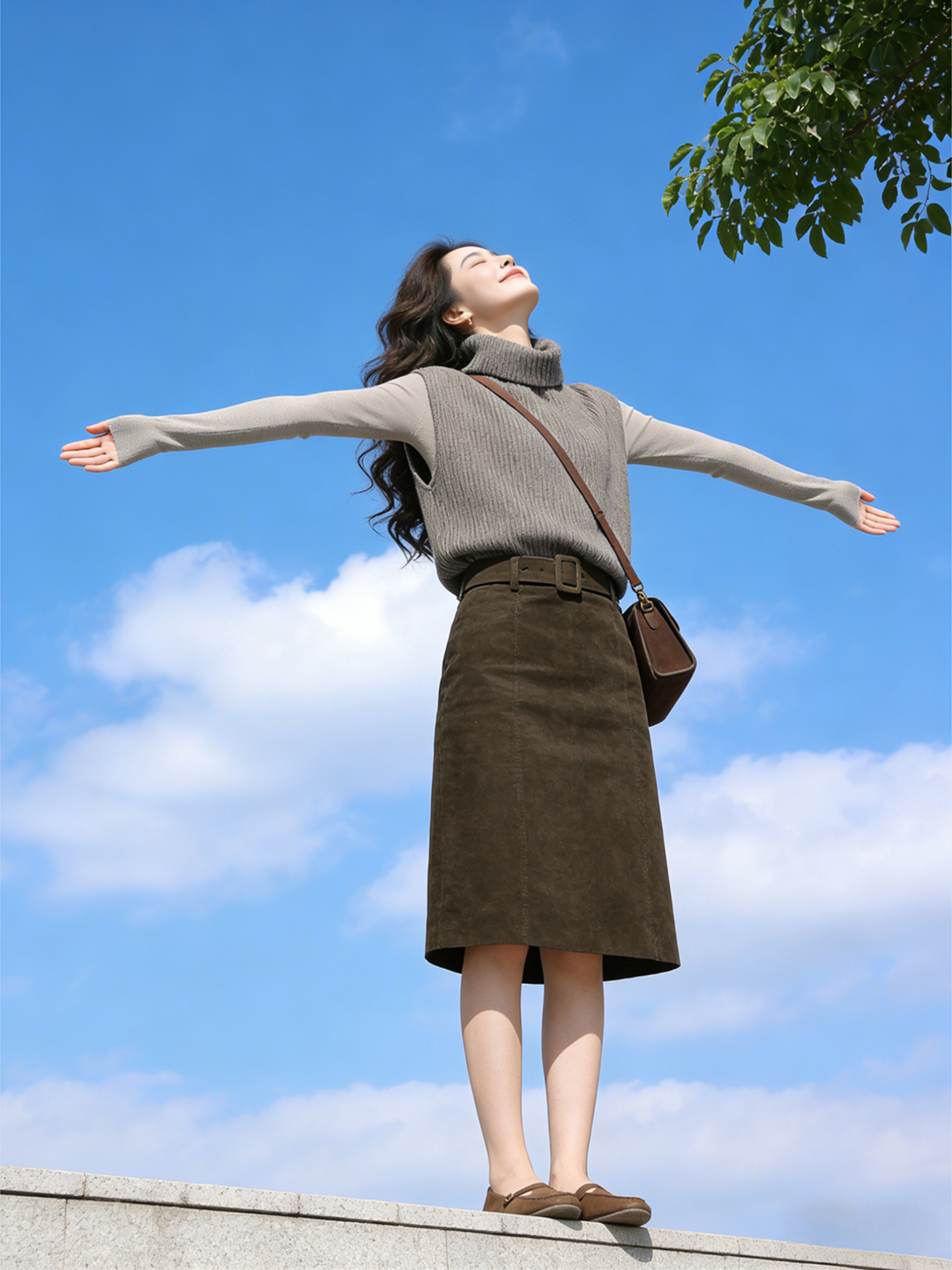 秋冬疊穿時尚套裝|高領針織衫+打底衫|咖色半身裙|氣質通勤內搭組合