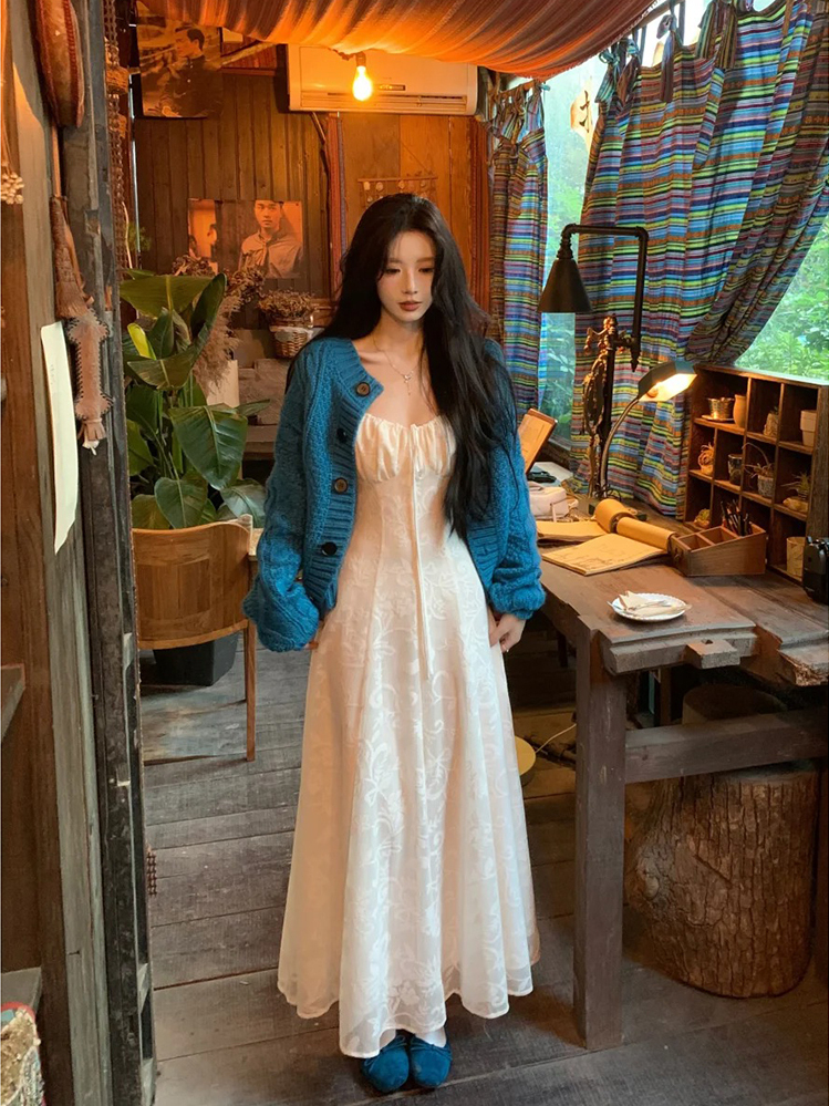 韓系氣質套裝 | 克萊因藍針織開衫外套+吊帶米白洋裝連衣裙