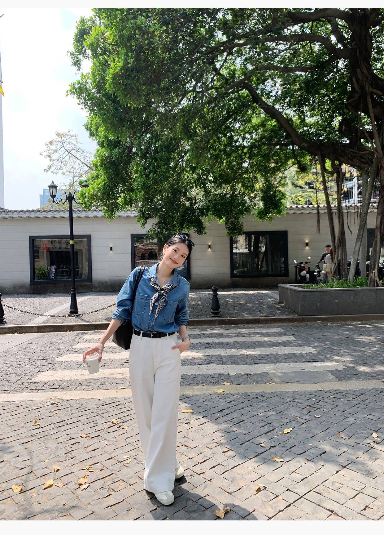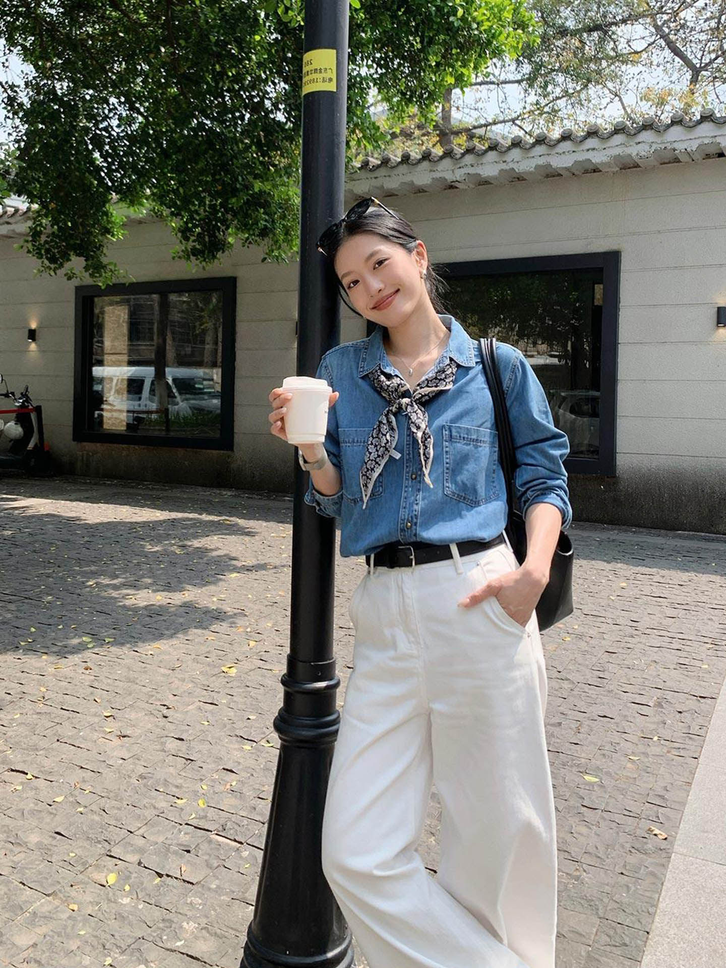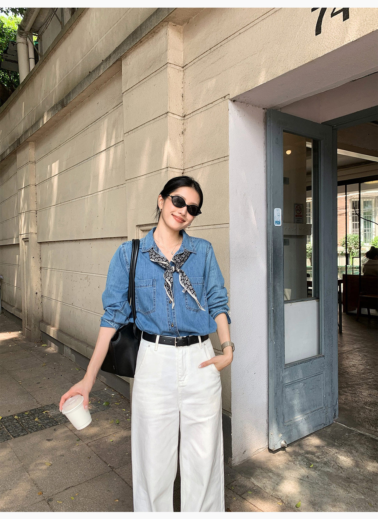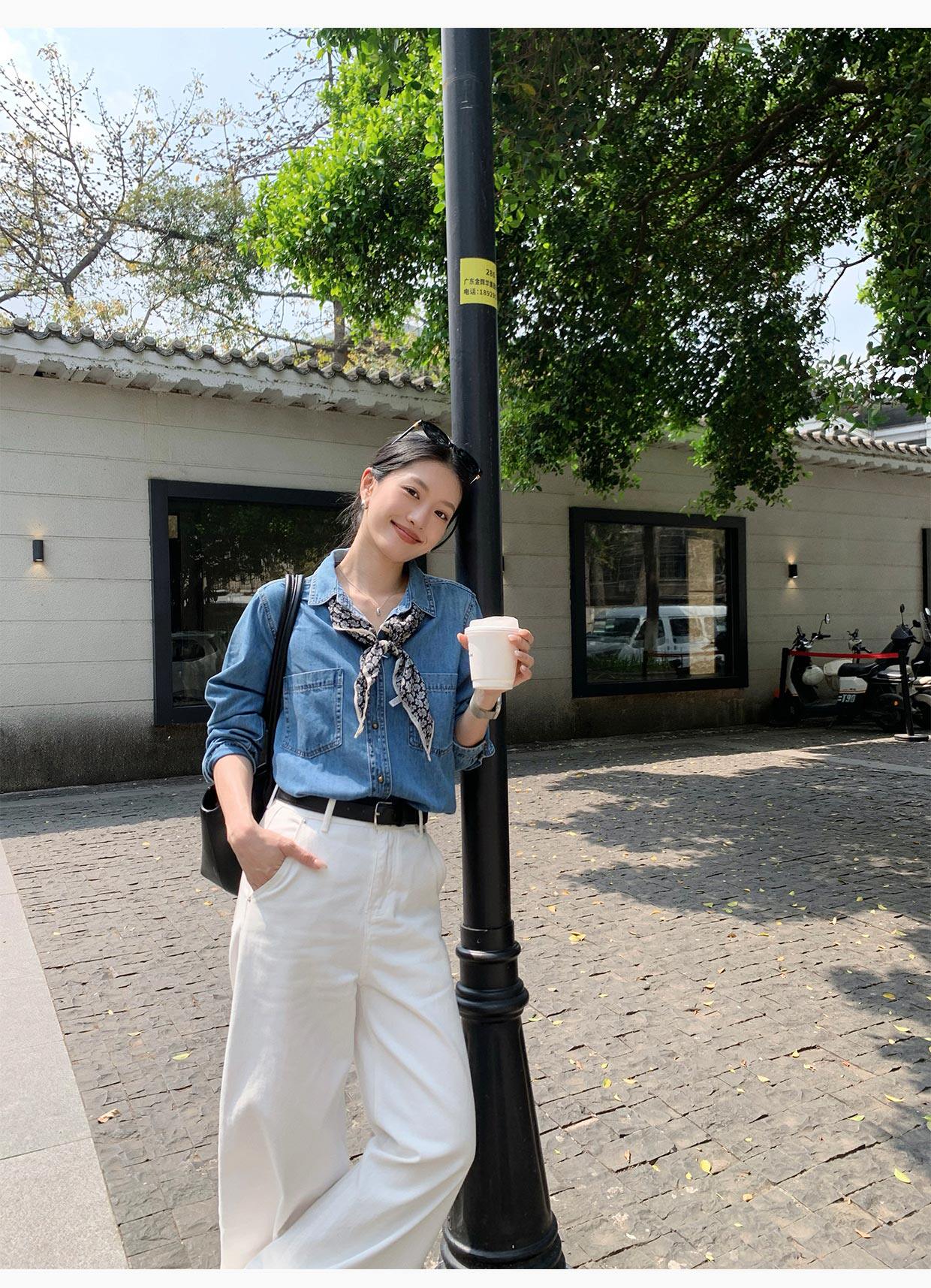 薄款春季休閒牛仔套裝 | 藍色天絲牛仔上衣 【贈絲巾】| 白色闊腿牛仔褲