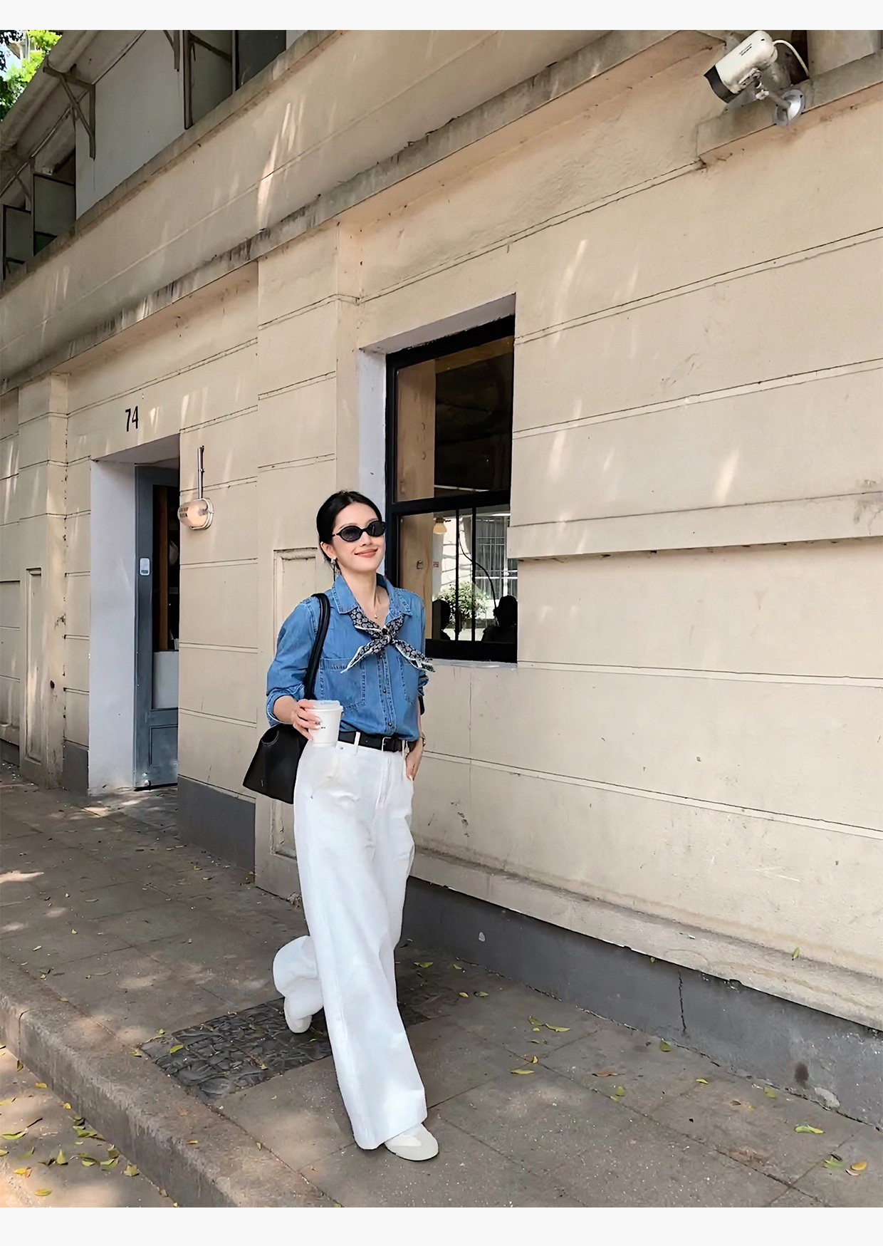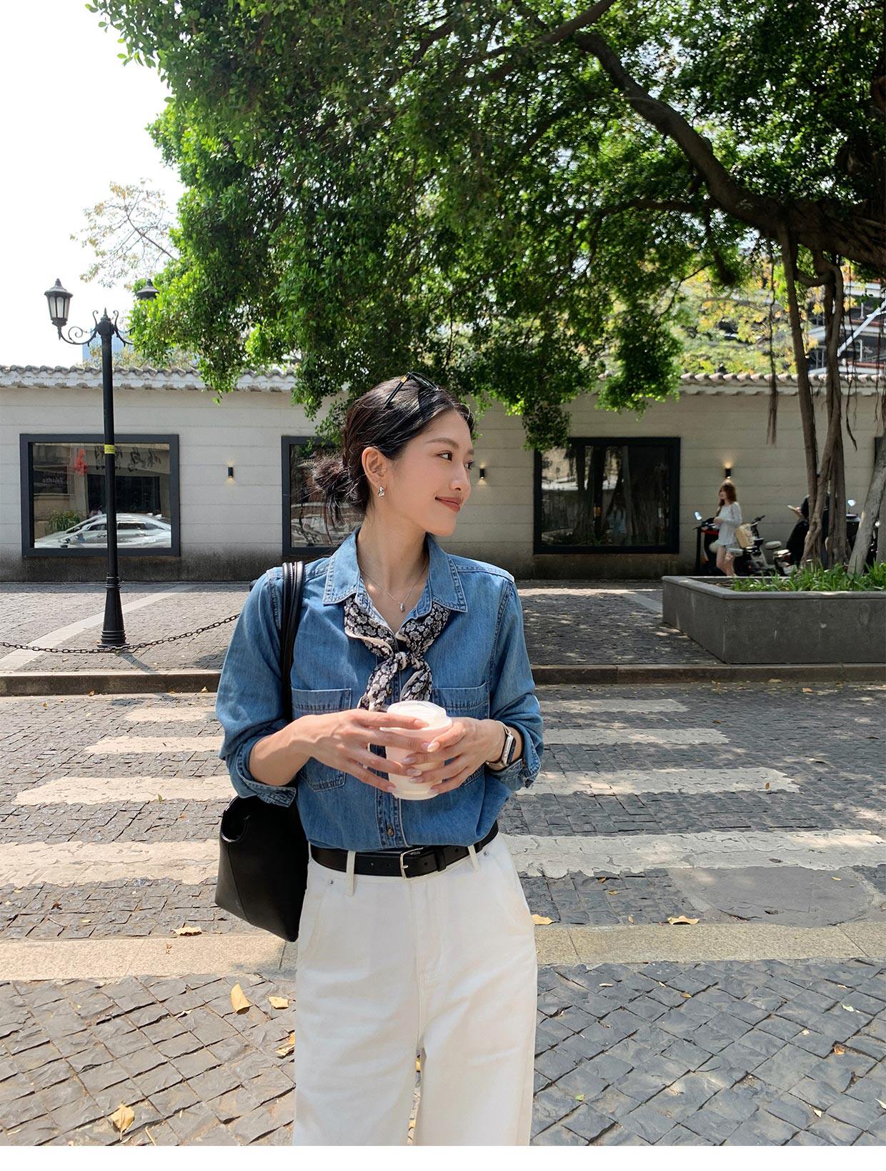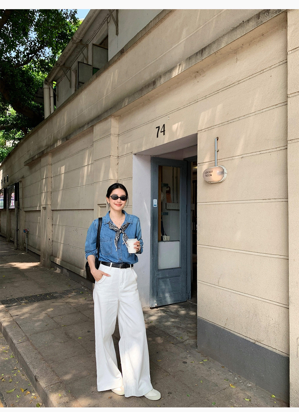 薄款春季休閒牛仔套裝 | 藍色天絲牛仔上衣 【贈絲巾】| 白色闊腿牛仔褲
