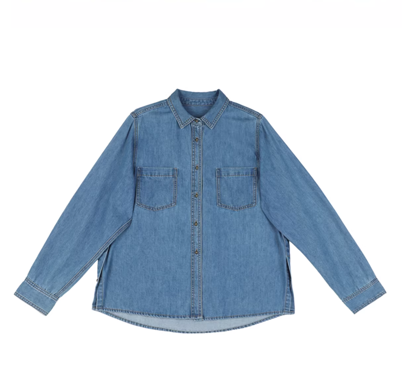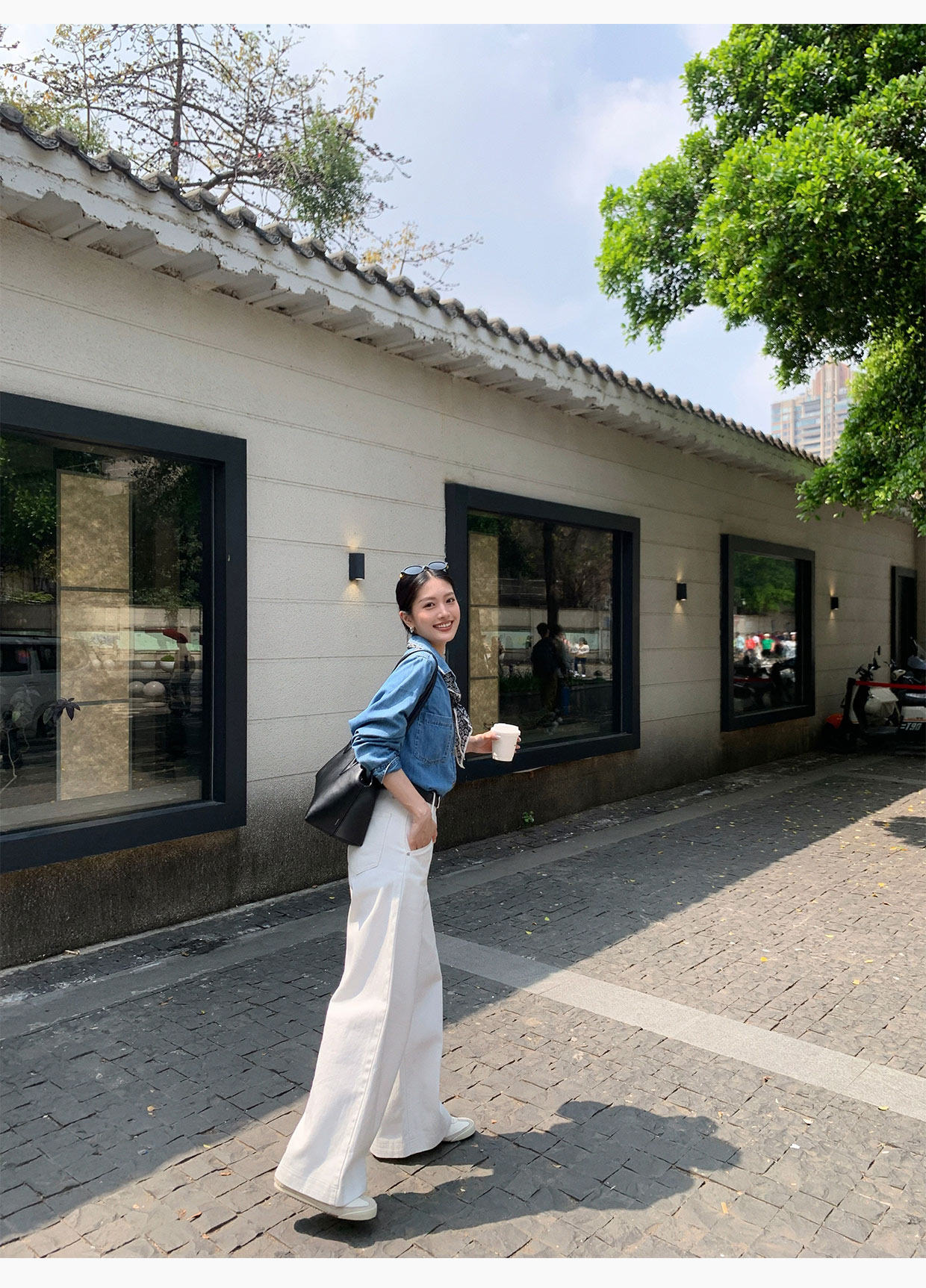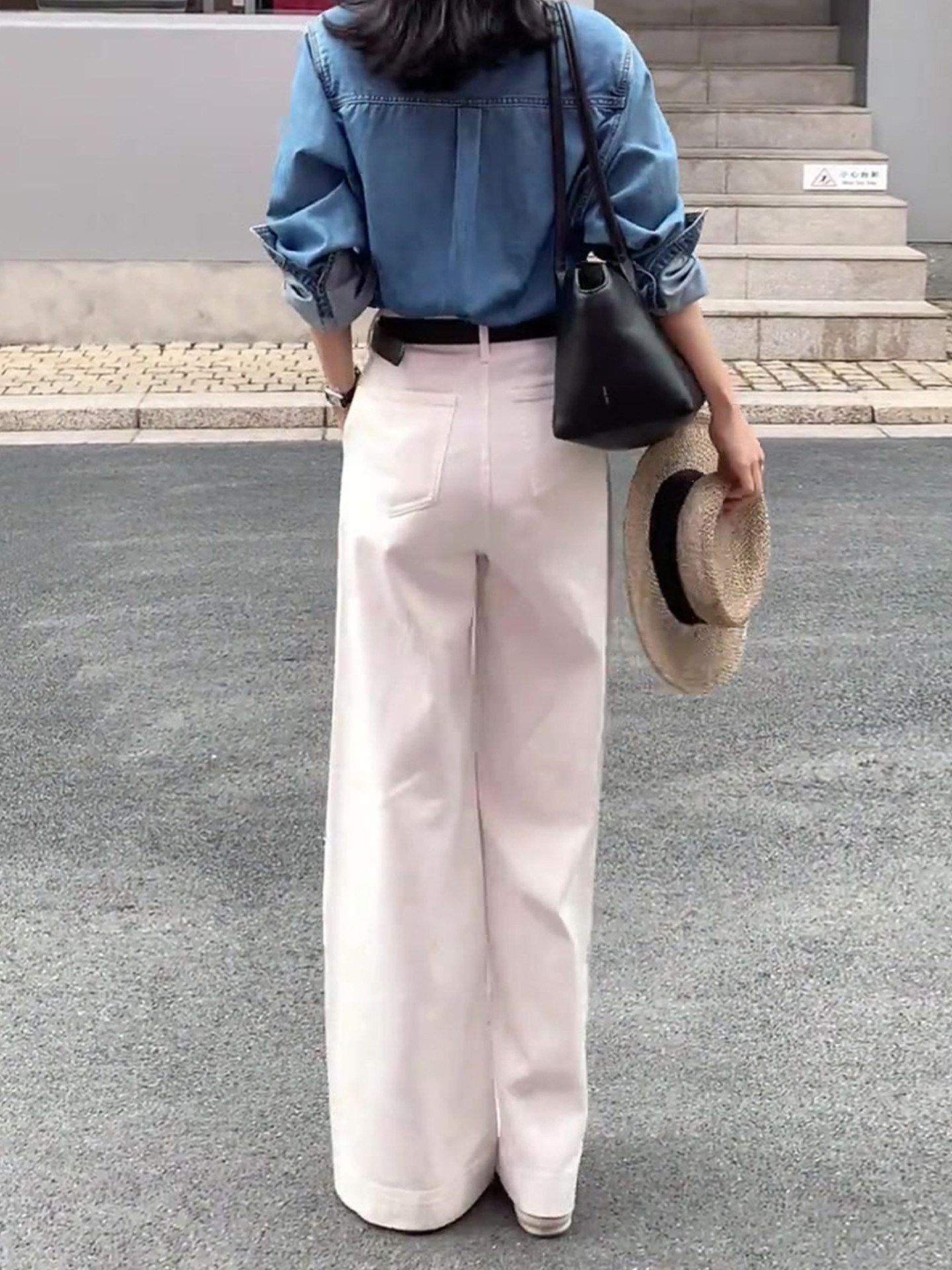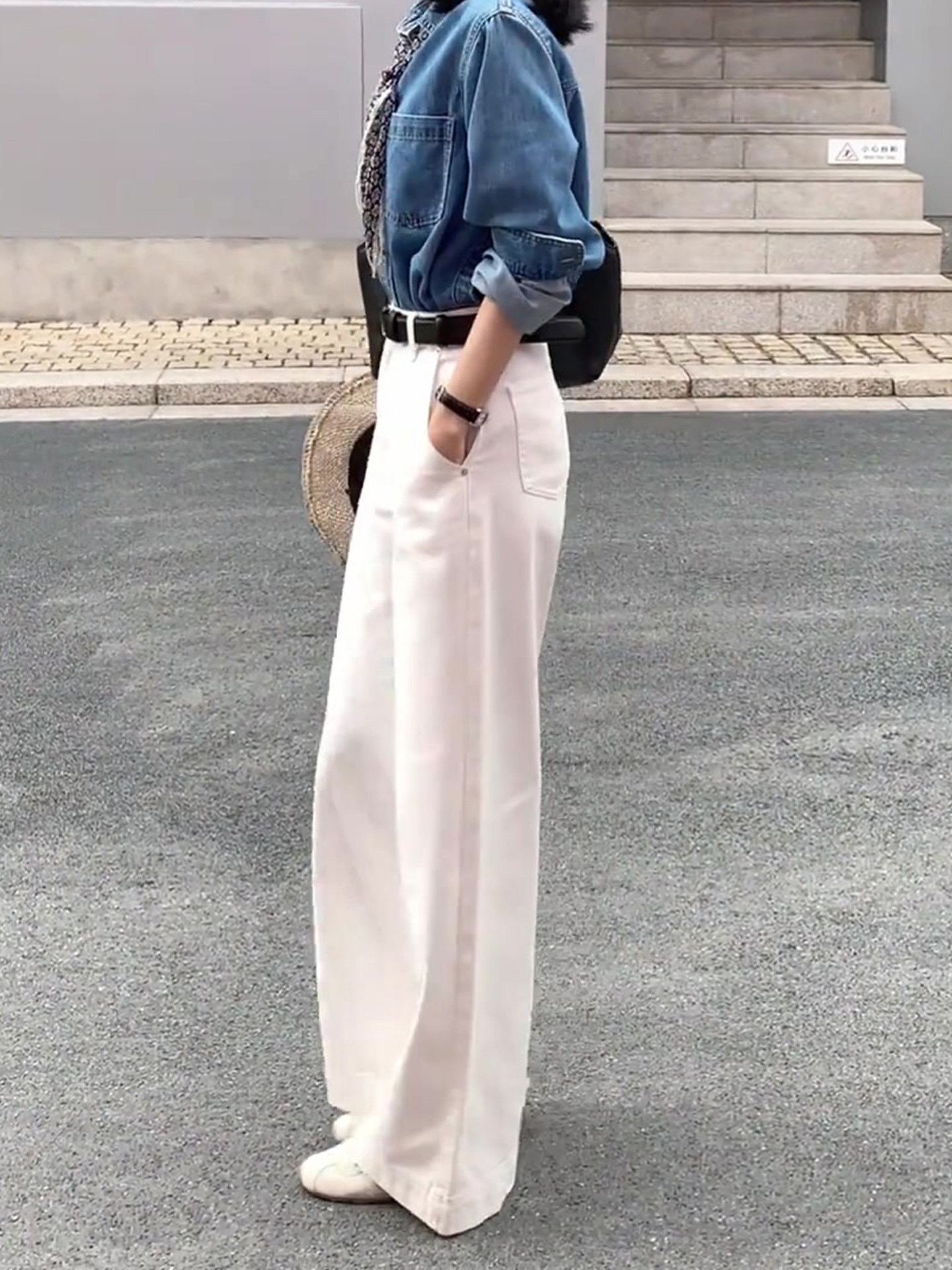 薄款春季休閒牛仔套裝 | 藍色天絲牛仔上衣 【贈絲巾】| 白色闊腿牛仔褲