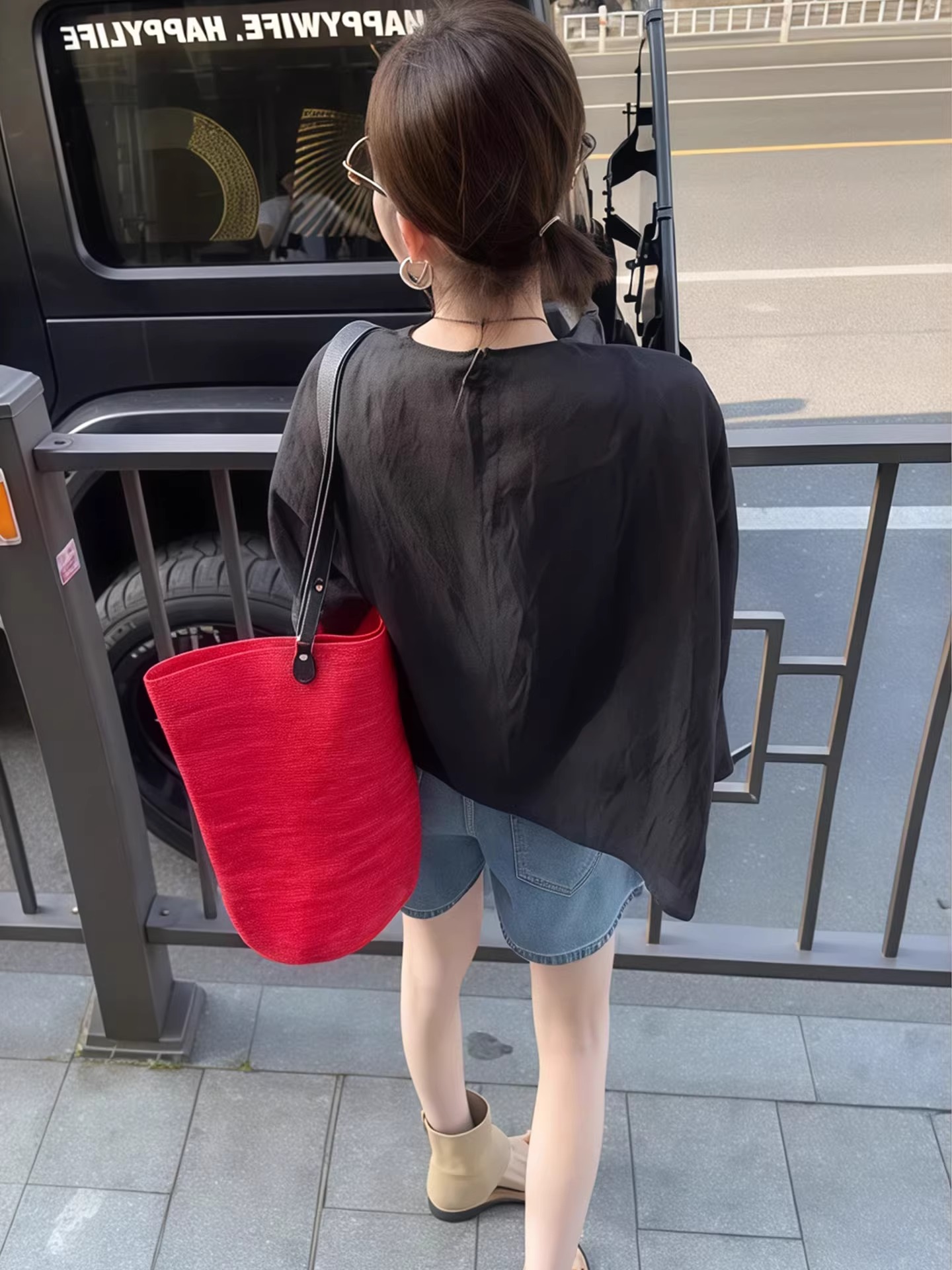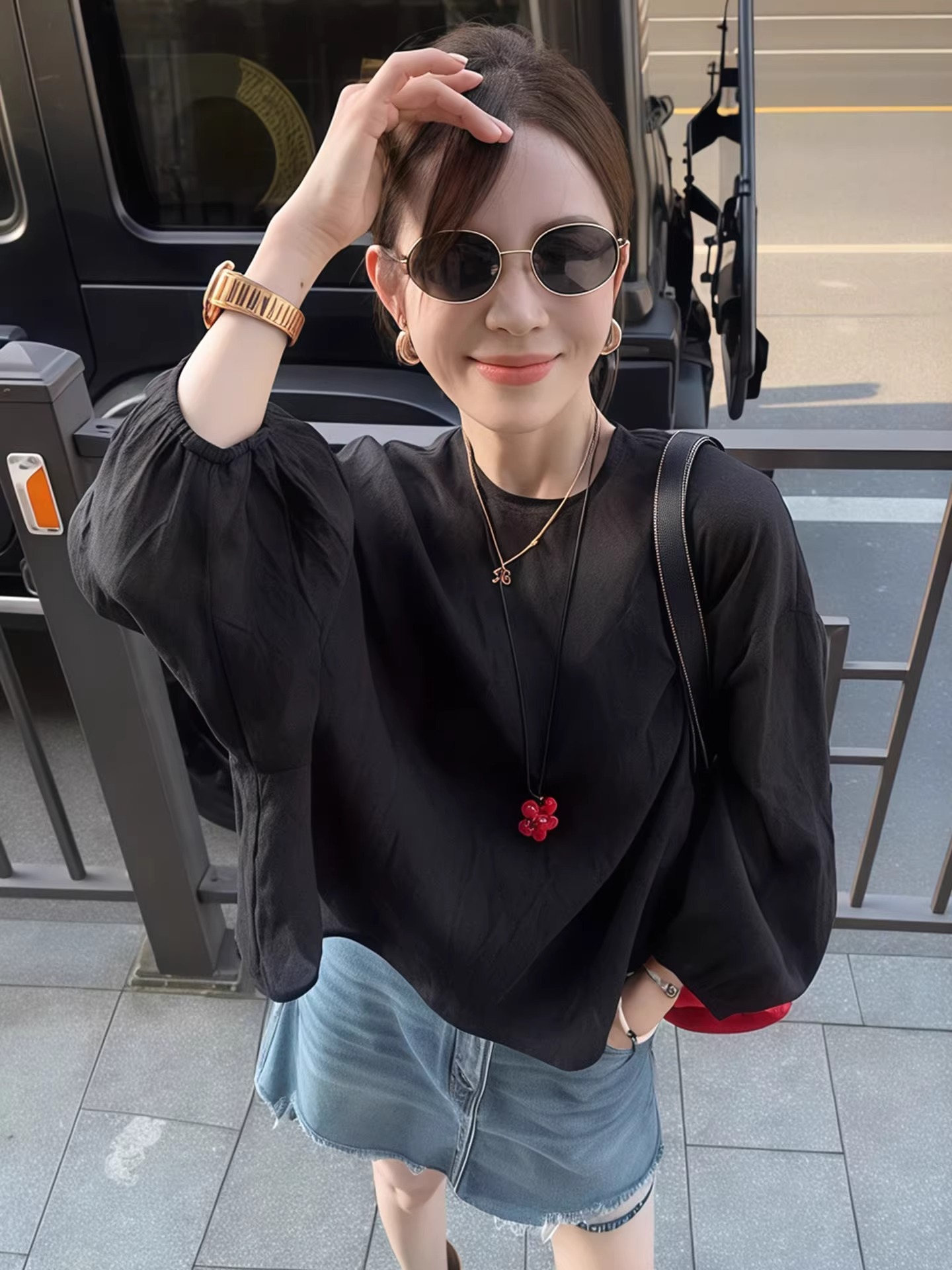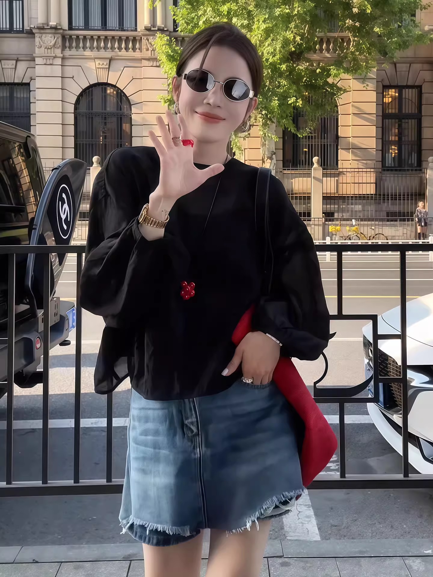 時尚休閒風 | 黑色皺感長袖罩衫 | 小眾設計款高腰牛仔短裙褲 | 不規則裁剪