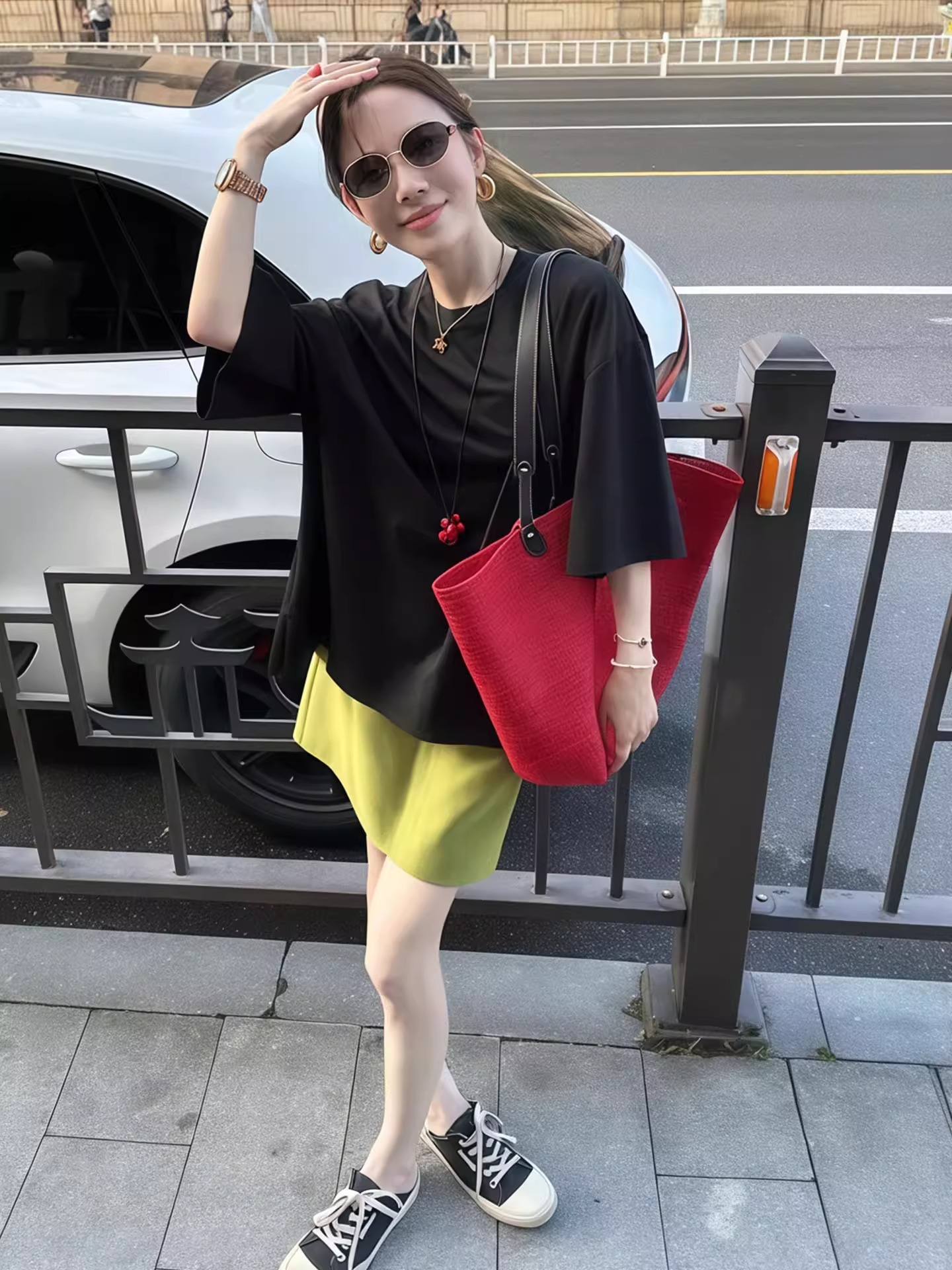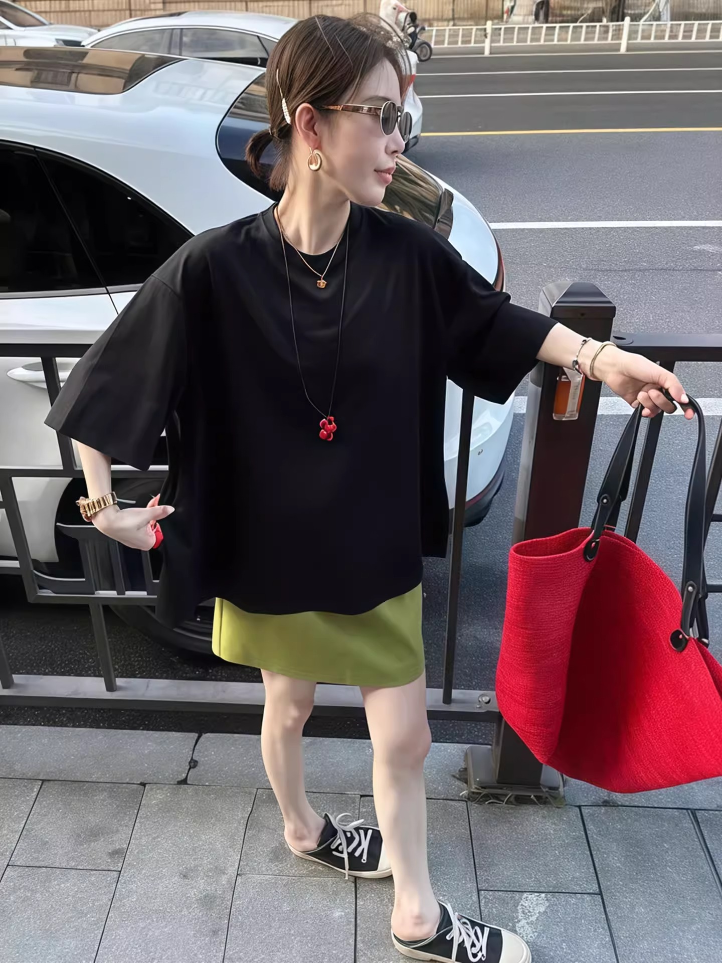 夏季高級感套裝|黑色T恤+淡綠A字裙|慵懶風兩件式|顯瘦設計
