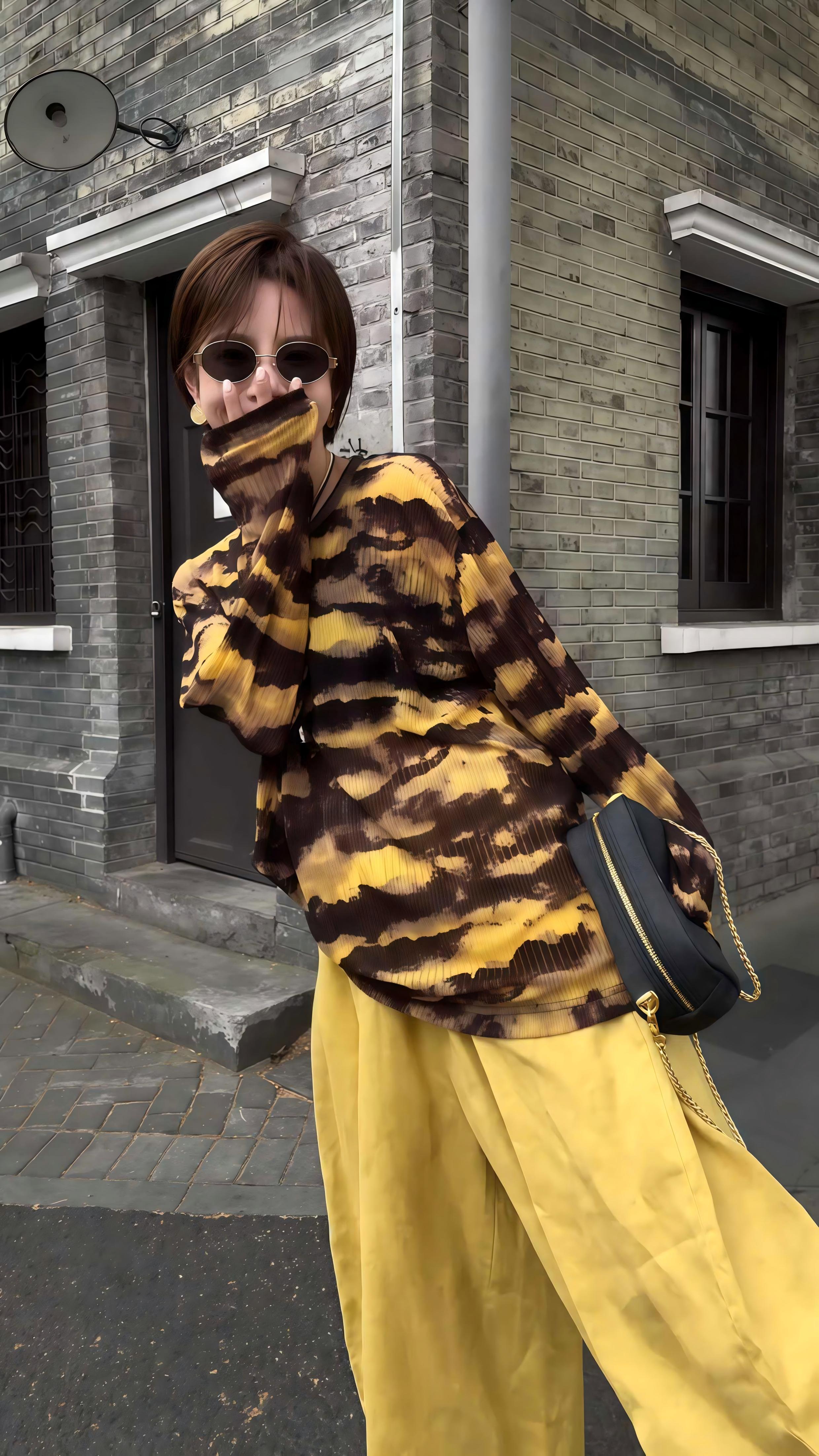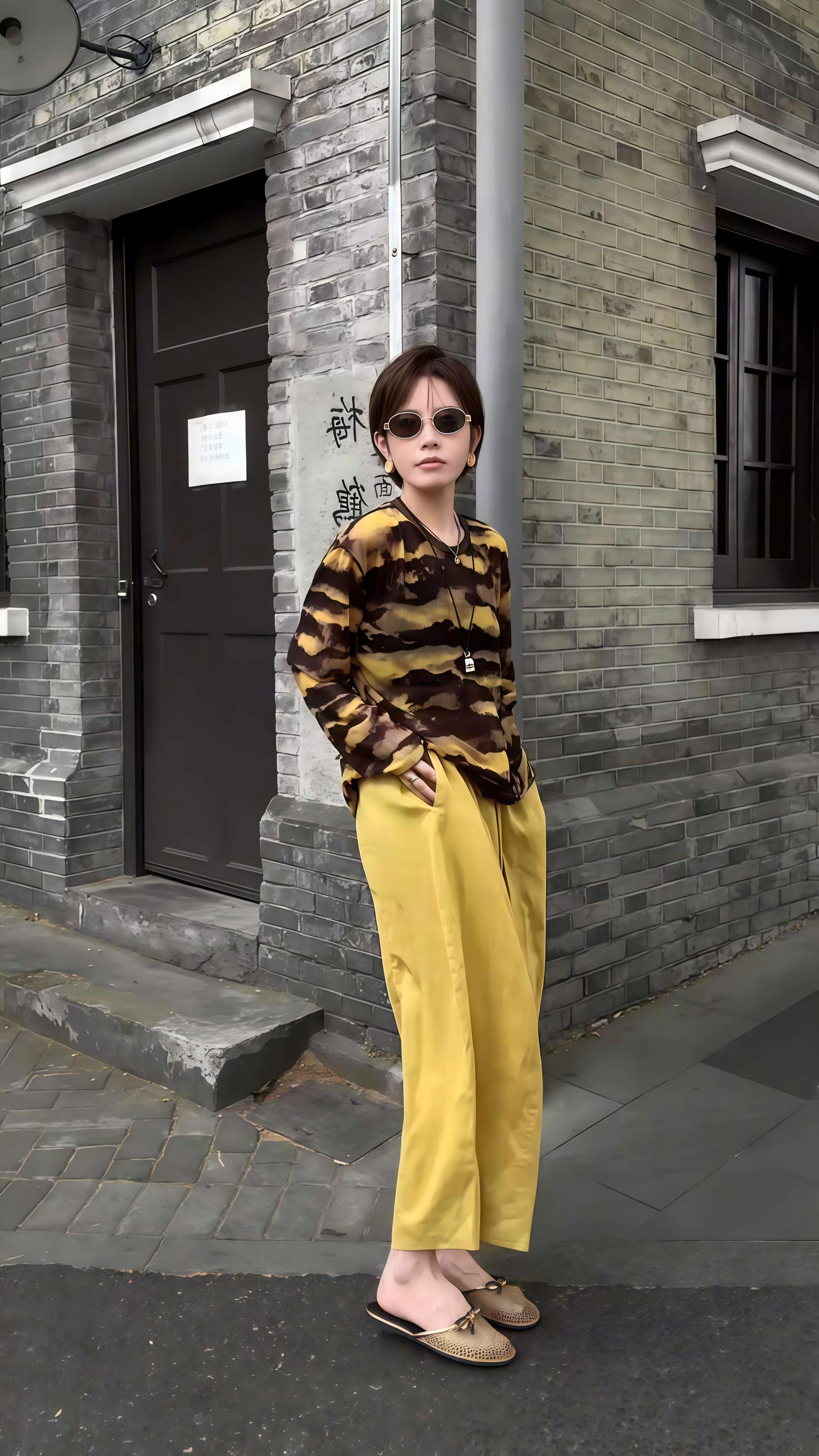 早秋亮黃套裝|黃咖紋長袖罩紗薄款+黃色高腰九分褲|慵懶風兩件式|鬆緊帶設計