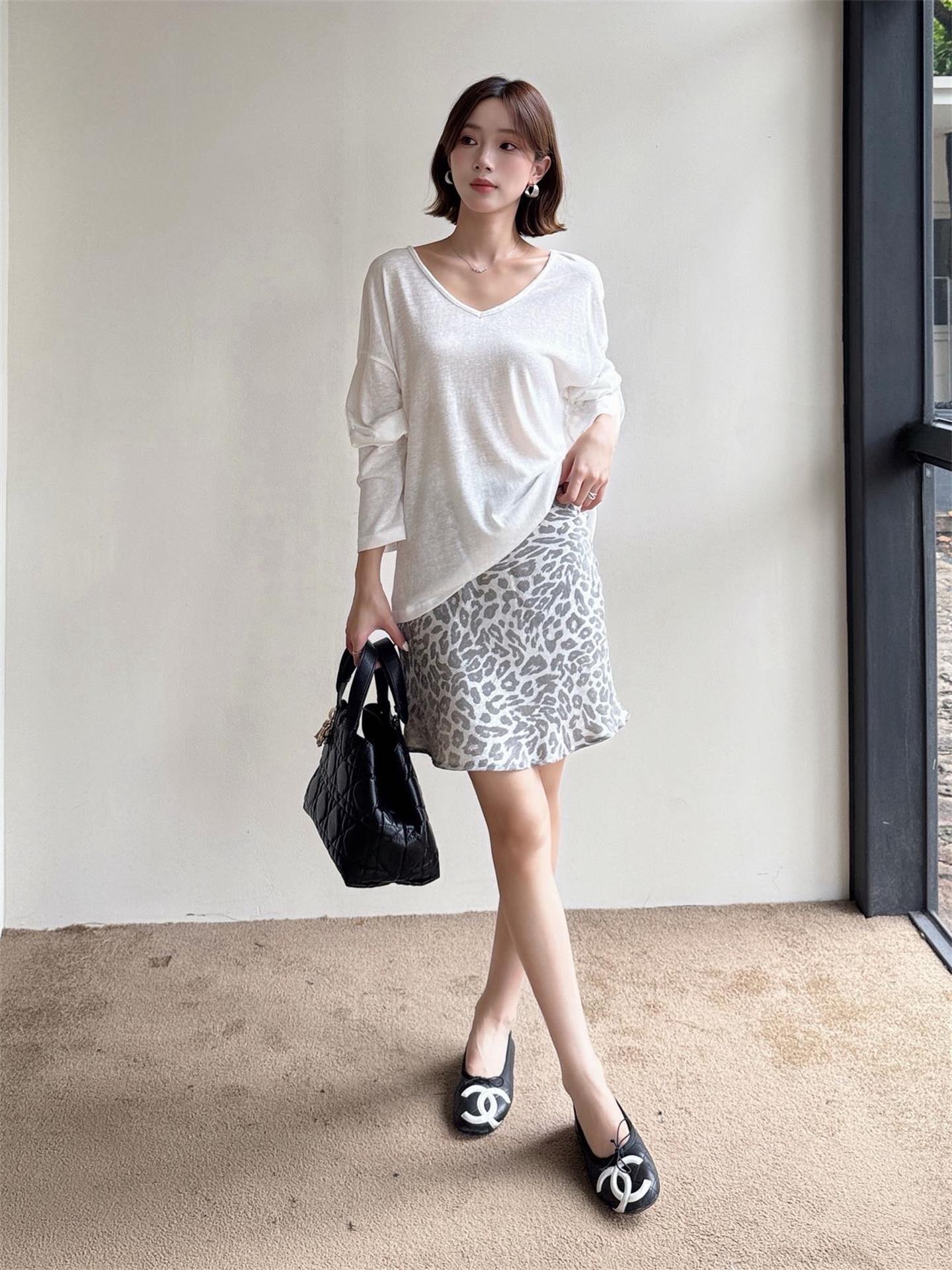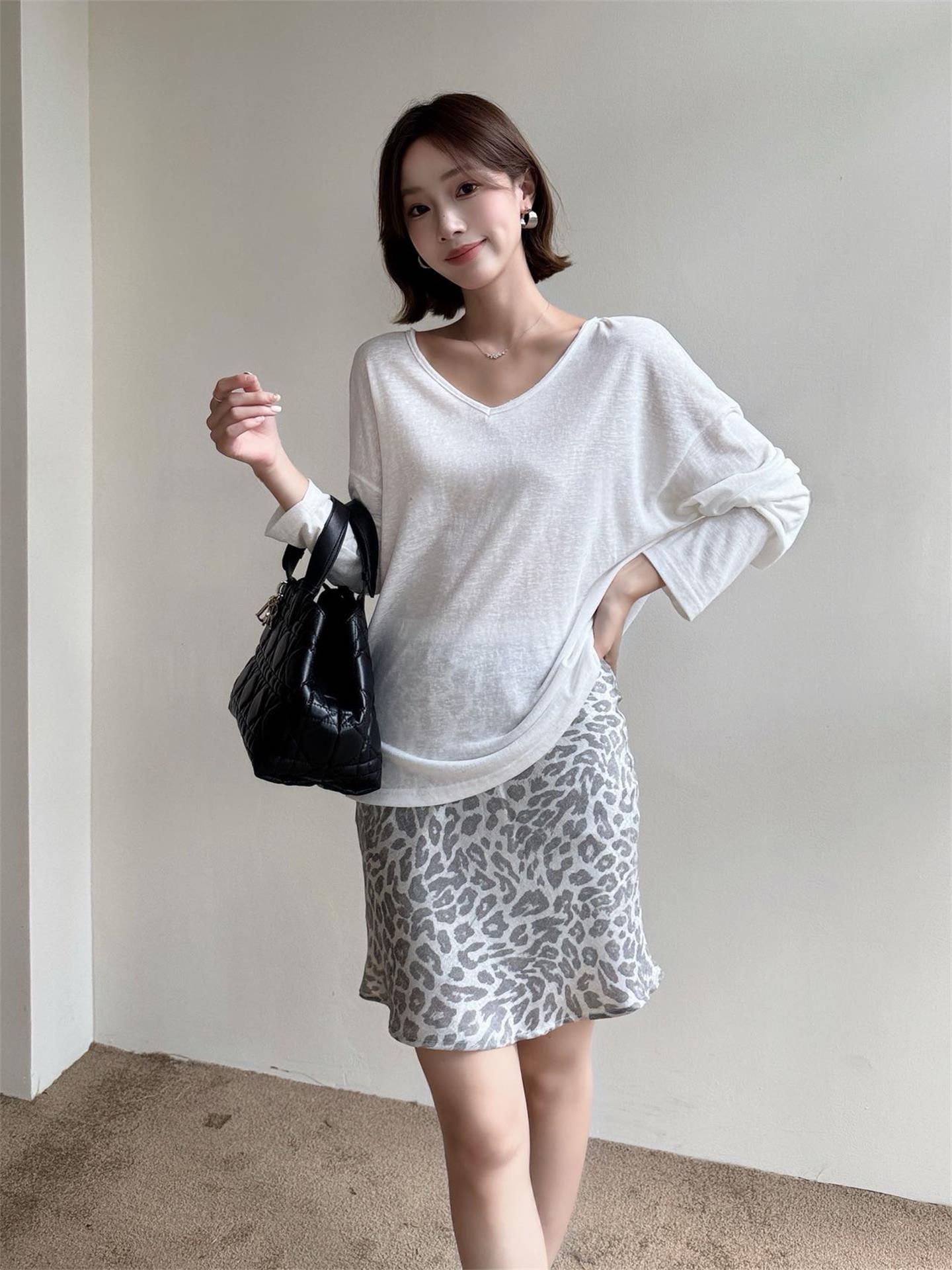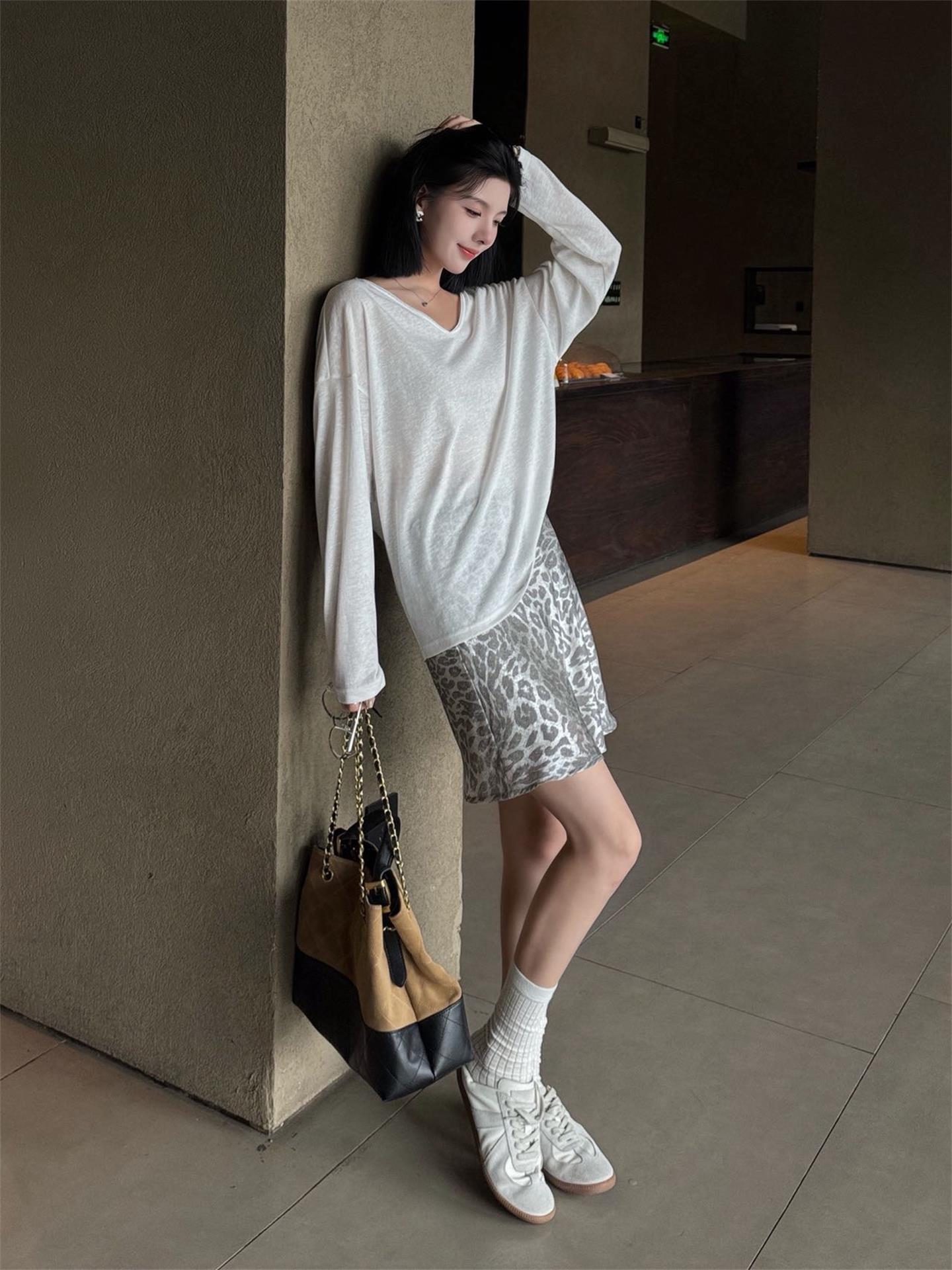 秋季鏤空罩衫套裝|白色後背鏤空罩衫長袖 | 銀灰色豹紋裙|顯瘦兩件式