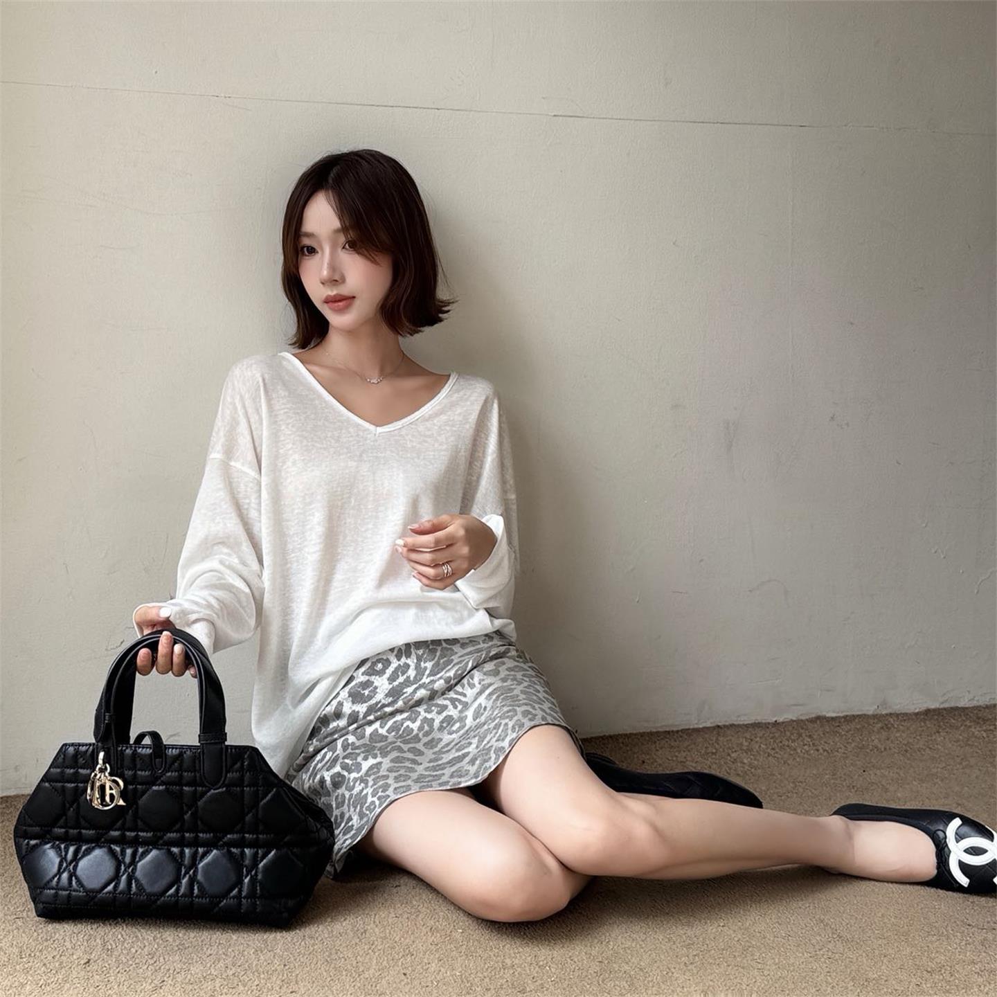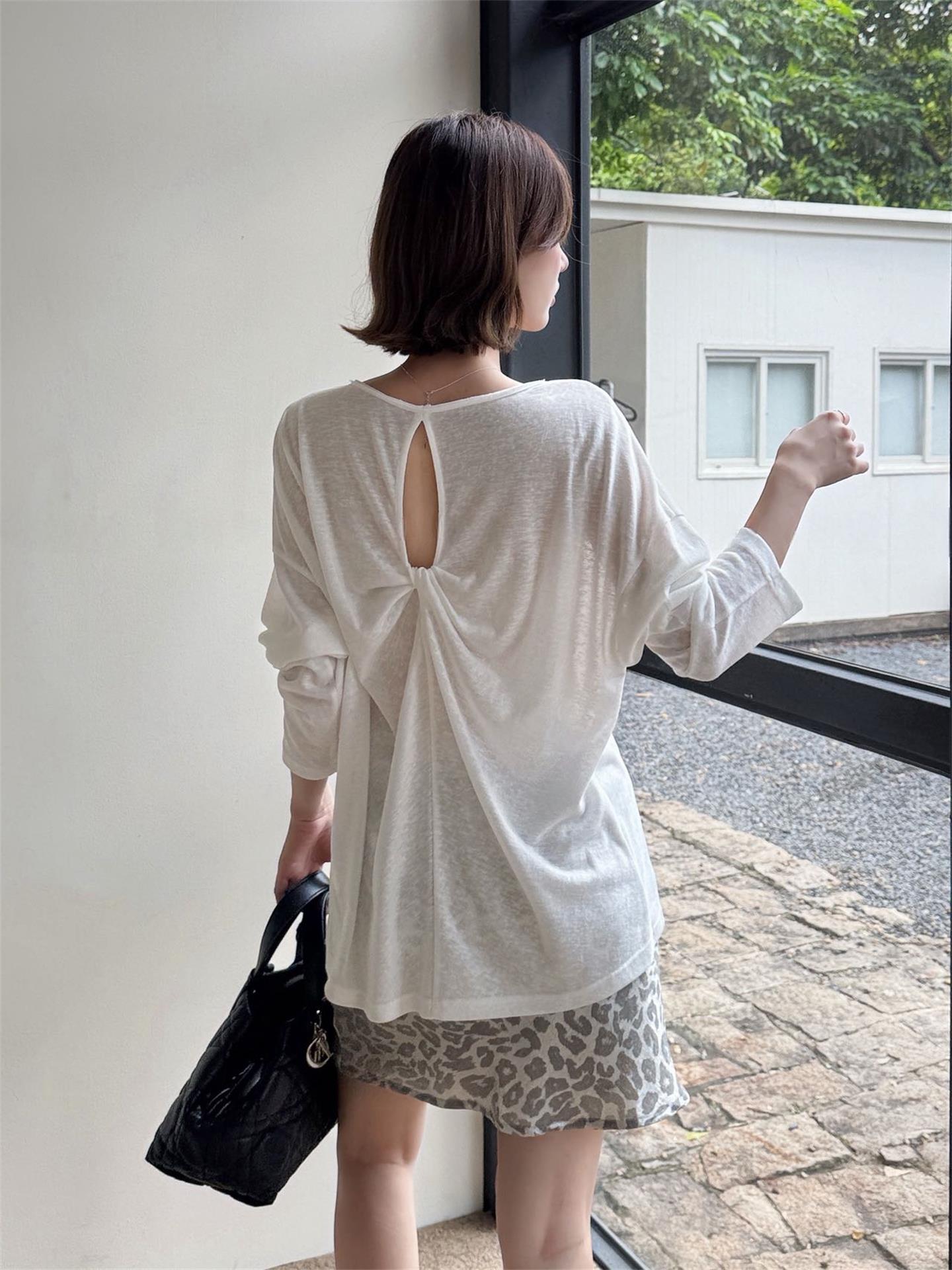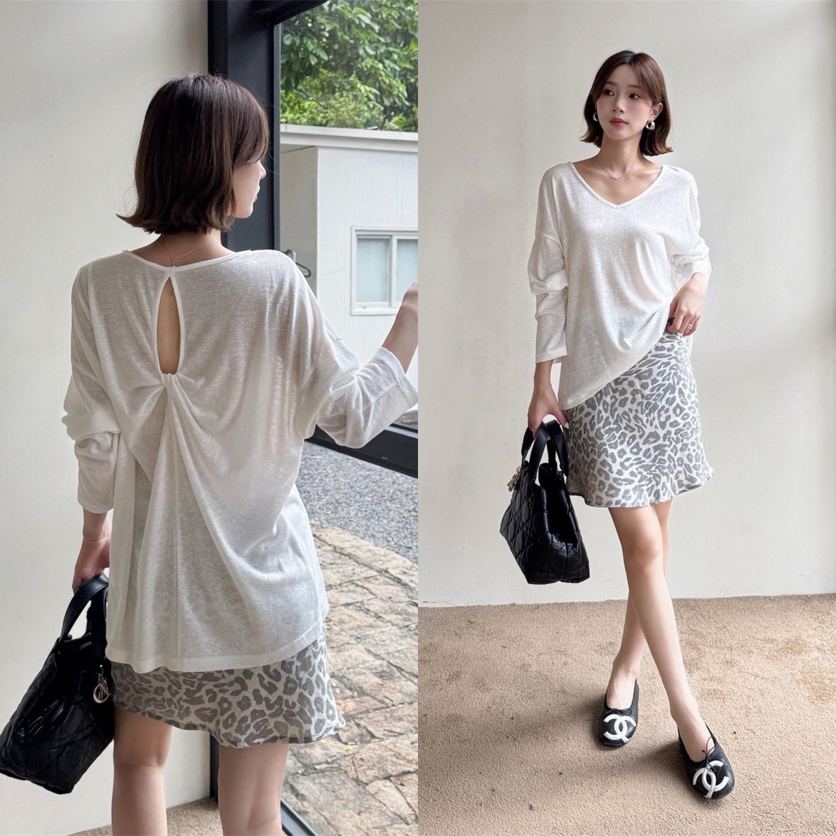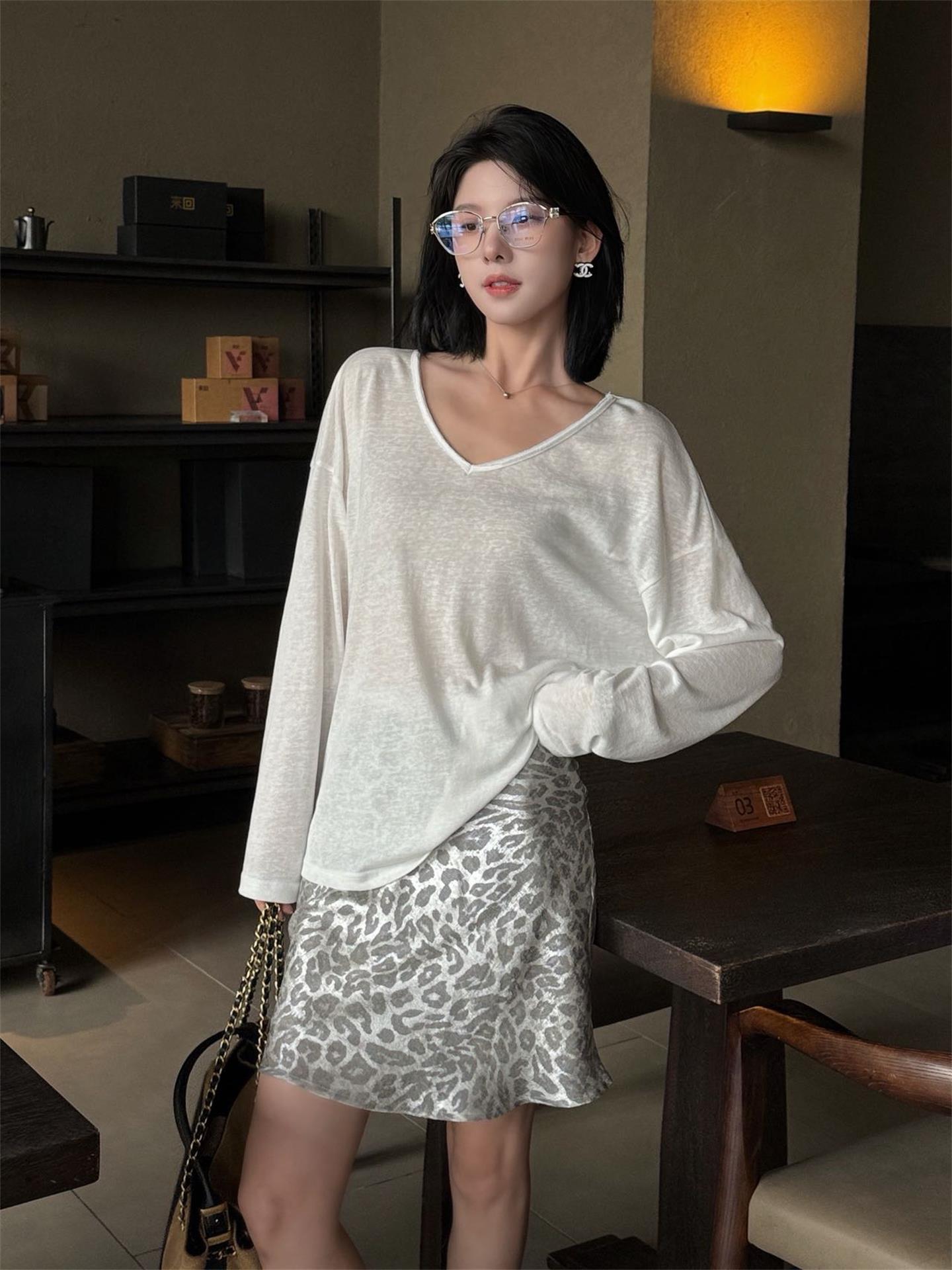 秋季鏤空罩衫套裝|白色後背鏤空罩衫長袖 | 銀灰色豹紋裙|顯瘦兩件式