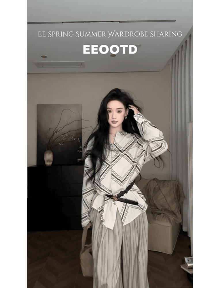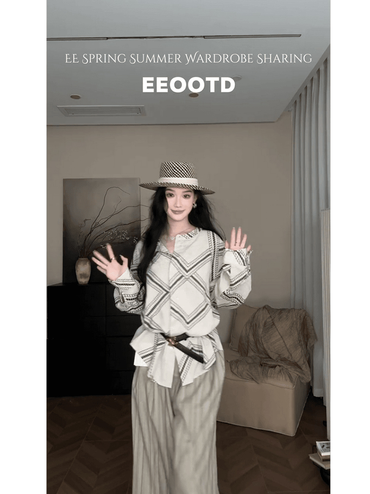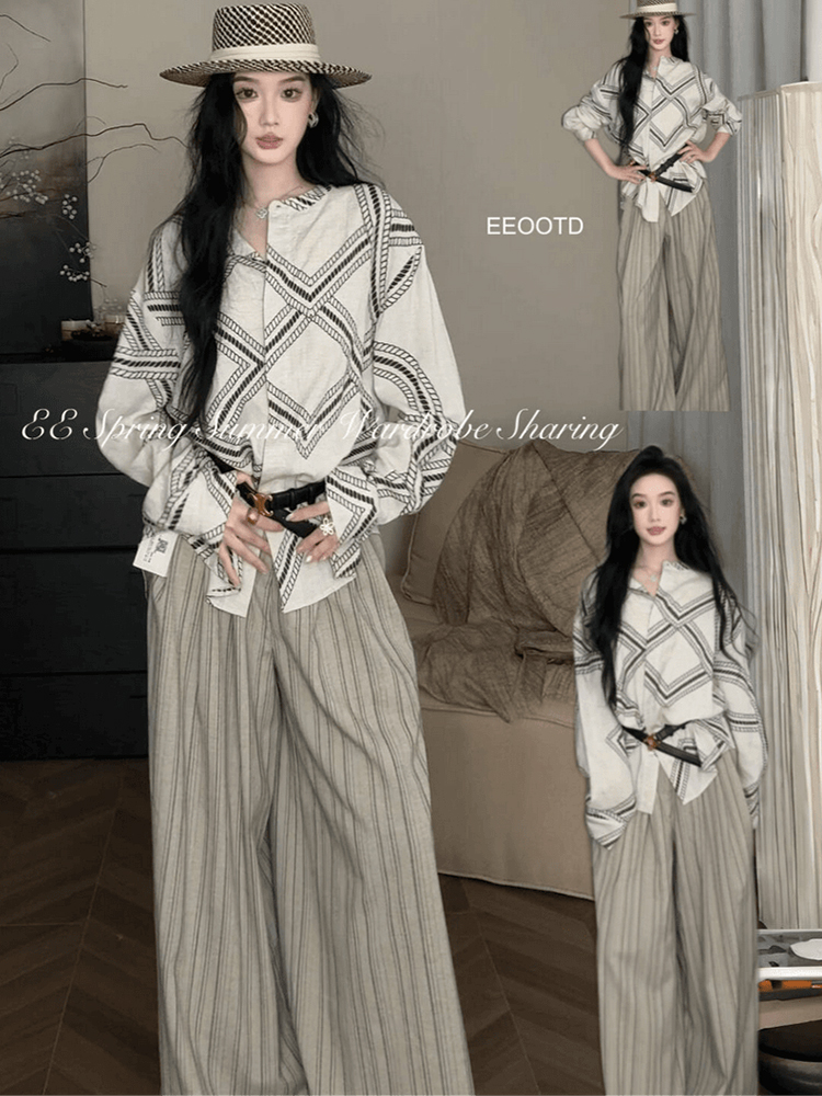 復古圖騰印花襯衫 + 條紋休閒褲 | 低調奢華兩件套 | 質感通勤穿搭