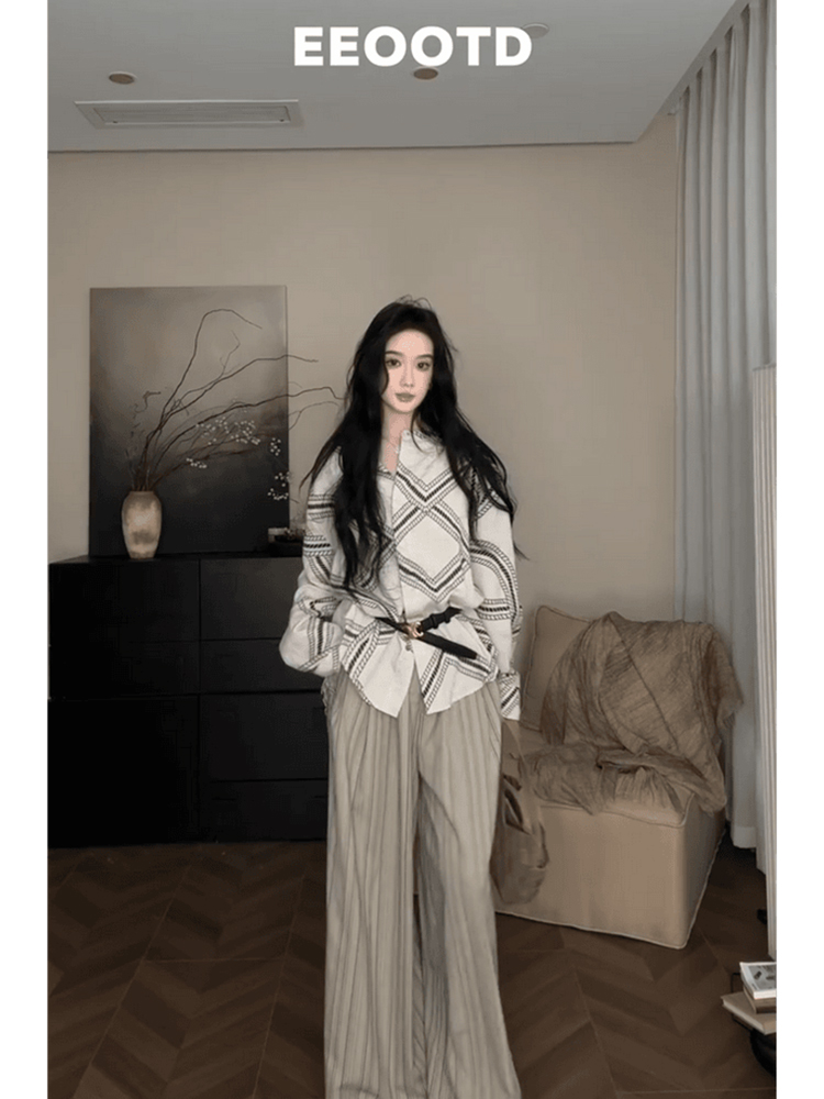 秋冬季休閒時尚套組|黑色&白色長袖毛衣|灰色&黑色寬鬆直筒長褲|免搭配日常穿搭簡約兩件套