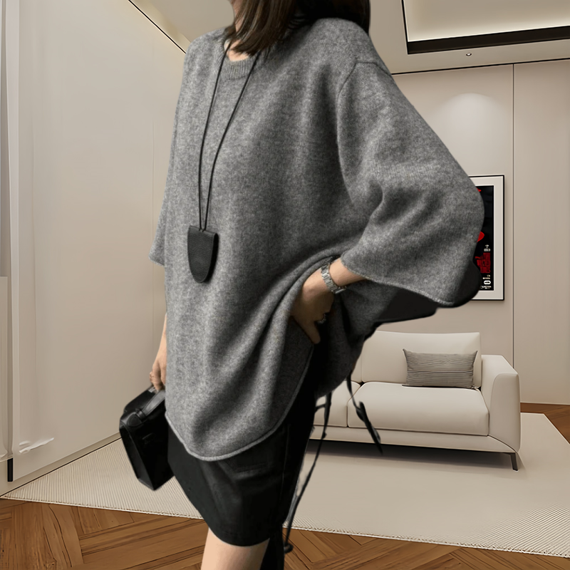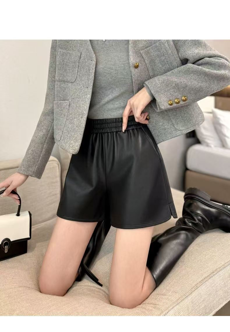 【現貨】慵懶風春秋兩件套 五分袖針織衫女 外穿高腰顯瘦皮短褲 純色毛衣黑色皮褲