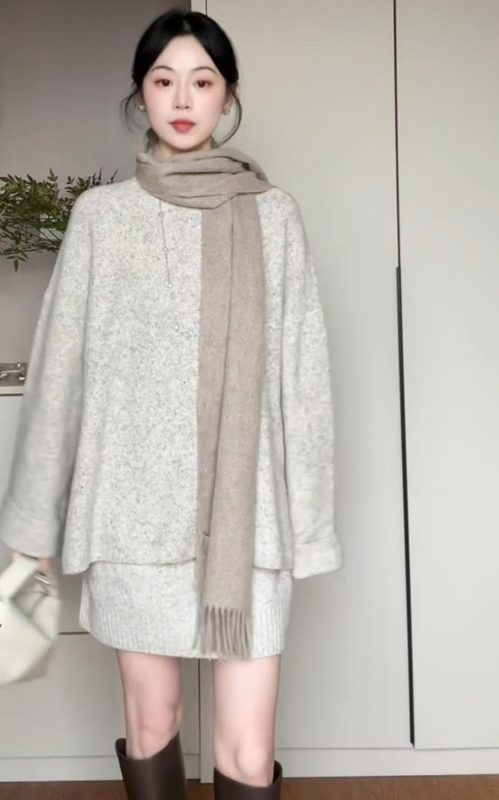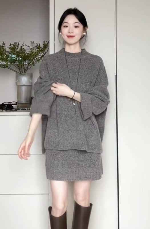 韓系針織上衣+半裙 灰色/杏色套裝 淑女名媛穿搭 輕熟風