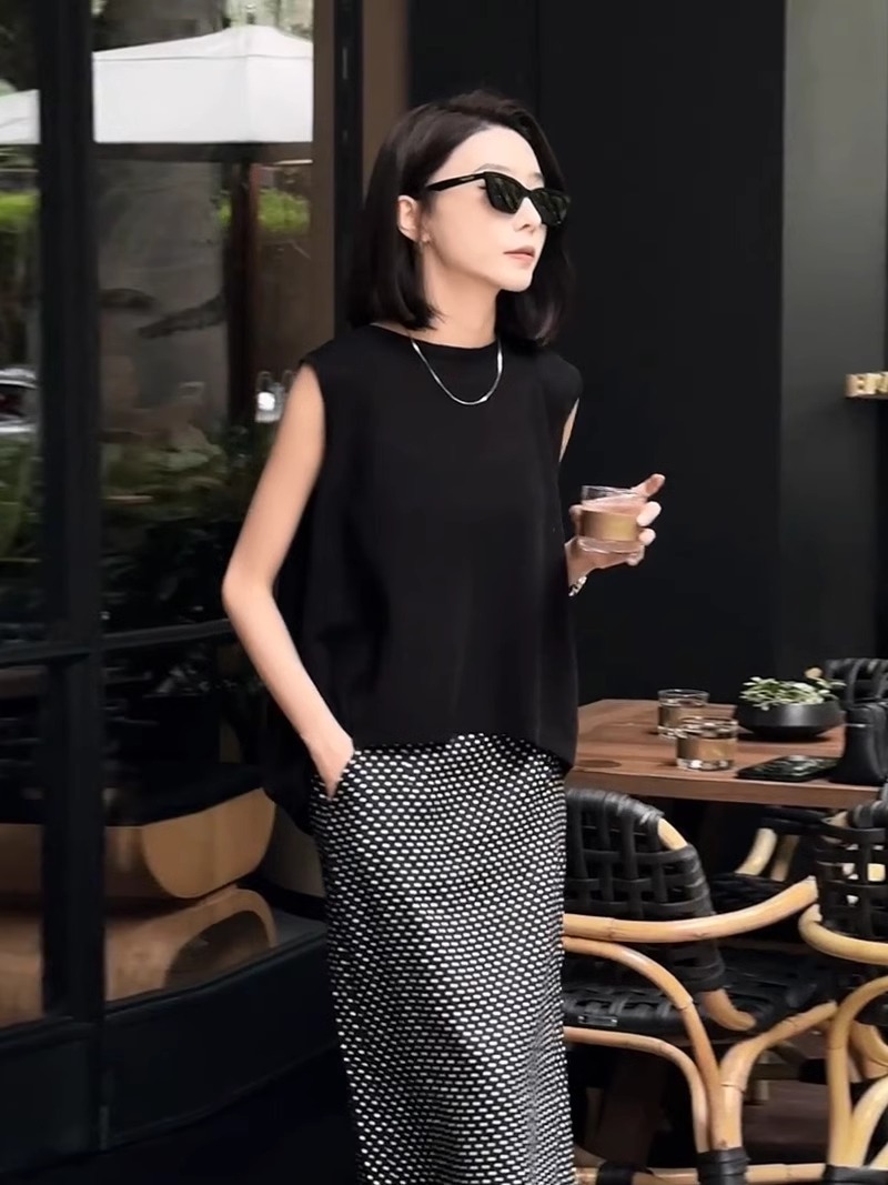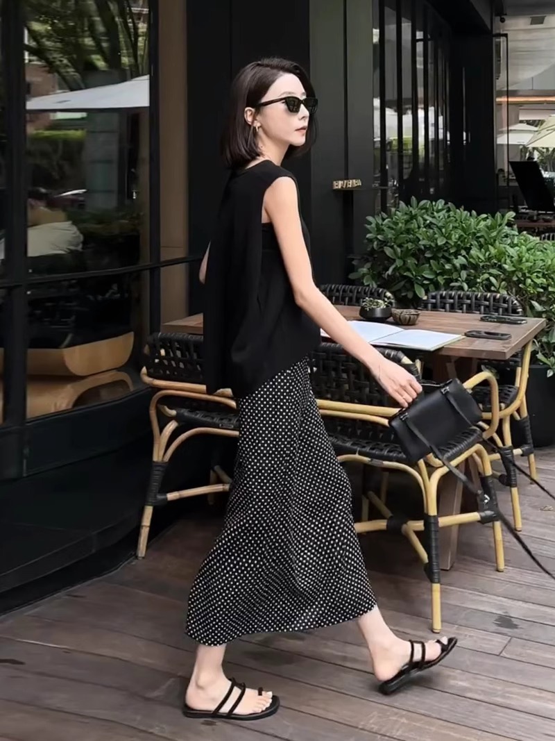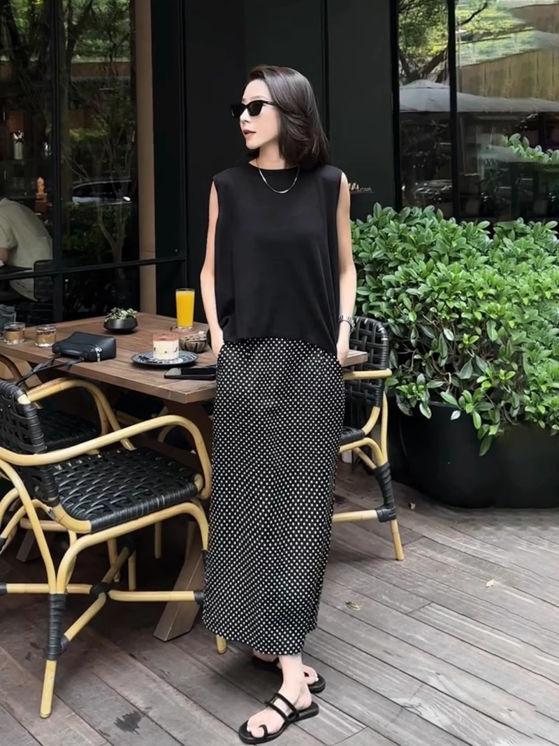 不規則下擺 黑色無袖上衣 | 開叉波點半鬆緊半裙 | 鹽系輕熟套裝
